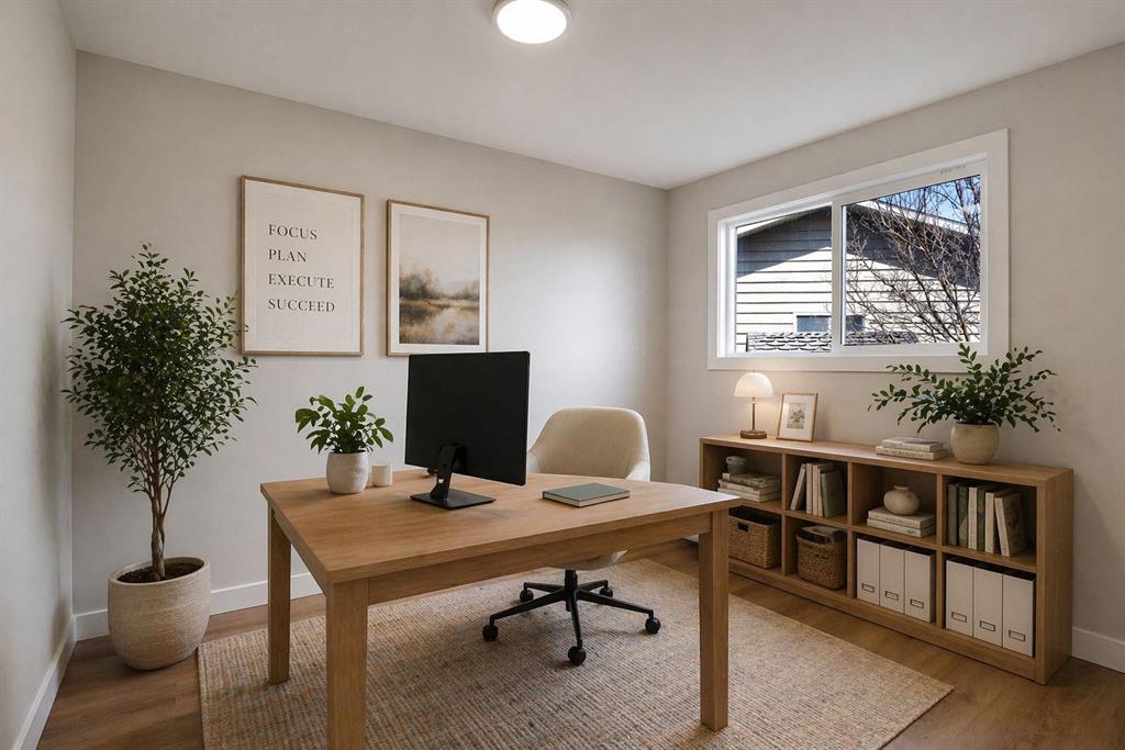 The main floor spans over 800 sq ft and showcases a bright, open concept layout featuring a spacious living room, dining area, and a chef inspired kitchen anchored by an impressive 10′ × 5′ island with abundant storage. The adjacent family room blends modern comfort with timeless character, highlighted by a refreshed original brick feature wall. South and west facing windows flood the home with natural light throughout the day.
