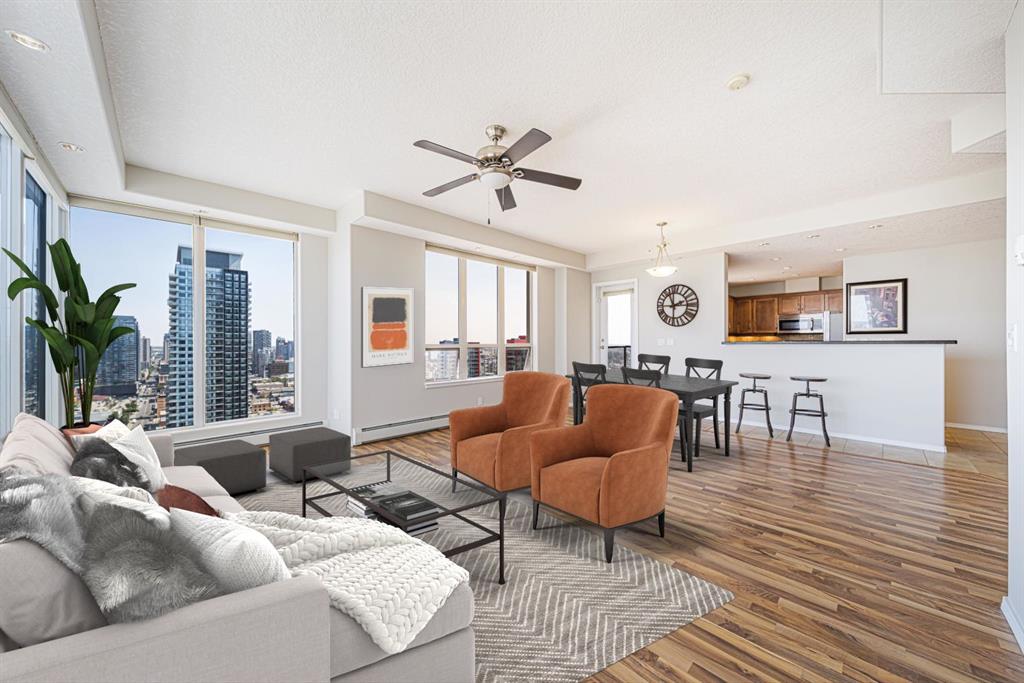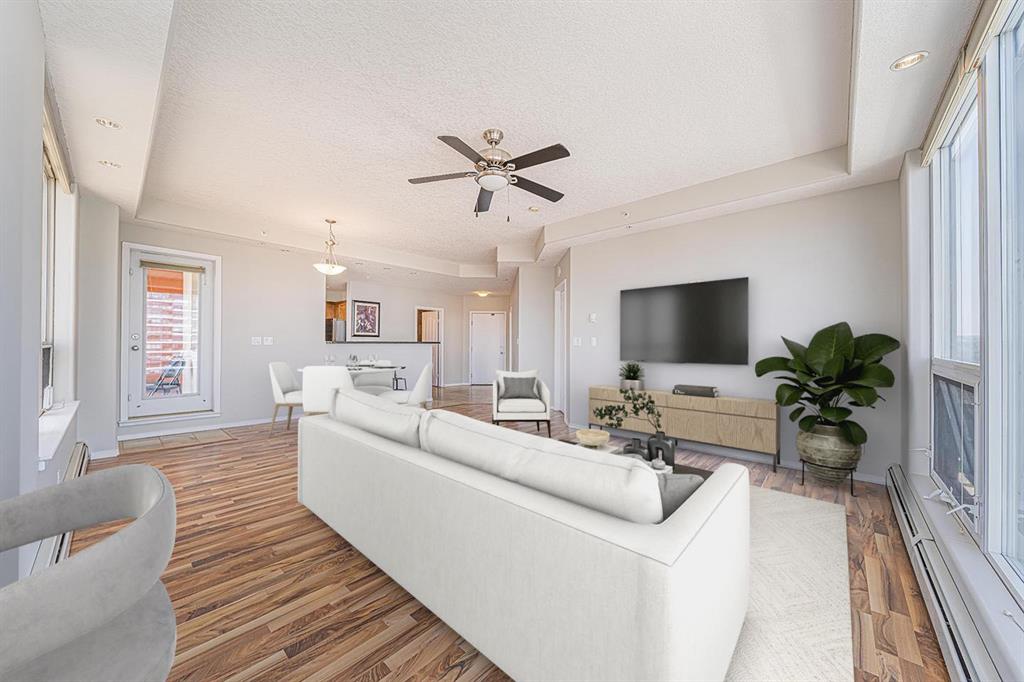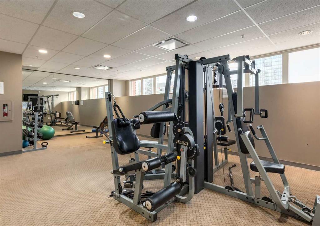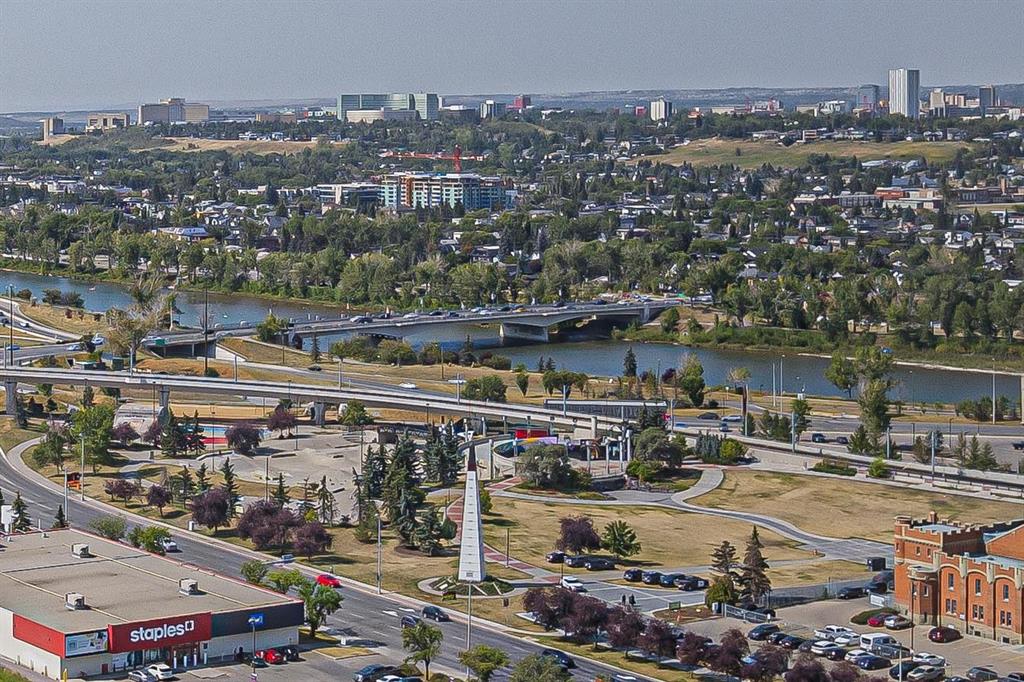 Fall in love with this stunning top-floor corner unit, offering breathtaking city views! This bright, sunny apartment features high ceilings, floor-to-ceiling windows, and a unique design. The open-concept living space is ideal for gatherings with a large kitchen, granite countertops, and a breakfast bar. Enjoy a spacious balcony with a gas outlet for barbecues, and forget gym memberships with a fully equipped on-site gym. All utilities are included with condo fees, plus heated underground parking and 24/7 security. Located in the heart of the Beltline, just steps from 17th Ave shopping, Co-op Grocery Store, Schools, Medical offices, River walk, City parks and the C train !