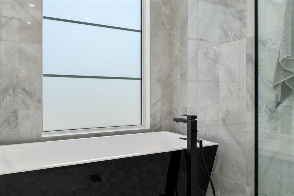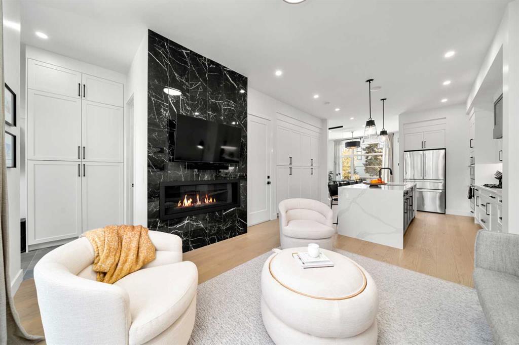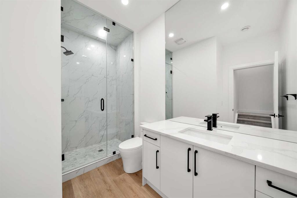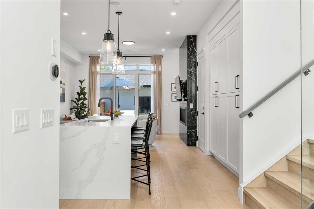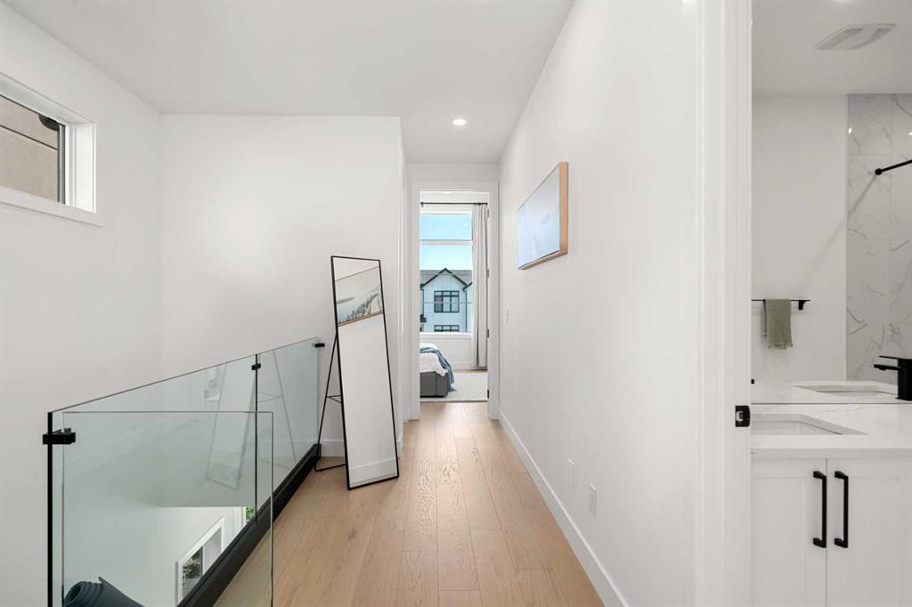 Welcome to 2503 20 Street SW, a beautifully designed semi-detached home in Richmond featuring a full legal basement suite, west-facing backyard, A/C, and high-end finishes throughout, with 4 bedrooms, 4 bathrooms and 1711 sqft. of living space. The main level offers an open floor plan with floor-to-ceiling windows, a cozy gas fireplace in the living room, and a chef’s kitchen with engineered hardwood flooring throughout. And as a bonus, extra storage and cupboard space in your kitchen. Sleek glass panel banisters lead upstairs, where you’ll find laundry, 3 spacious bedrooms, and a stunning primary ensuite highlighted by a luxurious wet-room design with a deep soaker tub set beside a frosted window, all within a large walk-in shower, plus dual vanities.