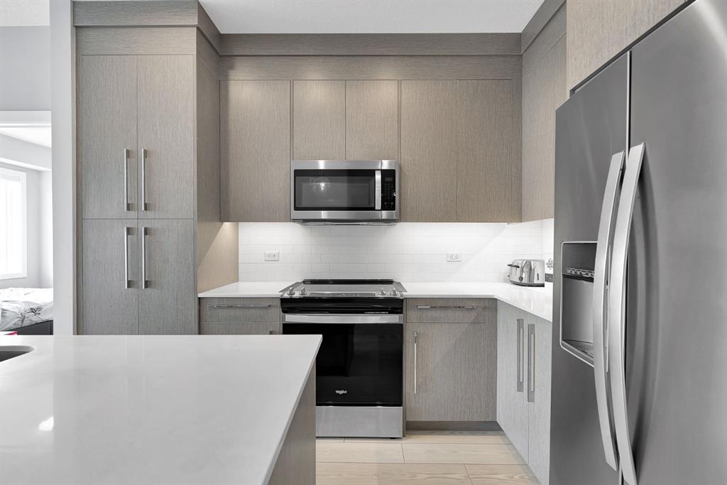The modern kitchen is both stylish and functional, featuring sleek quartz countertops, stainless steel appliances, and ample cabinetry, perfectly designed for everyday living and hosting alike.