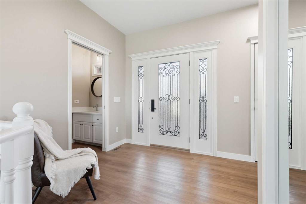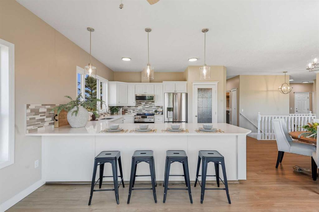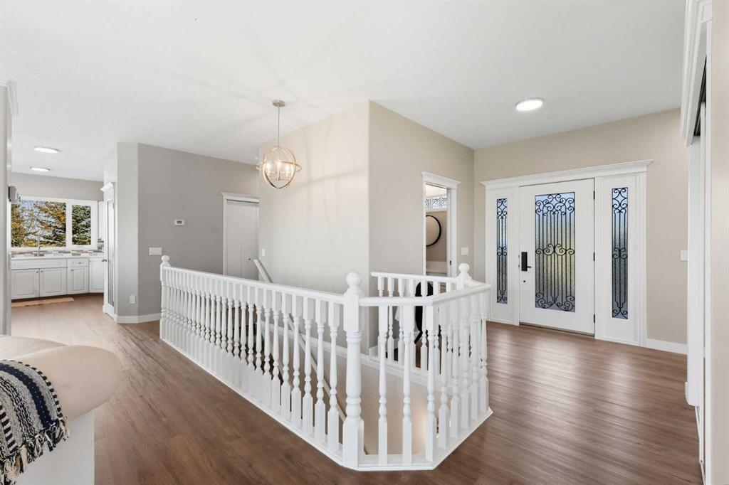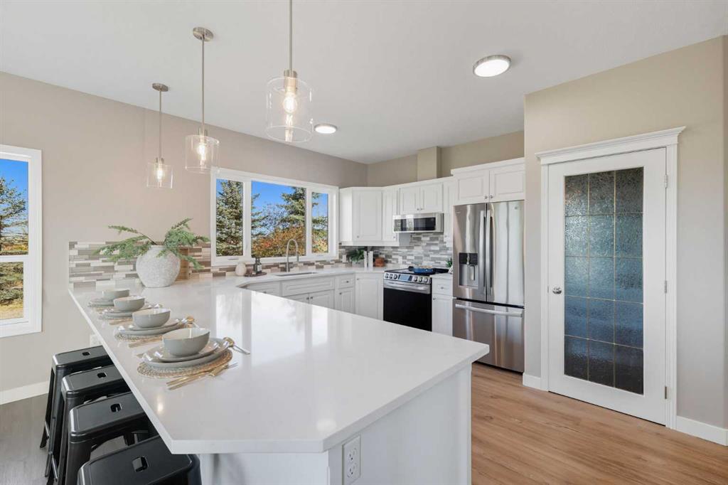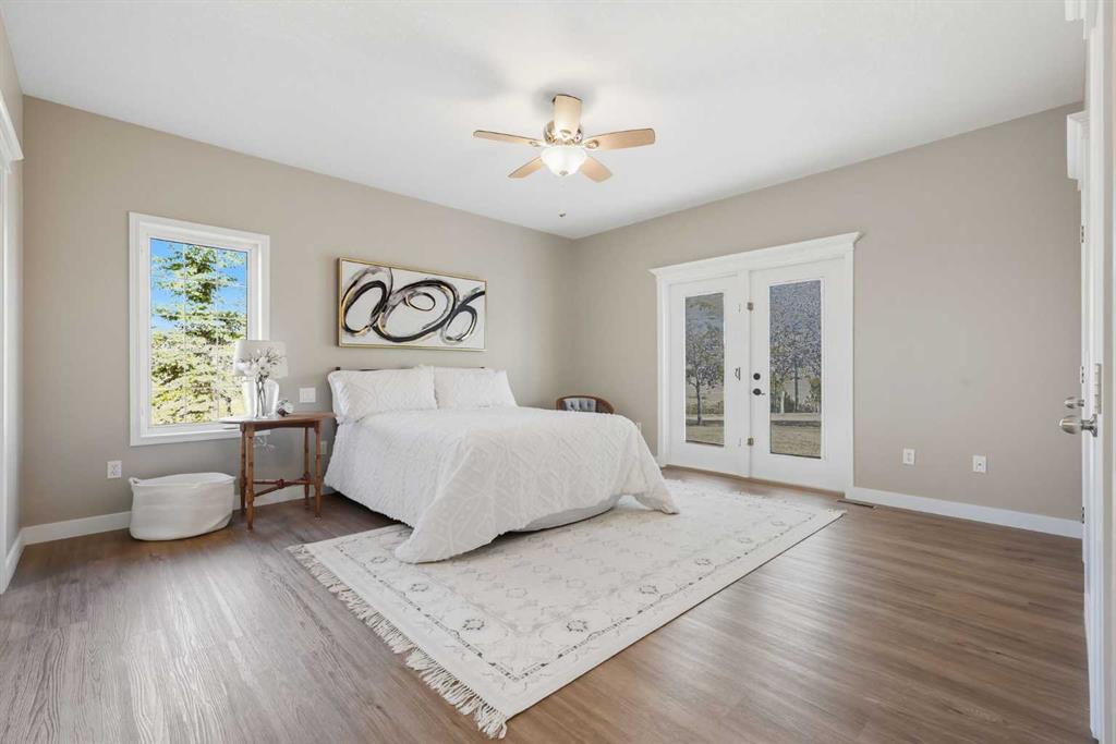Welcome to this custom-built, 3500 sq ft developed area, walk-out bungalow perched on a scenic hilltop in Wheatland County, just 10 km north of Strathmore and only 25 minutes from Calgary International Airport. Set on 3 private, beautifully treed acres surrounded by agricultural fields and boasting unobstructed west-facing views of the Rocky Mountains, this property combines luxury living with peace and privacy. A tree-lined driveway lit with stately fixtures guides you to the home, which has been newly updated with modern paint, lighting, flooring, appliances, and decking, offering a fresh and stylish feel throughout. Designed for easy country living, the property is virtually maintenance free and finished with durable stucco and asphalt shingles. The 47’ x 31’ shop is fully insulated and heated, finished with a metal exterior and metal roof, making it ideal for storage, business, or hobby use in any season. Inside, the main floor showcases a large kitchen with peninsula seating, walk-in pantry, and a cozy breakfast nook with garden doors opening to the west-facing deck with glass railings—perfect for evening sunsets. The dining area and main living room are filled with natural light from oversized windows, and anchored by a gas fireplace, creating a warm and welcoming atmosphere. The master suite includes two walk-in closets, a spa-inspired 4-piece ensuite with a standalone soaker tub and separate shower, and garden doors to the east, perfect for enjoying peaceful morning sun. A den, main floor laundry, and central air conditioning add comfort and practicality. The walk-out basement, complete with in-floor heating, features a large family room with a built-in entertainment area, three bedrooms, big windows, and access to an enclosed patio—a cozy, protected space to enjoy your surroundings year-round. Additional highlights: oversized attached garage with in-floor heat, built-in cabinetry, sink, and hot/cold water, as well as 3 frost-free hydrants located throughout the property. Surrounded by mature trees, wide-open fields, and breathtaking west-facing views. Just a short drive to amenities in Strathmore, and a quick commute to Calgary and YYC. This home offers the ideal combination of luxury, low-maintenance design, and unmatched rural charm. The land offers many possibilities too for future uses as the house and shop were developed on the east side of the property. Whether you’re seeking a private family acreage or a turnkey retreat with space to work and play, this property delivers. A rare opportunity to own a thoughtfully designed, move-in-ready acreage in one of Wheatland County’s most desirable locations. Call your AWESOME Realtor today to book a viewing!