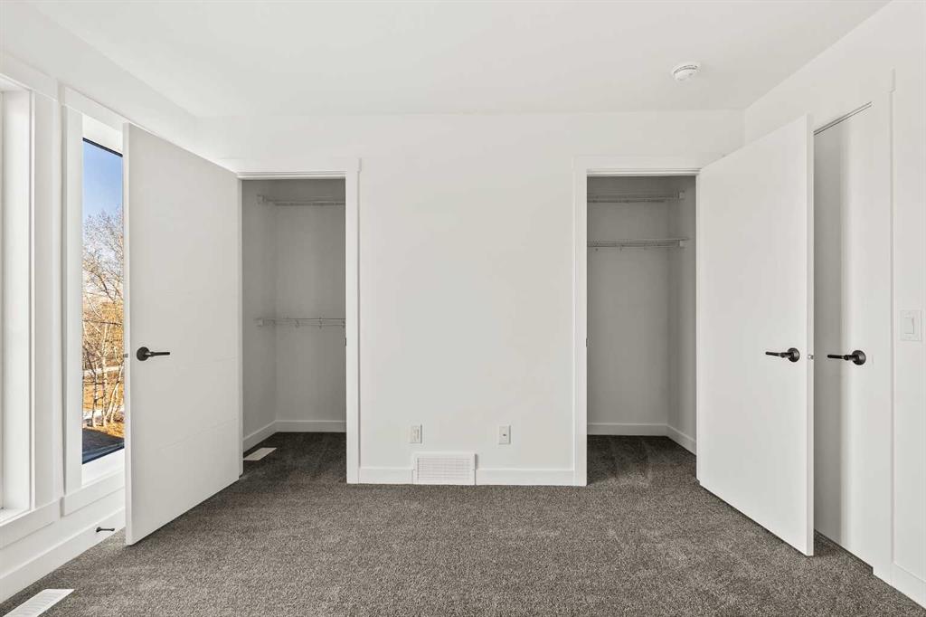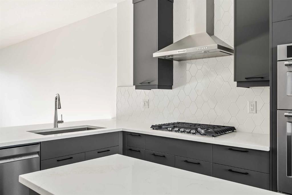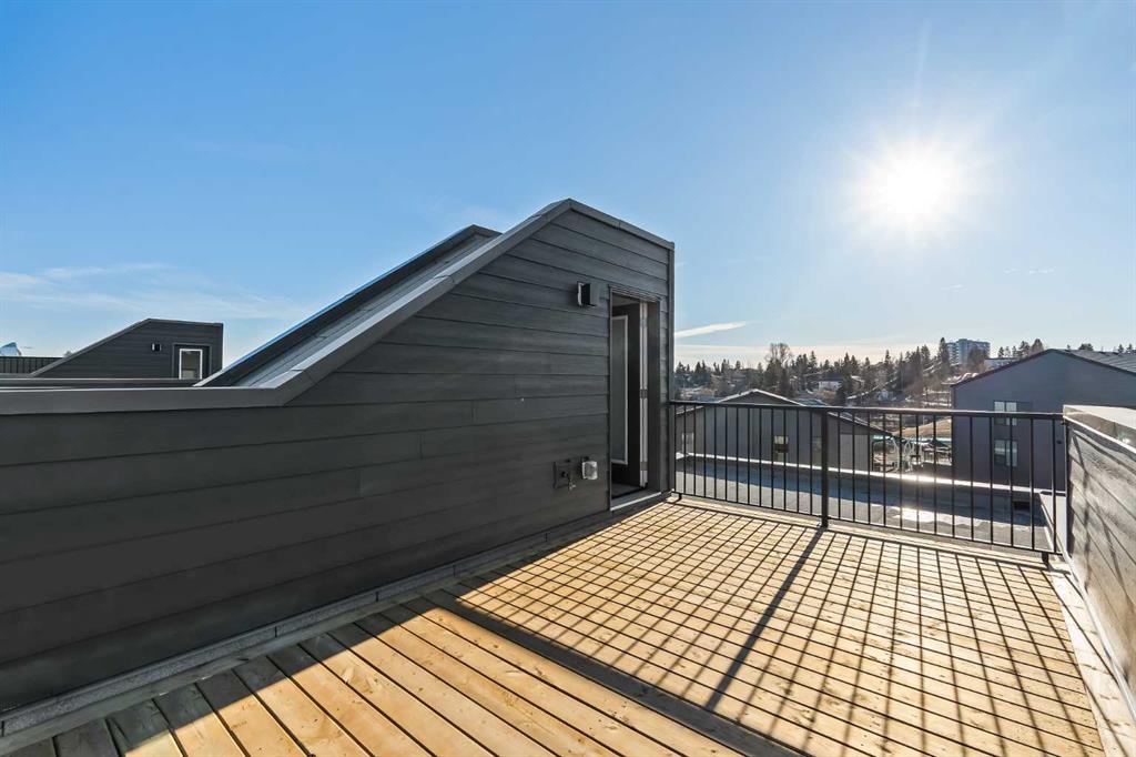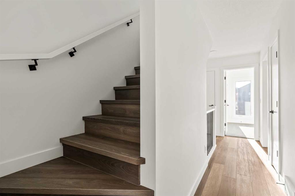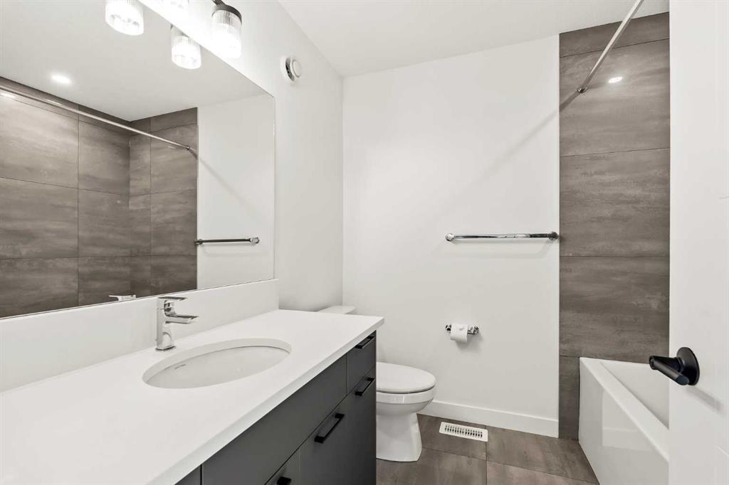Welcome to the Alameda urban townhome at Crown Park, by Brookfield Residential. Thoughtfully designed, this brand-new residence offers over 1,300 sq. ft. of above-grade living space, plus a versatile lower-level flex room conveniently located off the attached garage. Featuring 2 bedrooms, 2.5 bathrooms, two distinct living areas, and two outdoor living spaces – including an impressive ~200 sq. ft. rooftop patio – this home is ideal for young professionals, downsizers seeking a low-maintenance lifestyle, or investors looking for a premium inner-city opportunity. The welcoming front entrance showcases a spacious patio overlooking green space, complemented by a wall of windows that allow you to enjoy the views both inside and out. The main level boasts a bright, open-concept layout designed with entertaining in mind. The gourmet kitchen is equipped with a gas cooktop, built-in appliances, chimney-style hood fan, and a central island as well as an eating bar that flows seamlessly into the dining and living areas. The central dining space overlooks the living room, while south-facing windows flood the main level with natural light throughout the day. A convenient 2-piece powder room completes this floor. The upper level is intelligently designed for privacy, with bathrooms centrally located and two generously sized bedrooms positioned at opposite ends of the home. The primary suite features double-door entry to a walk-in closet and a luxurious 4-piece ensuite with dual sinks and a tiled walk-in shower with niche. The second bedroom offers a large closet and is perfectly suited as a guest room or home office, with south-facing windows and a full 4-piece bathroom located just steps away. Upper-level laundry adds everyday convenience. Durable vinyl plank flooring continues through the upper-level hallway and stairwell leading to the rooftop patio – a thoughtful upgrade that enhances year-round access to the outdoor space. Designed for entertaining, the rooftop patio offers ample room for lounge and dining areas, is equipped with a gas line, and enjoys views over green space. Completing the home is the lower-level flex room, ideal for a media room, home gym, or office, located adjacent to the private single attached garage, which also includes a dedicated storage room. Timelessly designed with hosting in mind and ample room to grow, this townhome is located just minutes from downtown Calgary and offers multiple outdoor living areas that make it as functional as it is beautiful. With immediate access to nature trails, golf, and major transit routes, this home delivers a lifestyle that extends well beyond its walls. Backed by full builder warranty and Alberta New Home Warranty, you can purchase with complete peace of mind!