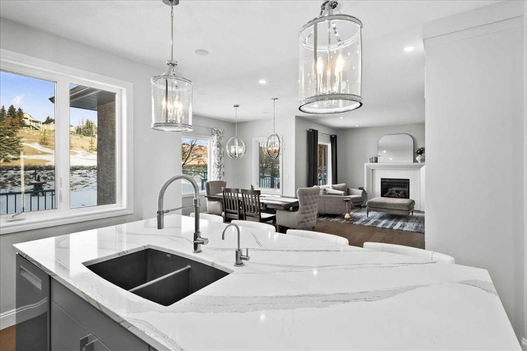 Beautiful two-storey family home in Gleneagles offering over 3,800 sq. ft. of developed living space on large fenced lot overlooking the 14th fairway. The heart of this home is the fully renovated contemporary kitchen, featuring a quartz central island, built-in cabinetry, central vac with kitchen sweep inlet, and stainless-steel appliances—perfect for everyday living and entertaining. A stylish coffee bar with new wine fridge sits adjacent to the kitchen, while the spacious dining area is surrounded by windows overlooking the expansive yard and golf course. The inviting living area showcases an updated fireplace mantel and tile surround. The main floor is complete with a large, bright front den, hardwood flooring throughout, and a fully renovated 2-piece bath. Note the spacious back entry cupbaords and customized built-in locker cubbies.