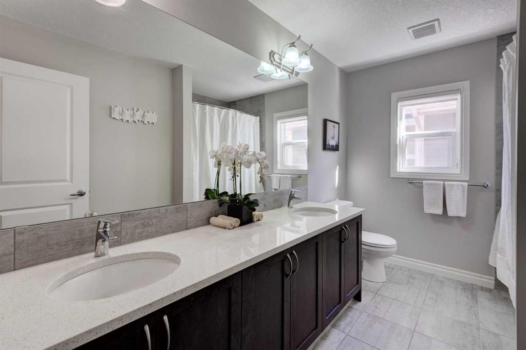 Welcome to this beautifully appointed 2-storey home in one of Cochrane’s most desirable, upscale communities—just steps from the Bow River pathways and a short walk, run, or bike ride to the Spray Lakes Recreation Centre via the River Avenue Bridge. Offering approximately 2,250 sq ft of thoughtfully designed living space, this home backs onto designated park/green space, providing added privacy and a serene outdoor setting. The exposed aggregate driveway, walkway, and backyard patio create outstanding curb appeal and a low-maintenance outdoor environment, complemented by professionally finished flower beds with concrete curbing. Inside, the main floor features rich hardwood flooring, a cozy fireplace, and a spacious, functional layout perfect for both everyday living and entertaining. The kitchen is a standout, complete with granite countertops, built-in appliances, extensive cabinetry including pot drawers, a walk-through pantry, and a large island with seating for four. Upstairs, you’ll find three generous bedrooms and a versatile family room with an elegant tray ceiling. The primary suite offers a true retreat, featuring a luxurious ensuite with double sinks, a deep soaker tub, a large tiled shower, and a walk-in closet off the ensuite with direct access to the laundry room for added convenience. Carpet and tile flooring complete the upper level. The fully developed basement adds even more living space with a fourth bedroom, a full bathroom, vinyl flooring, and ample storage options. Additional highlights include central air conditioning, a roll-out awning on the back deck, and extensive storage solutions in both the basement and garage, including ceiling racks, bike storage, and a kayak storage system. The home is also equipped with a comprehensive security system, including an Omni Shield alarm with leak detection, smoke, heat, and CO monitoring, plus a bed shaker for enhanced safety. This is a rare opportunity to own a well-maintained, feature-rich home in a prime location.
