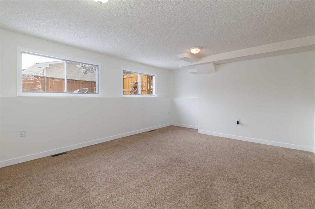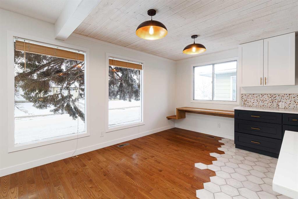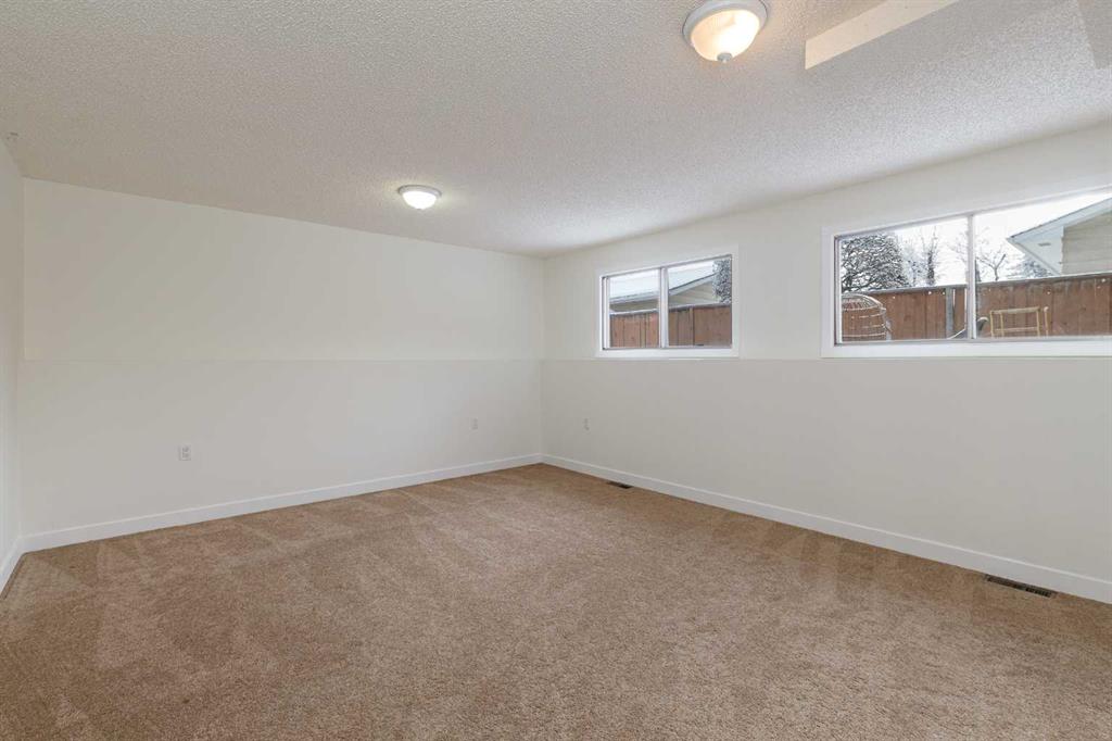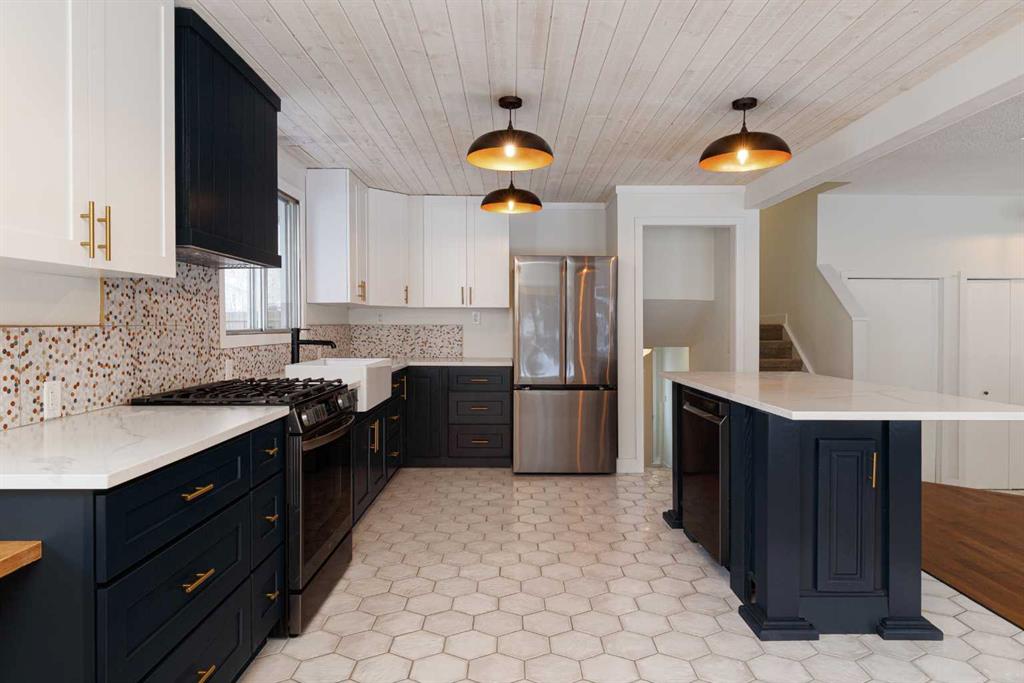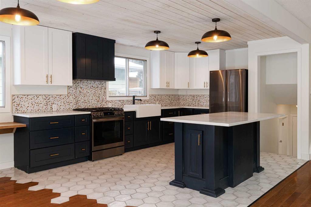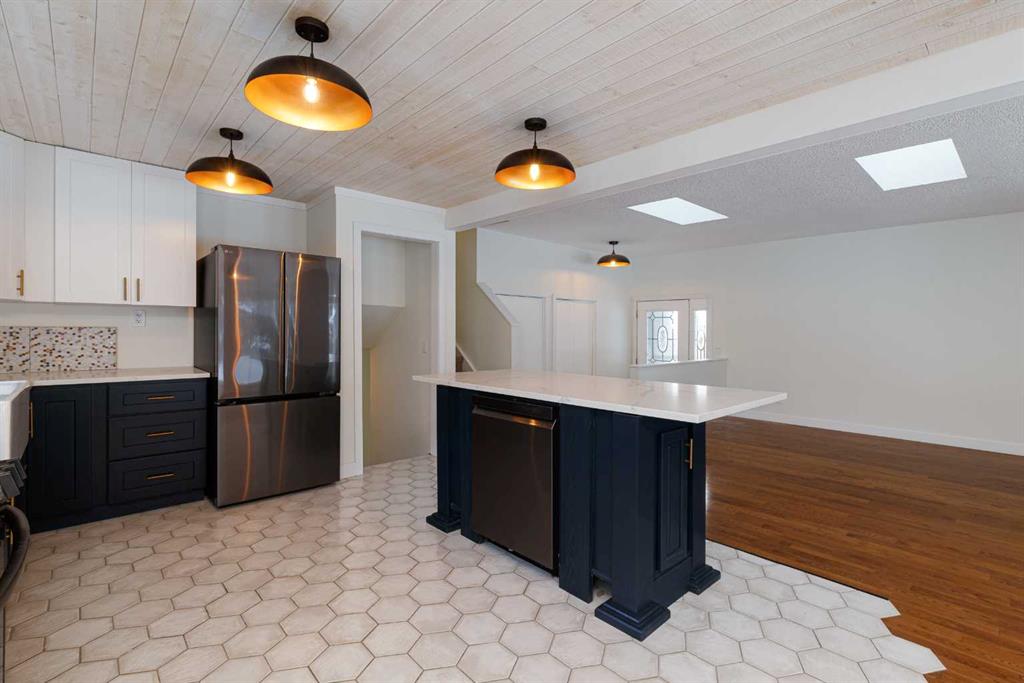 Welcome to this stunningly transformed 4-level split in the heart of Queensland, where mid-century charm meets contemporary luxury. No expense was spared in this top-to-bottom renovation, offering 1,738 square feet of finished living space. The main floor is a showstopper, featuring an open concept layout with gorgeous hardwood flooring and a custom kitchen. The culinary space boasts sleek navy and white cabinetry, a large central island, quartz countertops, a classic farmhouse sink, and a unique hexagonal tile transition that seamlessly blends the kitchen and dining areas. Large windows and dual skylights flood the space with natural light, highlighting the modern wood plank ceiling and industrial-chic lighting. Relax in the expansive living room, anchored by a sleek, minimalist fireplace with a slate hearth. Retreat to the upper level where you will find three generously sized bedrooms, including the primary with two piece ensuite. The lower level provides even more versatility with a massive recreation room—perfect for a home theatre or play area—along with a fourth bedroom and a second full bathroom, making it an ideal space for guests or teenagers. The basement level houses the laundry and a large open space ensuring you’ll never be short of storage. A separate entrance walks up to the large private yard with mature trees and plenty of space to roam. An oversized double detached garage and parking space for your RV complete this property. This home is ideally located and is just minutes from schools, shopping, the ridge at Fish Creek Park, and an off leash dog park. Don’t miss your chance to own one of the most uniquely renovated homes in this established, quiet community!