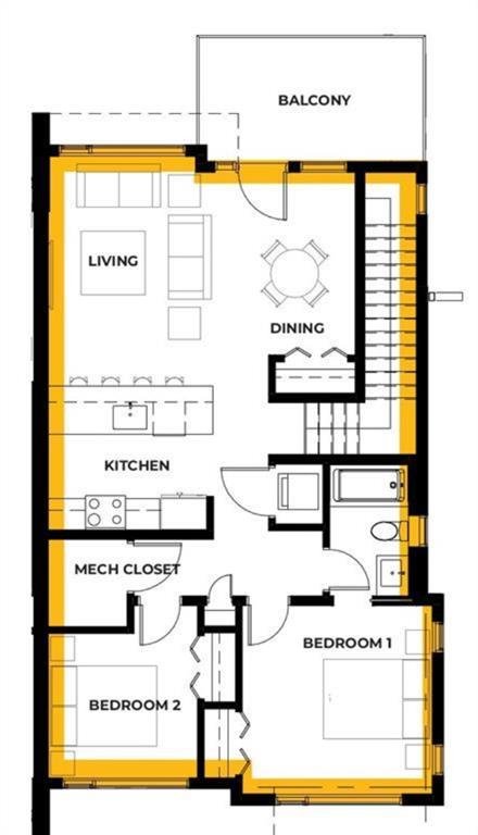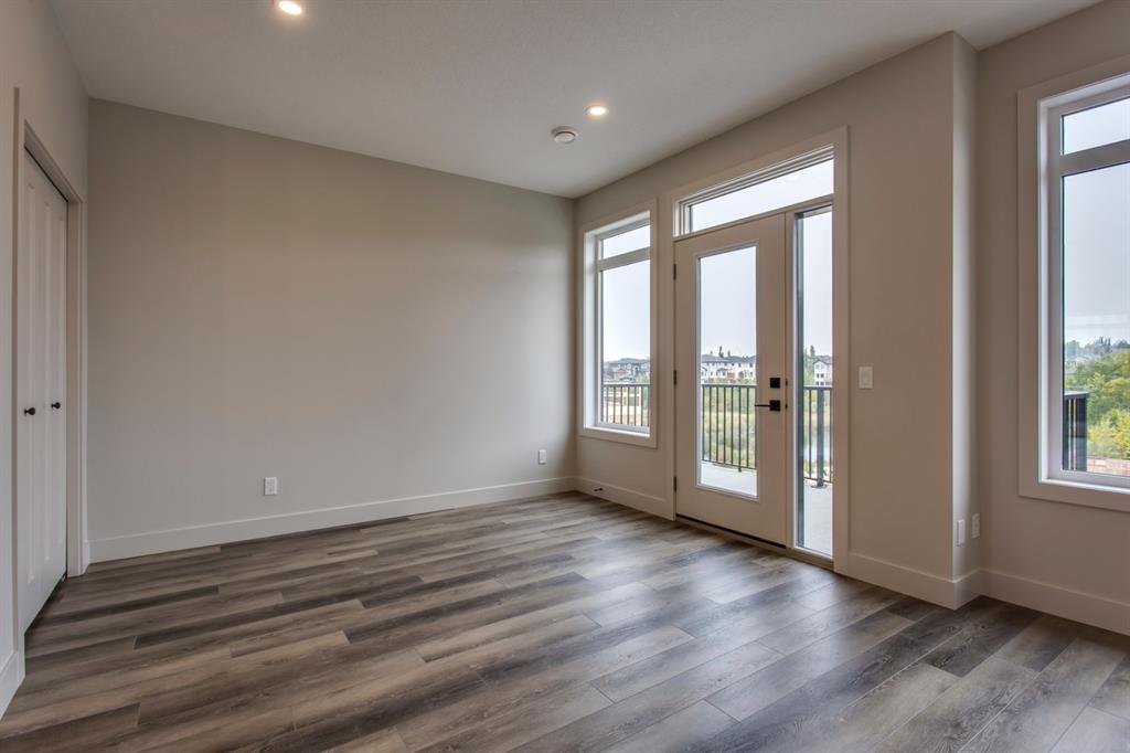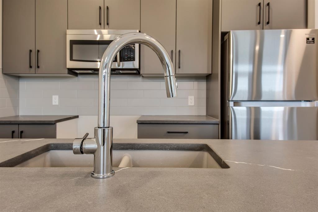Ravines of Royal Oak by Janssen Homes offers unmatched quality & design, located on the most scenic & tranquil of sites in the mature NW community of Royal Oak. This 2BR, 1-full bath 1,167sf (1,167RMS) 24’-wide stacked townhouse with single attached garage boasts superior finishings. Open-concept-plan features a fresh, modern kitchen with full-height cabinets, soft close doors/drawers & full extension glides, quartz counters, undermount sink, plus 4 S/S appliances & convenient peninsula island opening onto both dining area with access to rear balcony & spacious living room. With over 900sf on the main living level there is ample space for a roomy master retreat, 4-pce bath with tile floor & quartz vanity, an additional bedroom which can be used as an office, & ultra-convenient laundry area. Single attached garage with room to park an extra car on front driveway completes the package. Ravines of Royal Oak goes far beyond typical townhome offerings; special attention has been paid to utilizing high quality, maintenance free, materials to ensure long-term, worry-free living. Acrylic stucco with underlying ‘Rainscreen’ protection, stone, & Sagiwall vertical planks (ultra-premium European siding) ensure not only that the project will be one of the most beautiful in the city, but that it will stand the test of time with low maintenance costs. Other premium features include triple-pane, argon filled low-e, aluminum clad windows, premium grade cabinetry with quartz countertops throughout, 9′ wall height on all levels, premium Torlys LV Plank flooring, 80-gal hot water tank, a fully insulated & drywalled attached garage that includes a hose bib & smart WiFi door opener, among other features. Condo fees include building insurance, exterior building maintenance & long-term reserve/replacement fund, road & driveway maint., landscaping maint., driveway & sidewalk snow removal, landscaping irrigation, street & pathway lighting, garbage/recycling/organics service. Bordered by ponds, natural ravine park, walking paths & only minutes to LRT station, K-9 schools, YMCA & 4 major shopping centres. Note – photos from a similar model in the complex.
