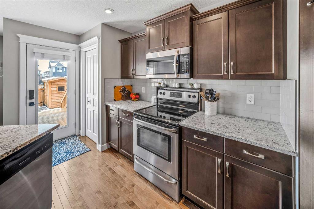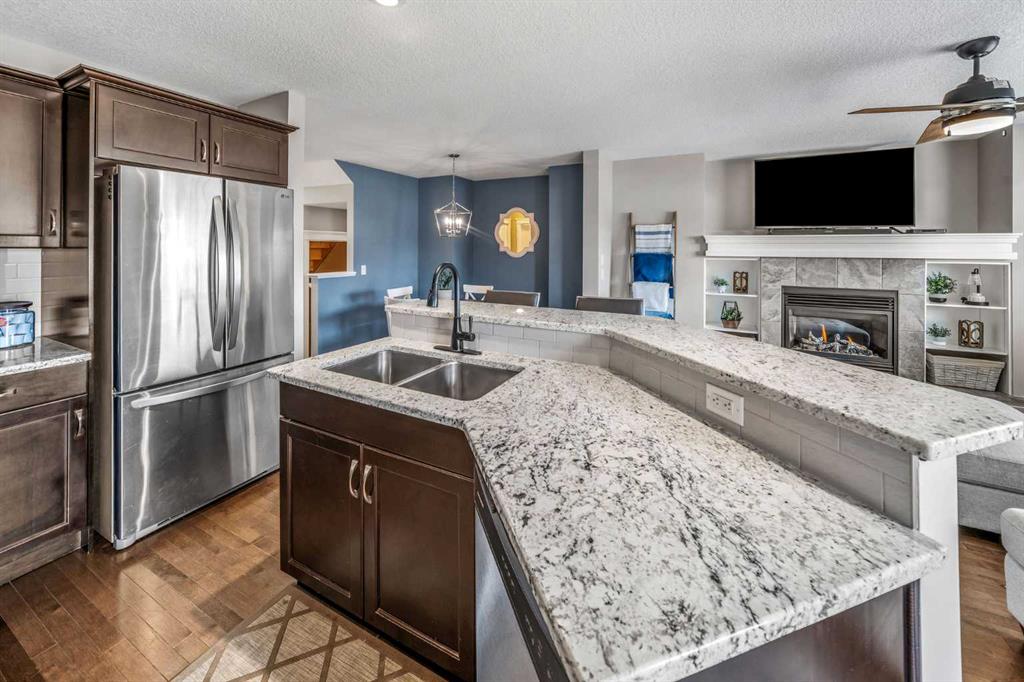 The main floor features rich hardwood flooring, a versatile den ideal for a home office, convenient main floor laundry, and a stylish powder room. The heart of the home is the kitchen, complete with richly stained cabinetry, a stainless steel appliance package, and thick stone countertops that extend seamlessly onto the island – perfect for entertaining. The inviting family room showcases a cozy fireplace and flows effortlessly into the dining area, creating a warm and welcoming space.