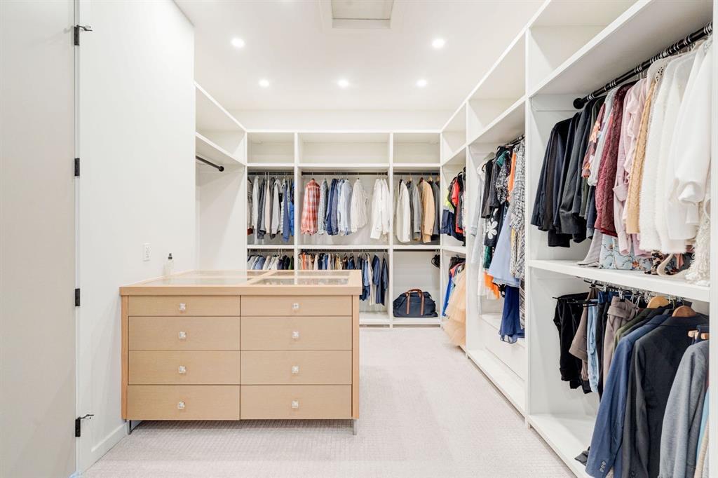 The entire top floor is dedicated to a luxurious primary bedroom oasis, complete with a large private balcony, an enormous walk-in closet boasting a built-in oak island dresser with glass top, and a spa-like ensuite with heated floors, double white oak vanities, water closet, and a seamless glass shower with built-in steam unit.