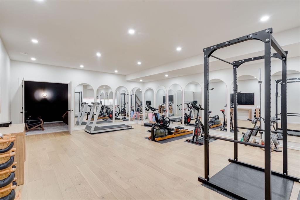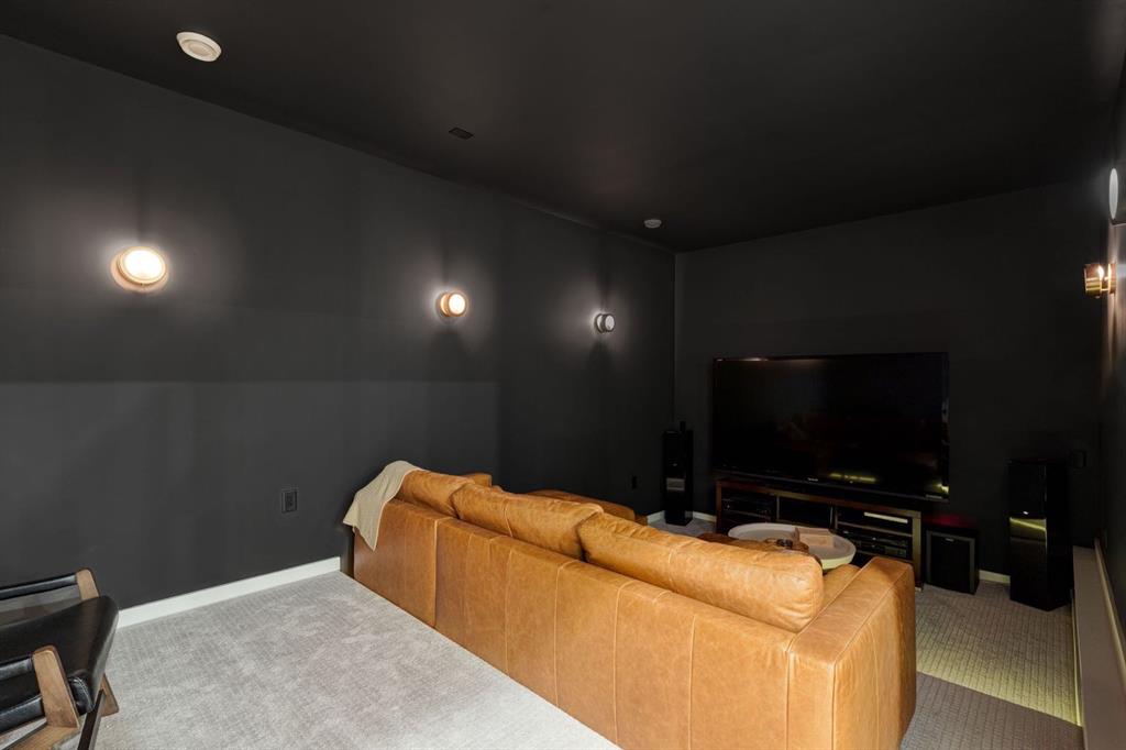 * A massive basement entertaining area featuring a wet bar, a separate built-in private movie theatre room with stepped seating, integrated floor lights, and pre-wired for sound equipment—making this space ideal for entertaining or family movie nights