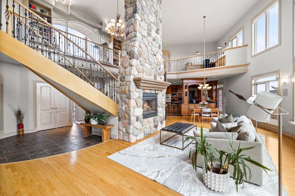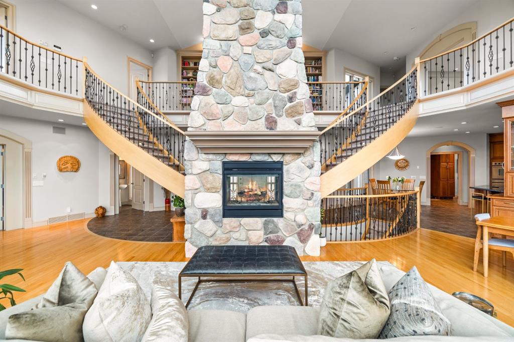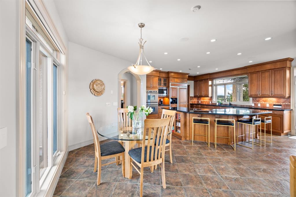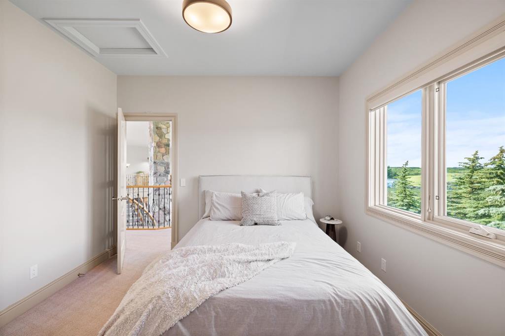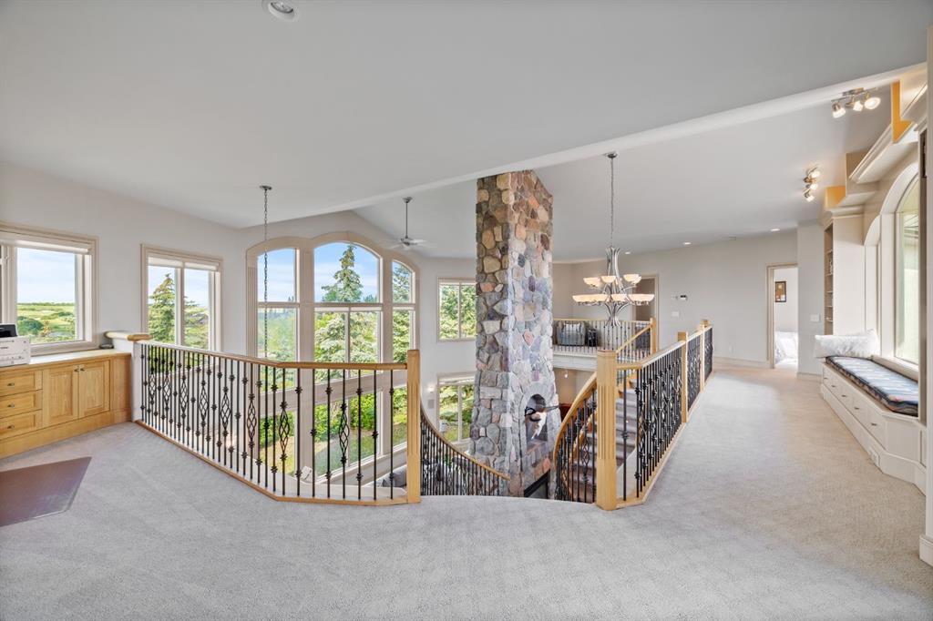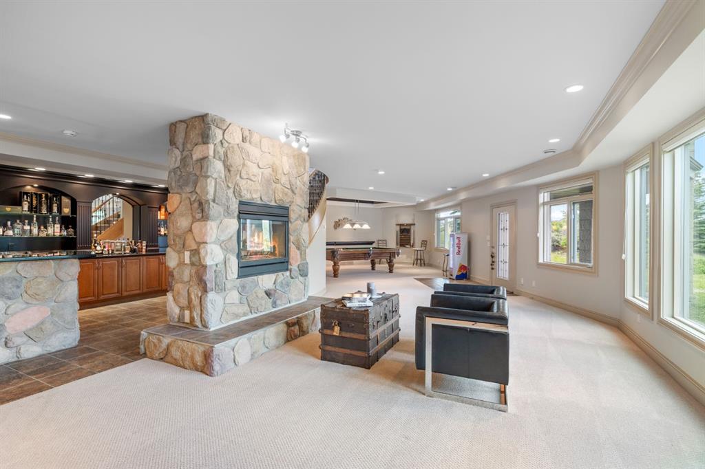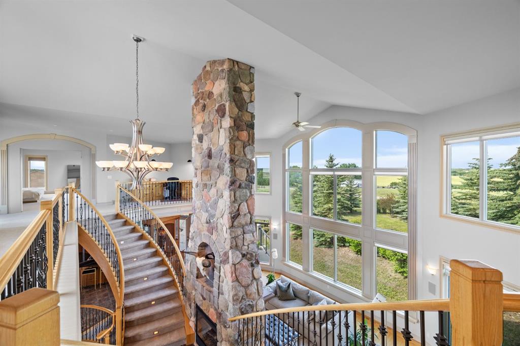 Welcome to this extraordinary 4 acre estate, where luxury, functionality, and breathtaking mountain views converge in perfect harmony! The garage is a standout feature of this abode, offering space for up to nine vehicles! With a fully epoxied finish and in-floor heating, ideal for the automotive enthusiast or easily transformed into a massive shop complete with its own bathroom. The home has been recently refreshed with brand new interior and exterior paint and complemented by a newly paved driveway, this meticulously designed home offers an unparalleled living experience. Stepping inside you are greeted with a spectacular double-sided, floor to ceiling stone fireplace with dual staircases emerging from its base leading to the upper level of the home. From here you are met with the kitchen, a chef’s dream, complete with a large granite island, ceiling-height cabinetry, stainless steel appliances, and a spacious walk-in pantry. It seamlessly flows into the eating nook and living room, creating a welcoming hub for daily life. The adjacent living room offers vaulted ceilings with expansive windows showcasing panoramic views of the mountains and rolling hills, with direct access to the spacious back deck. An exceptional theatre room with custom built-ins, two powder rooms and main floor laundry, with a brand new washer and dryer, complete this fantastic main floor. Upstairs you are met with a cozy window seat, a built-in reading nook and desk space, perfect for leisurely reading or a study area. The primary retreat is truly exceptional, featuring its own private deck to soak in the endless mountain vistas, a luxurious 5-piece ensuite with a jetted soaking tub beneath a skylight, dual vanities, a private steam shower, and a walk-in closet with custom built-ins. A private office or potential fitness area is also accessible from the primary bedroom. Completing this upper level are two additional bedrooms joined by a stylish Jack and Jill 5-piece bathroom. Descending to the fully finished walk out basement, this space is designed