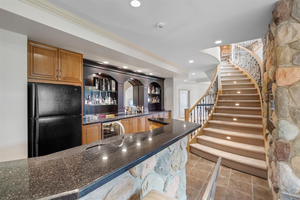 for entertaining with a spacious family room showcasing a double-sided fireplace! The wet bar is complete with raised seating, a beverage fridge, full-sized fridge, and custom wine storage which is seamlessly connected to the custom billiards space with pool table included! Finishing off this level is an additional bedroom and full bathroom. The property is hardwired for a gate, features 400-amp service, complete with full irrigation, and a central vacuum system for ultimate convenience. Furthermore, in-floor heating continues throughout all three levels of the home, providing year-round comfort. This incredible property is set on a private lot with stunning panoramic mountain views, offering tranquility, privacy, and timeless elegance. Pride of ownership is seen throughout this meticulous masterpiece!