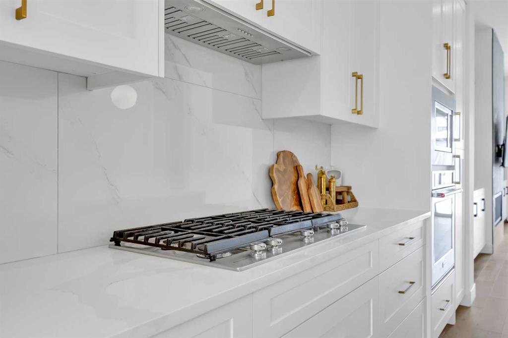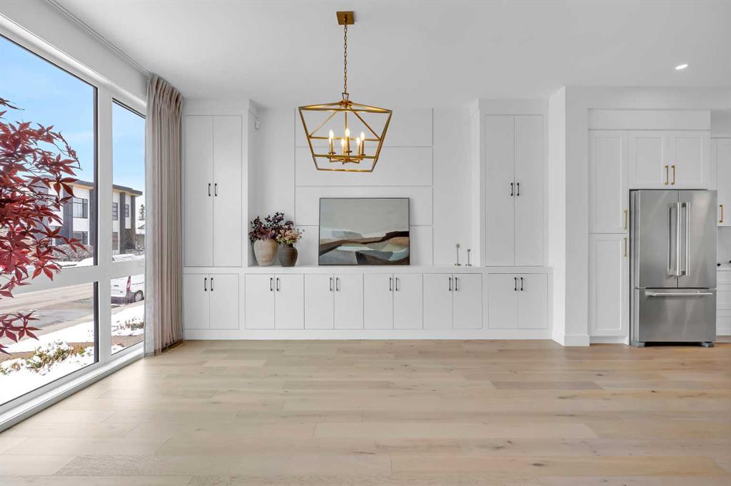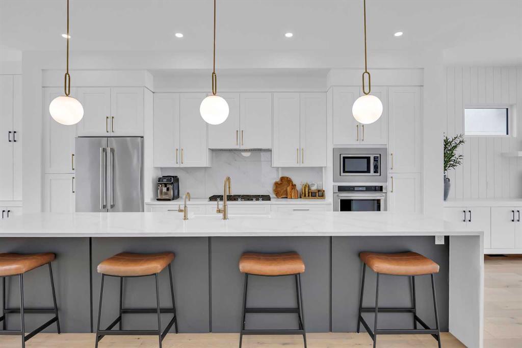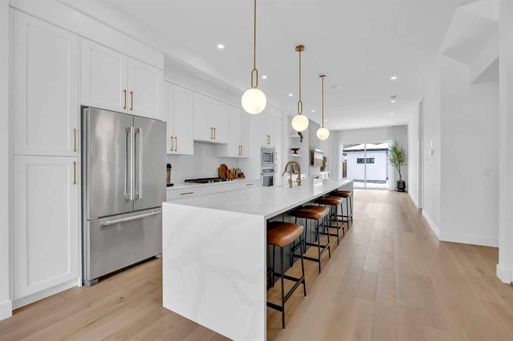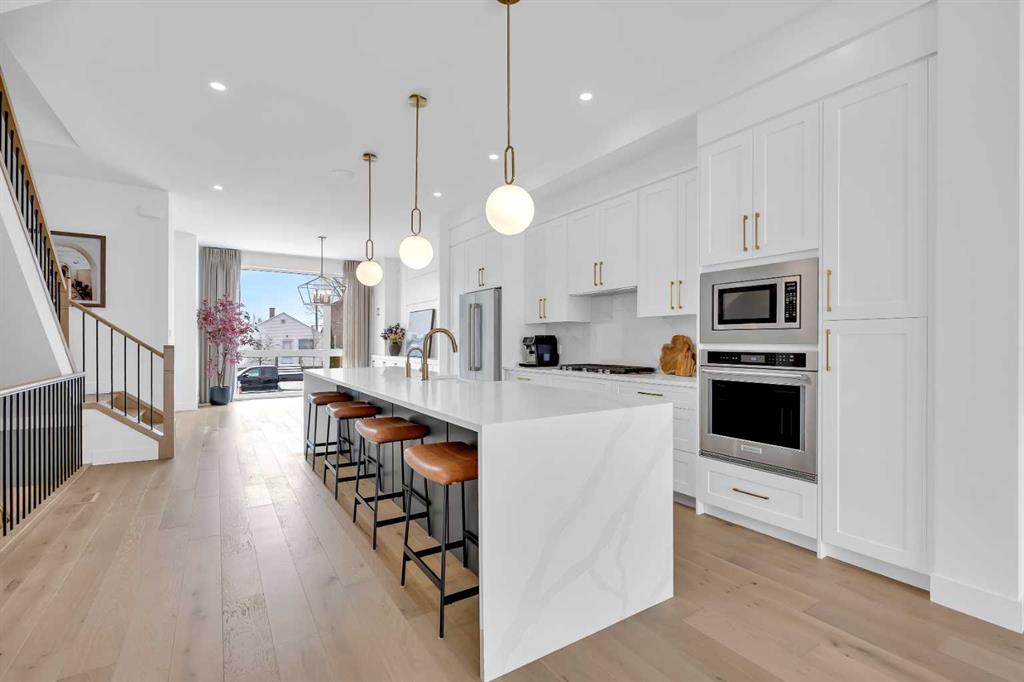 The main floor showcases impressive 10’ ceilings and rich hardwood flooring, creating a bright and inviting atmosphere. The chef-inspired kitchen is the heart of the home, complete with quartz countertops, high-end stainless steel appliances, custom cabinetry, and a massive island with waterfall edges—perfect for entertaining or everyday living. Ample storage ensures a clean and organized space.