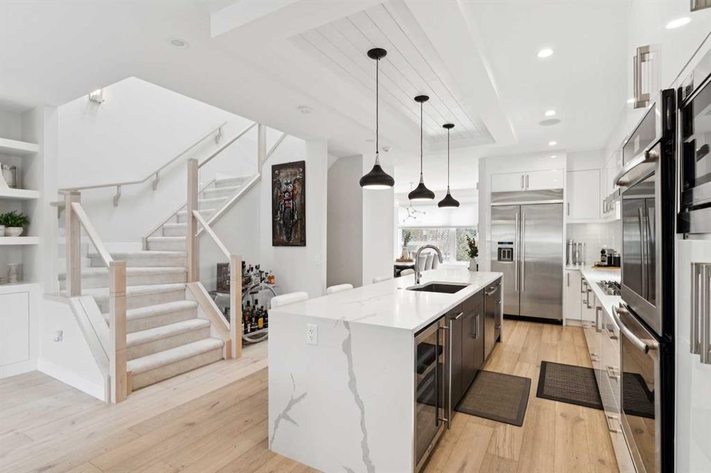 This remarkable inner city home in Killarney is truly an entertainers dream! It starts with an expanded kitchen that has the best of appliances. Jennair oversize built in fridge, gas cooktop, double wall oven, garburator and wine fridge. The huge marble island is the perfect place to hang out before or after dining in the elegant front dining room. Move out back to the masterfully landscaped stone patio area with an amazing gas fire-pit. The garage has been designed to provide an additional outdoor entertainment area with a second overhead door that opens to the patio. The garage is finished inside and has an epoxy floor. Perfect for setting up a bar for the patio or use as a covered entertaining area for BBQ’s. Move downstairs and you’ll find an amazing one of a kind glass walled wine, whiskey and cigar room with an independent air exchange/ventilation system. Fully sealed and so well designed you will never smell cigars anywhere in the home. Every box was ticked on this custom build. Upstairs in the owner’s retreat is a wonderful marble ensuite with heated floors, soaker tub, and a steam shower with a bench. The walk-in closet is almost 16′ long with thoughtful build ins. Additionally we have central A/C, silk carpets, heated basement and ensuite floors, triple pane windows, upgraded insulation, home automation, extensive and expensive landscaping/stone work front and back, and much more. Cost was no object on this build and the amazing upgrades make this one an incredible value in this market.