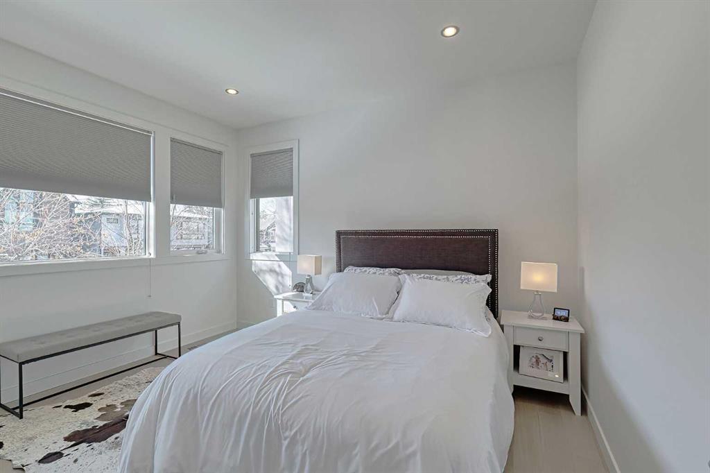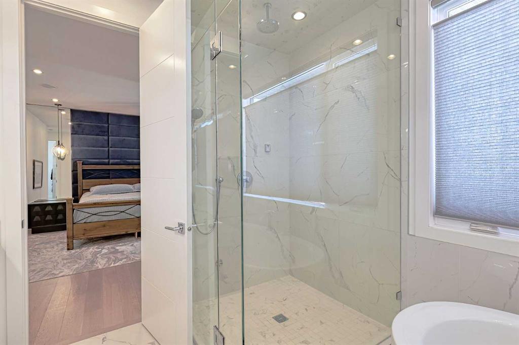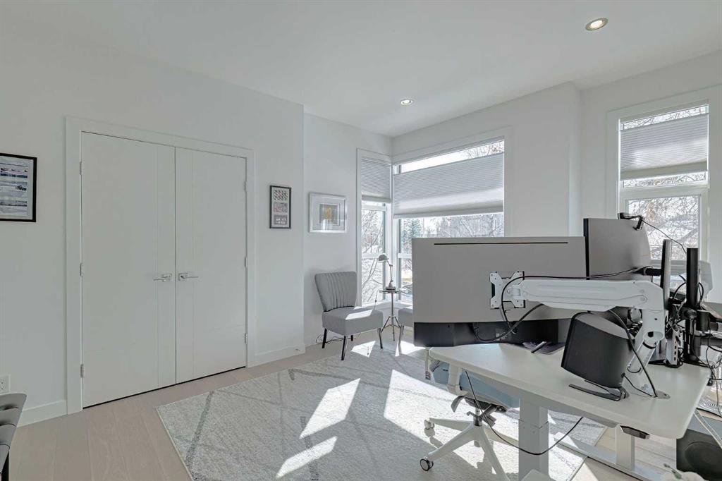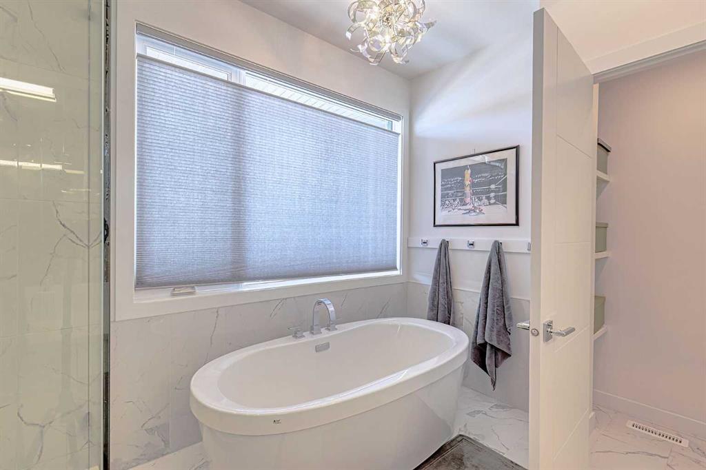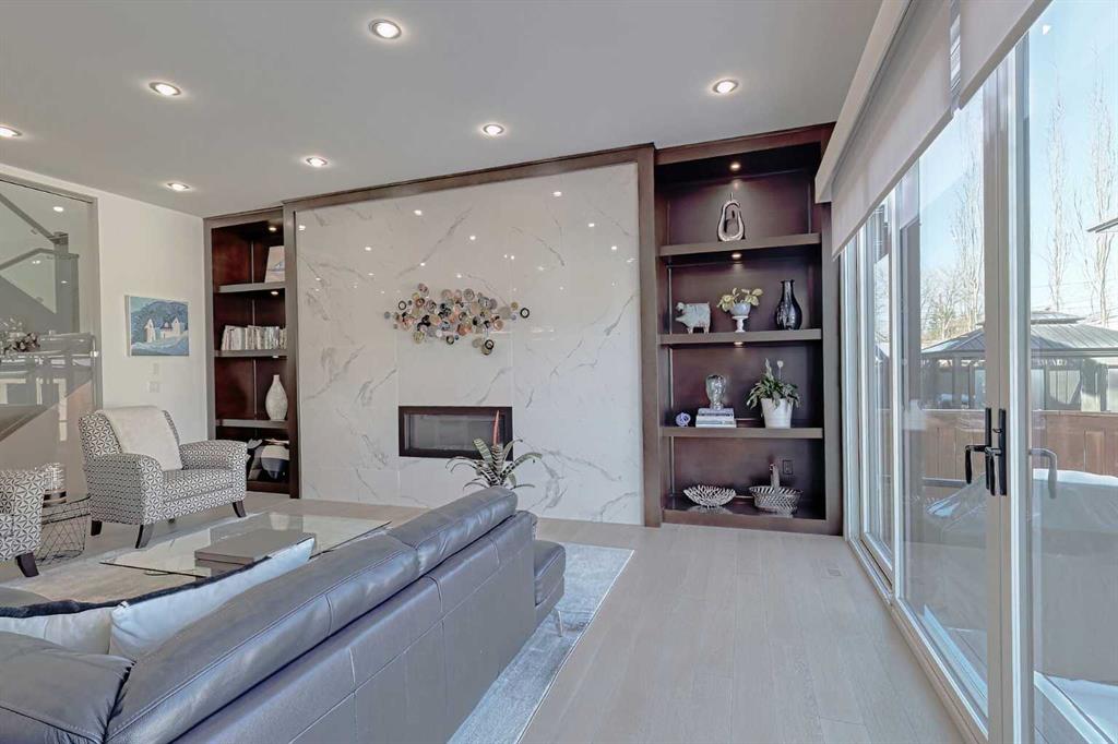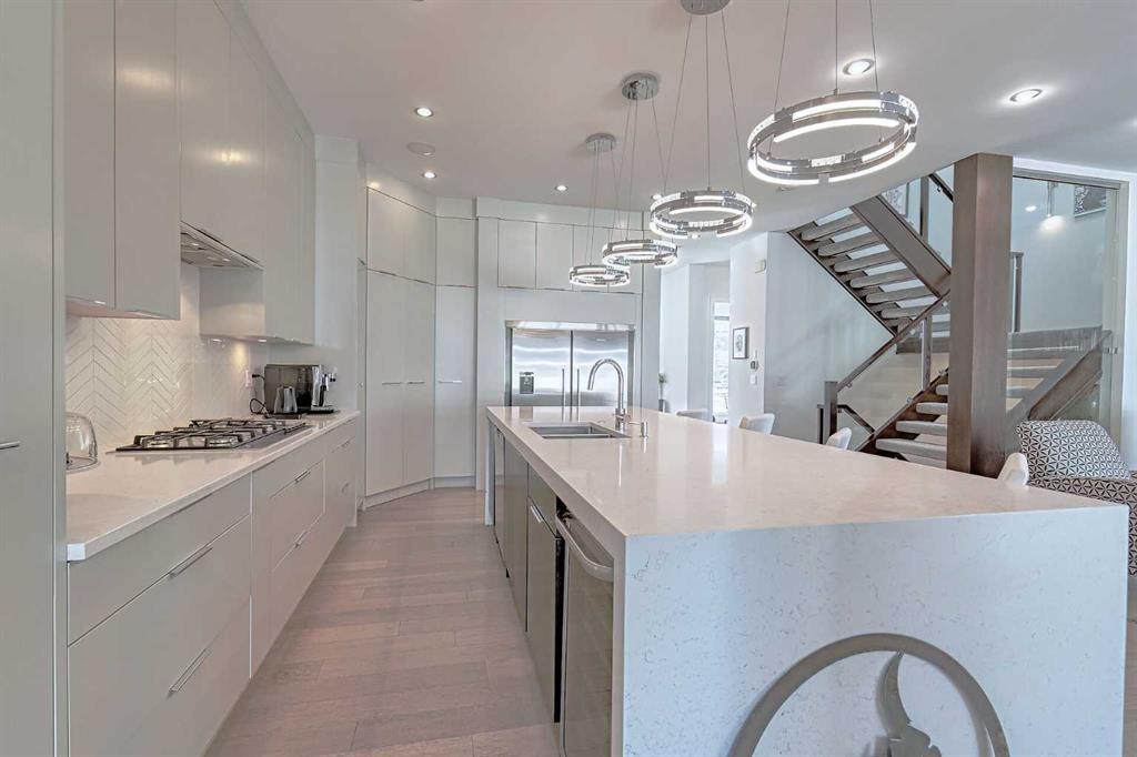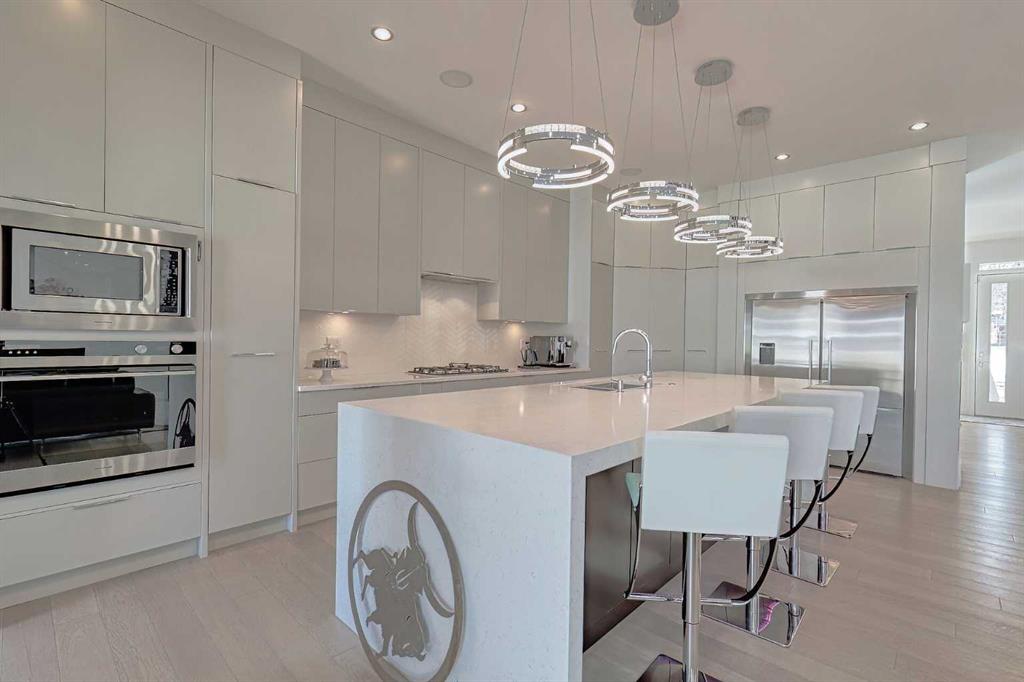 IT’S A LIFESTYLE !! Picture a life where you wake up in a quiet, tree lined SW inner-city neighbourhood, grab a coffee, drive out of your RARE TRIPLE CAR GARAGE and be downtown in minutes. Live the dream in your luxurious modern home and enjoy fun-filled evenings with family and friends in a showpiece GOURMET KITCHEN designed for real cooks. The kitchen features DELUXE FISHER PAYKEL APPLIANCES including gas cooktop, wall oven and a quiet MIELE DISHWASHER. Note the hidden corner pantry, extra rolling storage and spice racks, and even more storage in the covert cabinets at the front of the island, lit by multi-coloured LED lighting. Imagine laughter echoing through soaring 10’ CEILINGS, and natural sunlight pouring into the OVERSIZED WINDOWS. The upper level with THREE SPACIOUS BEDROOMS includes a relaxing primary bedroom retreat sensibly designed with his and hers walk-in closets. After a tough work week envision finally resting in your king sized bed with tufted blue velvet wall and designer pendant lights or unwinding in the SPA-INSPIRED ENSUITE that feels like a boutique hotel… comes with a freestanding soaker tub, European tiled shower and dual sinks. Also on this floor is a spacious laundry room, and I nearly forgot to mention that the second bedroom has its own walk in closet! So many CUSTOM UPGRADES – lighting, plumbing, built in speakers, an entire home automation system with motion sensors and for ease of life, all the louvres and roller blinds are automated with their own remotes (Lucenti automated roller blinds in the great room), a mudroom with built in storage, hot tub rough in, etc. This Killarney gem is beautifully built with 10’ ceilings that create an airy, open feel, has wide-plank hardwood flooring, custom cabinetry, a massive island for your creative baking pleasure, a great room that brings people together and features a tile surround showcase fireplace. AND the large dining room with stunning floor to ceiling built-in shelving is a show stopper. A large FOURTH BEDROOM and THREE PIECE BATHROOM complete the FULLY DEVELOPED BASEMENT. Imagine movie nights in your own private media lounge where you might also host guests with a wine or whiskey tasting at your fancy wet bar, a lower level made for memories. Check out the garage with new, cutting edge steel cabinets and polyaspartic flooring (tough as nails, but breaths better than epoxy). A fabulous, private back yard with Artificial turf gives you a near entirely MAINTENANCE FREE FRONT and BACK YARD with ALUMINUM PRIVACY SCREEN and lots of space for your patio furniture and outdoor fire pit. There are plenty of entertaining areas inside and outside this opulent home. Minutes to downtown, transit, parks, amenities and the Shaganappi Golf Course; golf in summer or cross country ski and snow shoe in winter. The Killarney Aquatic Recreation Centre is also just blocks away. This magnificent detached home blends contemporary design with everyday comfort – where modern luxury meets everyday ease.