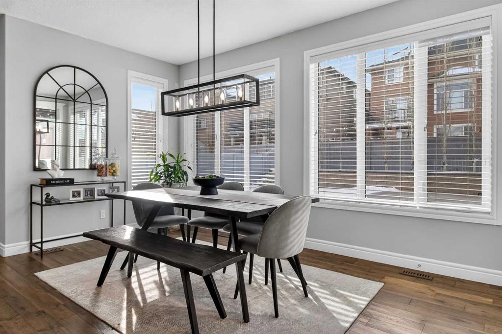 The main floor offers a sophisticated open-concept layout ideal for both everyday living and entertaining. The inviting family room is centered around a striking floor-to-ceiling stone gas fireplace and offers generous space for gathering. The dining area, positioned at the rear of the home, is filled with natural light from large windows and provides direct access to the backyard.