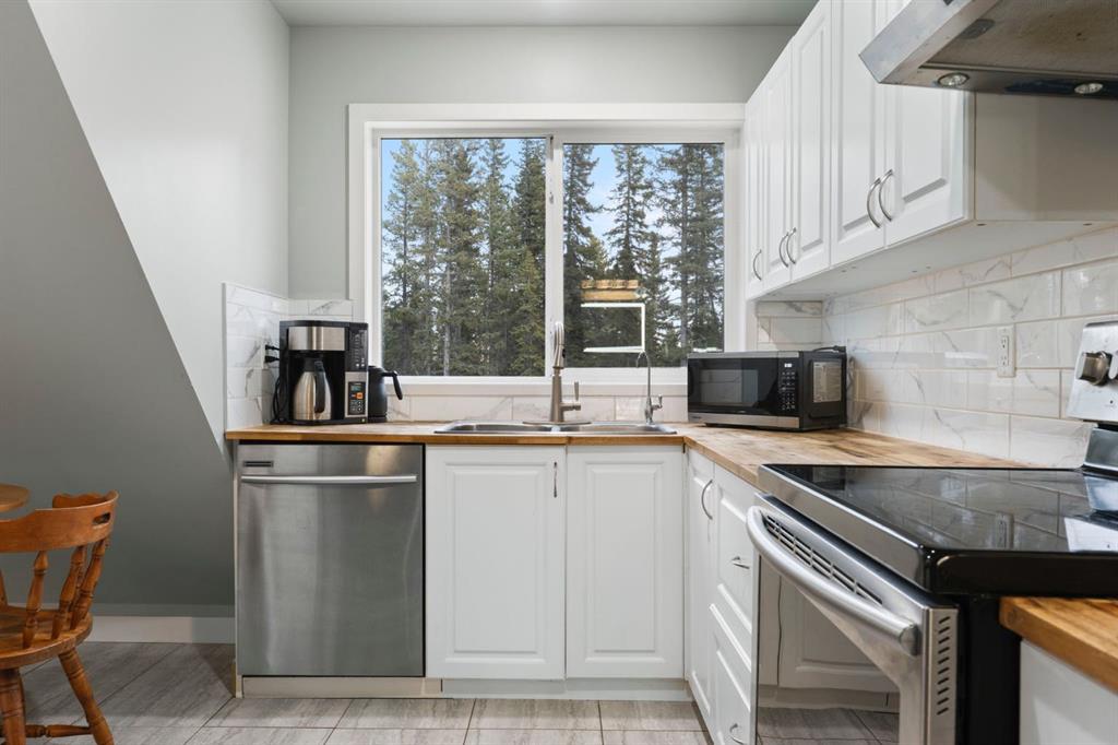 The kitchen features crisp white cabinetry, warm butcher block countertops, stainless steel appliances, and a modern tile backsplash, with natural light pouring in through large windows overlooking the driveway and surrounding forest.