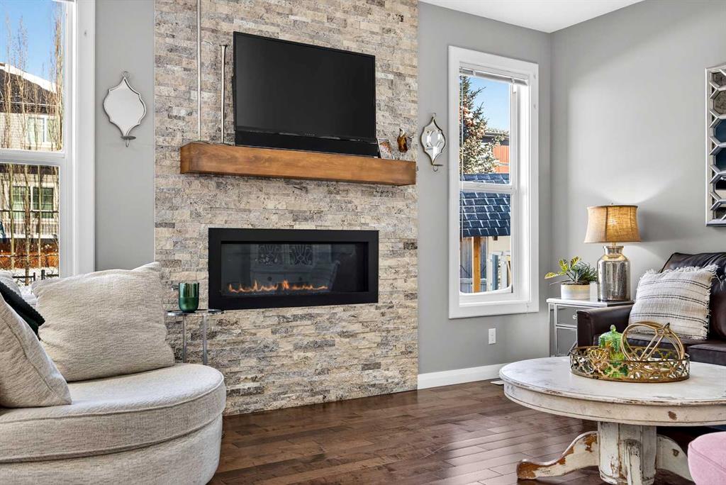 The living room is a true showpiece, centered around a striking gas linear fireplace wrapped in full-height stone with a wood mantle — an elegant focal point framed by expansive windows that capture natural light and backyard views.