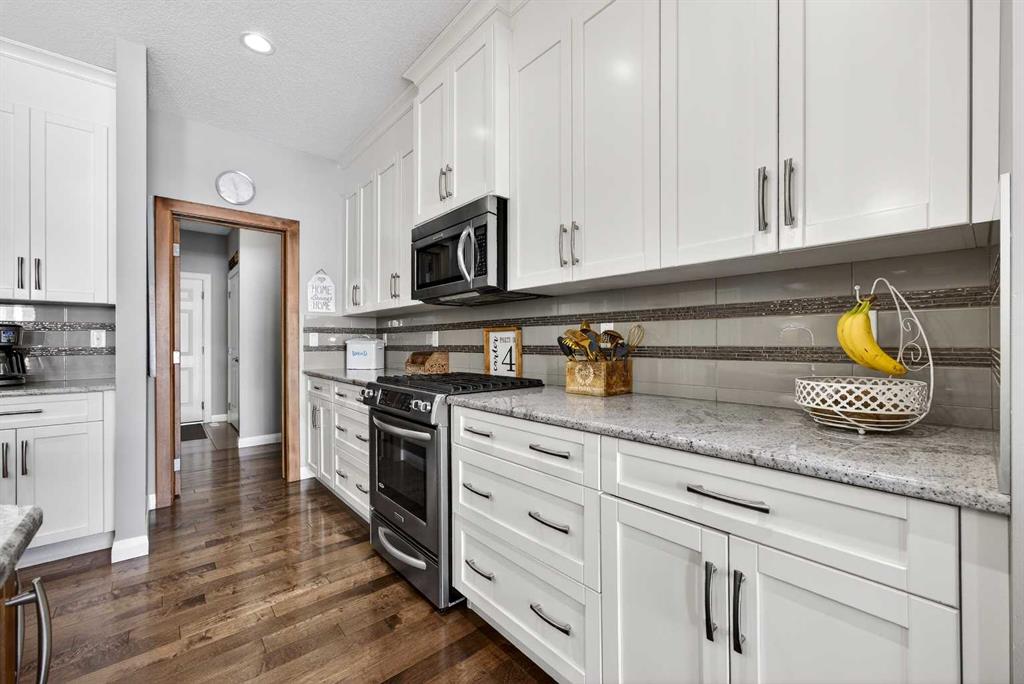 The chef-inspired kitchen is equally impressive. Full-height cabinetry, granite countertops, stainless steel appliances, gas stove, microwave hood fan, and an oversized statement island create a space that is both sophisticated and functional. Whether hosting intimate dinners or lively gatherings, this kitchen was designed to be the heart of the home.