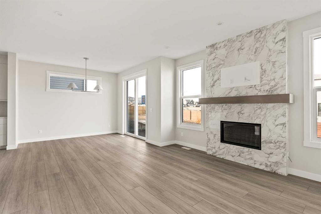 Introducing the Purcell 26 in Livingston – a beautifully curated, move-in-ready home that blends thoughtful design with everyday functionality. Professionally styled with timeless finishes and elevated details, this residence offers versatility for growing families, multigenerational households or investors seeking a polished, turnkey property. With 2,425 sq. ft. of developed living space, the layout provides a flex room, two distinct living areas, three bedrooms, 2.5 bathrooms and an undeveloped basement awaiting your vision. Luxury Vinyl Plank flooring stretches across the main level, setting the tone for a durable yet refined interior. At the heart of the home is a striking kitchen complete with a built-in range hood, island microwave, quartz island and upgraded custom lighting. A full walk-through pantry connects seamlessly to an oversized mudroom, adding everyday convenience and storage. The dining and living spaces span the rear of the home, framed by expansive windows that invite natural light throughout the day. A central gas fireplace with a tiled surround is flanked by symmetrical windows, creating a beautifully balanced focal point. A grand front foyer, dual closets and a 2-pc powder room complete the level. The staircase, finished with natural wood and iron railing, leads to an upper level designed for separation and comfort. A central bonus room sits between the secondary bedrooms and the private primary retreat. The primary suite features generous windows for plenty of natural light, along with a spa-inspired ensuite offering a tiled walk-in shower, a soaker tub, dual vanities and a private water closet. Two additional bedrooms, a 4-pc bathroom and a laundry room with counter space complete the upper floor. A separate side entrance provides direct access to the basement, making it well suited for future development. This brand-new property is move-in ready and includes Alberta New Home Warranty, giving you confidence and peace of mind as you settle into your new home. A rare opportunity to own a beautifully designed Purcell 26—crafted for comfort, style and long-term living.