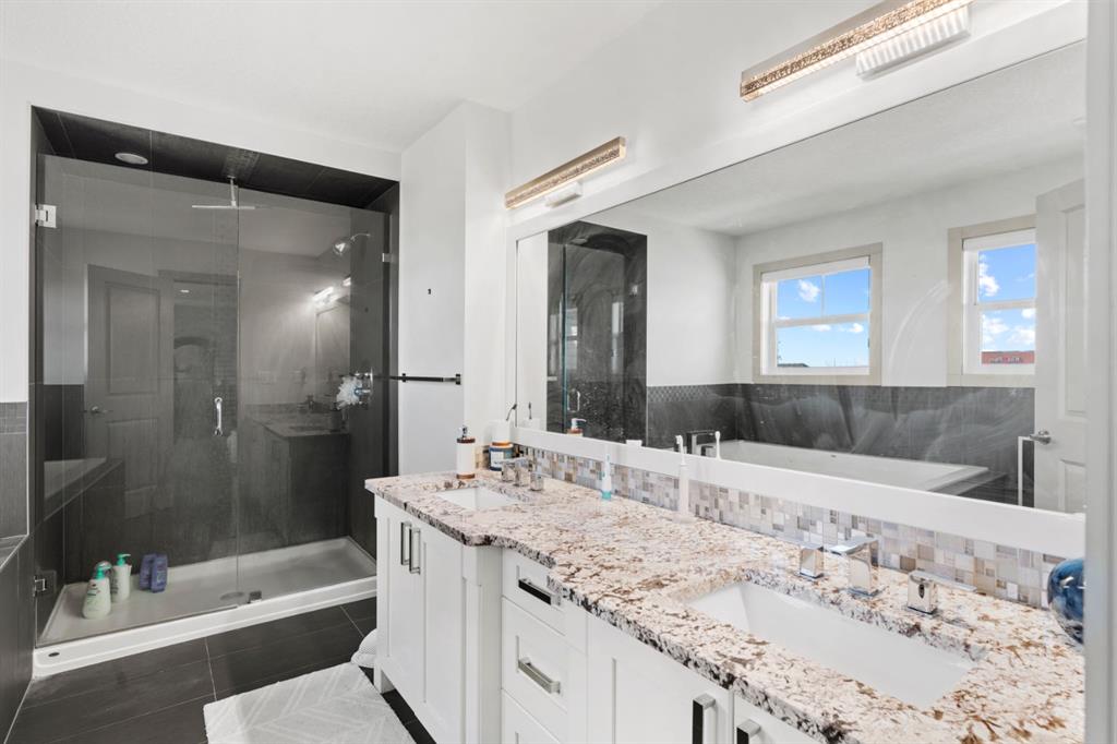 Upstairs, you’ll find four spacious bedrooms, including a luxurious primary suite complete with a spa-inspired ensuite, soaker tub, dual vanities, and a walk-in closet.
