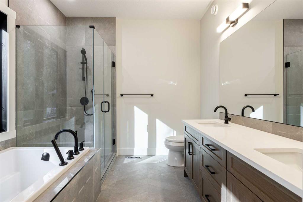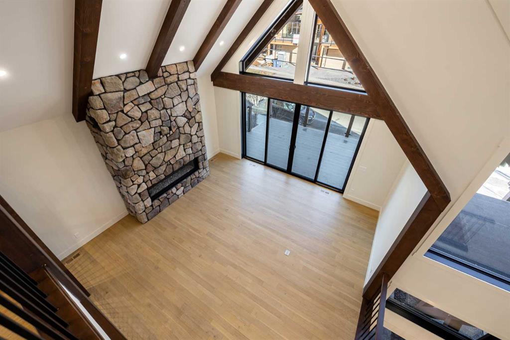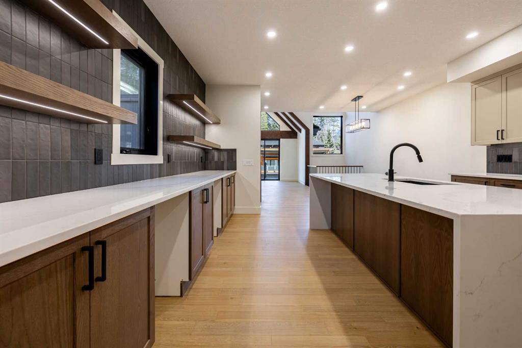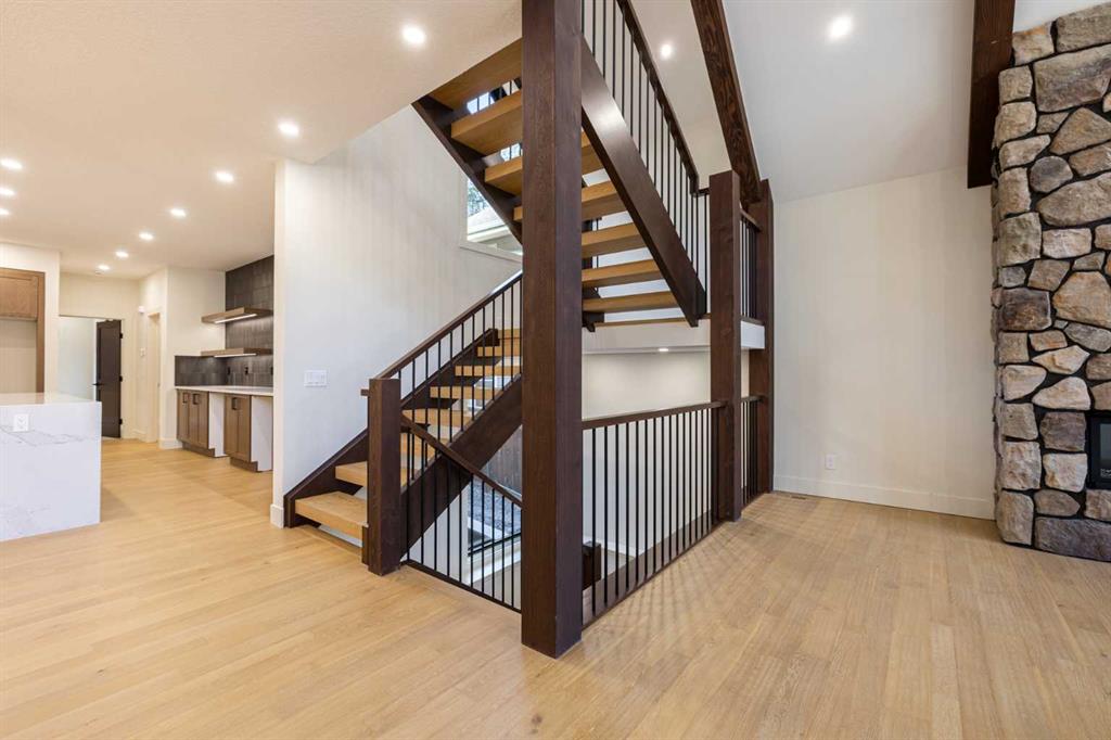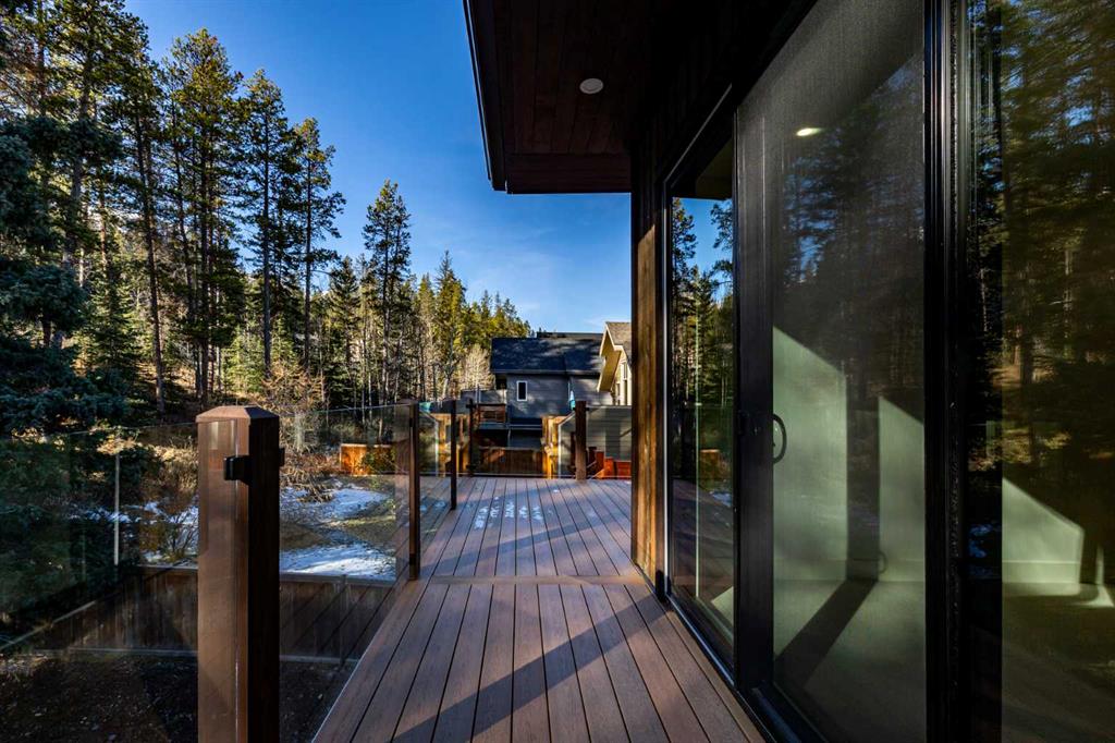 Welcome to this exceptional 3,197 sq. ft. mountain retreat (2,045 sq. ft. above grade), a home that blends sophisticated style with breathtaking natural surroundings. Set against the stunning backdrop of an environmental reserve and with convenient access to downtown Canmore, it offers an unparalleled blend of mountain living and modern luxury. With a total of 4 bedrooms and 3.5 baths, this home is thoughtfully designed for relaxation and entertaining, perfect for those looking to immerse themselves in the beauty of the Rockies while enjoying the finest in modern living. The ranch-style exterior features professional front landscaping and an aggregate driveway that leads to a dbl-attached garage, complete with epoxy-coated floors for a polished and practical finish. Glass railings encase the vinyl deck at the front, offering a stylish touch to your unobstructed views. A built-in BBQ gas line makes outdoor cooking convenient, while the back deck includes similar glass railings and a dura deck surface for durability and low maintenance. Expansive windows capture gorgeous views, bringing the surrounding natural beauty indoors. Enjoy direct access to the double-attached garage, making entry and storage convenient for your everyday needs before inviting warmth welcomes you with two well-sized bedrooms, a full bathroom, and tile flooring throughout. A spacious family room offers a cozy space for gatherings, and large windows flood the lower level with natural light. Head to your main floor, which is the heart of the home, featuring elegant Giverny Oak hardwood flooring in the open-concept living and dining areas. A stone-surround gas fireplace offers a rustic focal point, set against vaulted, beamed ceilings in the great room, which add height and a touch of rustic elegance. Sliding glass patio doors open onto the front deck, where you can grill with the gas BBQ line and enjoy the mountain air. The kitchen is a chef’s dream, boasting quartz countertops, dual-tone cabinets with under-cabinet lighting, and a stylish backsplash. A $10,000 appliance credit allows you to personalize the space with your choice of appliances. Adjacent to the kitchen, you’ll find one of two primary bedrooms that includes a private 5-pc ensuite! Ascend to the exclusive upper floor, entirely dedicated to a luxurious primary suite. This private retreat includes a plush carpeted bedroom, an expansive flex space for a personal office, reading nook, or even a fitness area, and access to a large balcony—ideal for a morning coffee with a view. The spa-like ensuite is an indulgent escape, with a glass-enclosed shower, a separate soaking tub, and “yours and mine” sinks, all designed to provide a serene experience. Luxury lives here. Don’t miss the opportunity to make this retreat your own! SOME PHOTOS ARE VIRTUALLY STAGED.