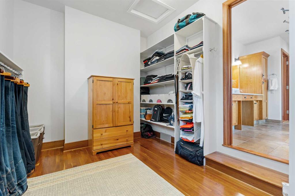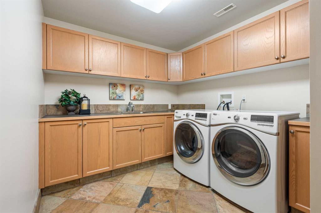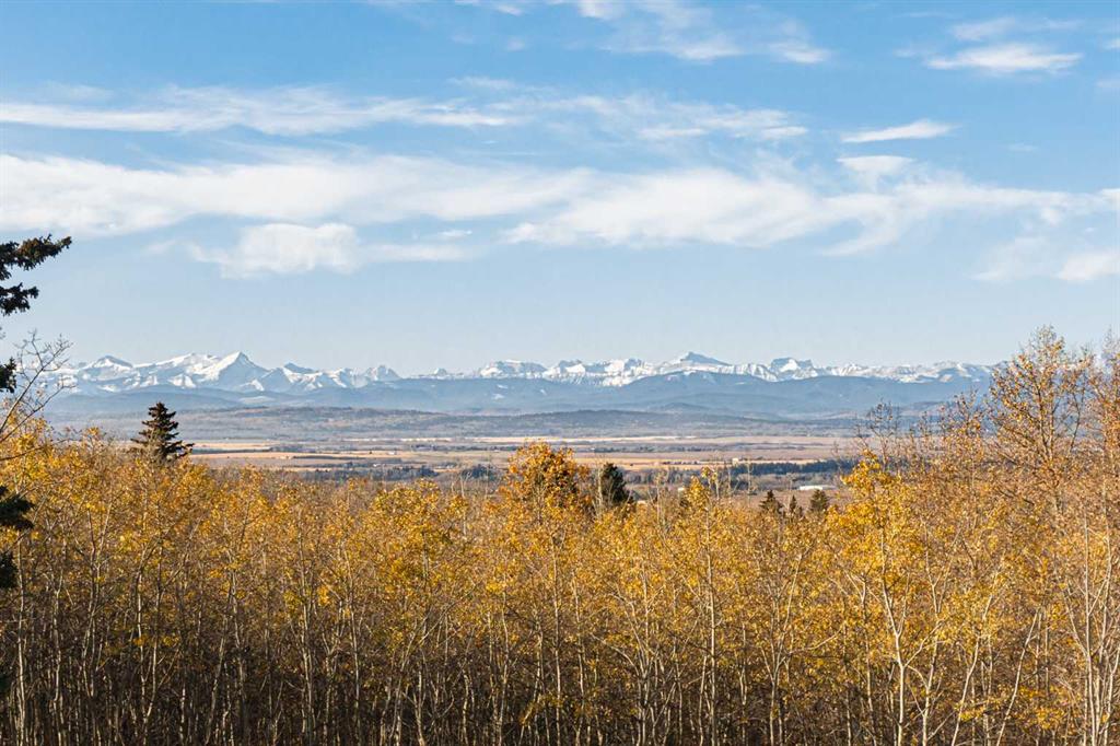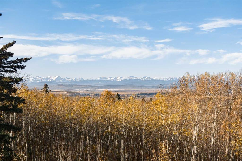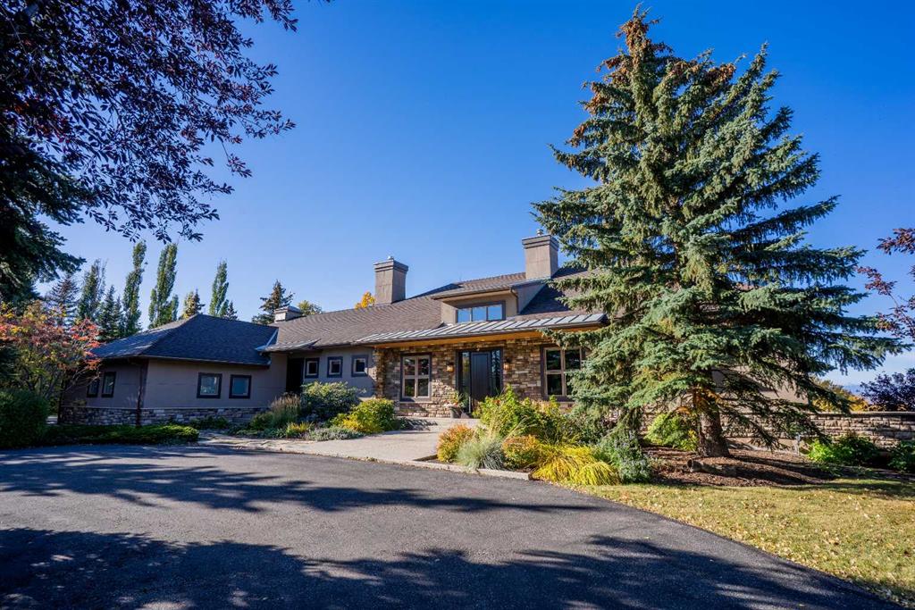 This exceptional, one-of-a-kind property offers the best of Springbank living — privacy, tranquillity, and breathtaking Rocky Mountain views. Set on a picturesque 2.17-acre lot in the heart of Pinnacle Ridge, this walkout bungalow sits high on the ridge, surrounded by beautifully landscaped grounds that provide seclusion from the street and neighbours. Tucked away from main roads, the property features its own private ravine, approximately one acre of mature trees and natural landscape, offering beauty and privacy while minimizing yard maintenance. A circular driveway flanked by mature trees sets the tone from the moment you arrive — this is truly something special. Inside, you’re greeted by stunning mountain vistas and an open layout. The beautifully renovated kitchen features a large island, granite countertops, and high-end appliances, including a Sub-Zero refrigerator, wine fridge, microwave, and 48” Wolf gas range. It opens to a bright dining space and sitting area with access to the large main deck (23′ x 22′). The spacious living room, complete with a fireplace, perfectly frames the magnificent mountain backdrop. The main-floor primary suite offers a luxurious six-piece ensuite and a generous walk-in closet. The main level also includes a home office, two powder rooms, a walk-in pantry, and a mudroom that connects to an oversized four-car garage. The 54′ x 26′ garage (1,279 sq. ft.) is insulated, drywalled, painted, and finished with epoxy flooring, with half the space offering a 12’3” ceiling that is ideal for large trucks or lifts. The walkout lower level features a large recreation room, a wet bar that seats up to ten, a dedicated theatre room, three additional bedrooms, and two full baths. Cherry hardwood and tile flooring flow throughout the home, with wool carpet in the lower-level bedrooms for added comfort. The exterior showcases stucco and stone, complemented by a newer asphalt shingle roof (2020, 50-year warranty). An enclosed under-deck storage room is ideal for garden tools or a ride-on mower. This immaculate property has been meticulously maintained by its current owners, with recent mechanical upgrades including two new furnaces with humidifiers (2019) and two new air-conditioning units (2024). A truly remarkable estate combining privacy, panoramic views, and refined living in one of Springbank’s most sought-after locations.
