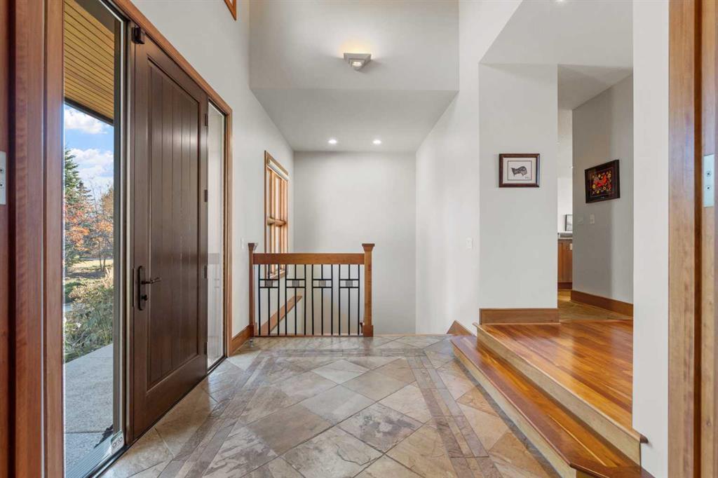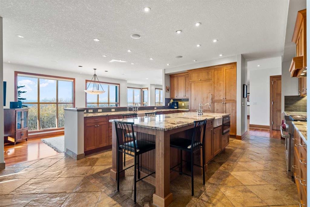 This exceptional, one-of-a-kind property offers the best of Springbank living — privacy, tranquillity, and breathtaking Rocky Mountain views. Set on a picturesque 2.17-acre lot in the heart of Pinnacle Ridge, this walkout bungalow sits high on the ridge, surrounded by beautifully landscaped grounds that provide seclusion from the street and neighbours. Tucked away from main roads, the property features its own private ravine, approximately one acre of mature trees and natural landscape, offering beauty and privacy while minimizing yard maintenance. A circular driveway flanked by mature trees sets the tone from the moment you arrive — this is truly something special. Inside, you’re greeted by stunning mountain vistas and an open layout. The beautifully renovated kitchen features a large island, granite countertops, and high-end appliances, including a Sub-Zero refrigerator, wine fridge, microwave, and 48” Wolf gas range. It opens to a bright dining space and sitting area with access to the large main deck (23′ x 22′). The spacious living room, complete with a fireplace, perfectly frames the magnificent mountain backdrop. The main-floor primary suite offers a luxurious six-piece ensuite and a generous walk-in closet. The main level also includes a home office, two powder rooms, a walk-in pantry, and a mudroom that connects to an oversized four-car garage. The 54′ x 26′ garage (1,279 sq. ft.) is insulated, drywalled, painted, and finished with epoxy flooring, with half the space offering a 12’3” ceiling that is ideal for large trucks or lifts. The walkout lower level features a large recreation room, a wet bar that seats up to ten, a dedicated theatre room, three additional bedrooms, and two full baths. Cherry hardwood and tile flooring flow throughout the home, with wool carpet in the lower-level bedrooms for added comfort. The exterior showcases stucco and stone, complemented by a newer asphalt shingle roof (2020, 50-year warranty). An enclosed under-deck storage room is ideal for garden tools or a ride-on mower. This immaculate property has been meticulously maintained by its current owners, with recent mechanical upgrades including two new furnaces with humidifiers (2019) and two new air-conditioning units (2024). A truly remarkable estate combining privacy, panoramic views, and refined living in one of Springbank’s most sought-after locations.