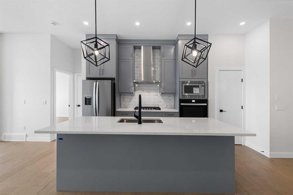 Welcome to The Stato by Luxe by Luxuria Homes, a beautifully designed bungalow-style townhome with no condo fees that blends luxury, functionality, and timeless appeal in the sought-after community of Wedderburn, Okotoks. Step inside and experience the feeling of space created by 10-foot ceilings and a bright, open-concept layout. Elegant wall wainscoting adds a touch of sophistication throughout the main living areas and primary bedroom, while upgraded lighting enhances every room with a warm, inviting ambiance. The gourmet kitchen features built-in appliances, quartz countertops, and a gas cooktop, opening onto a spacious dining area that’s perfect for gatherings. The great room centers around a beautiful tiled fireplace with a mantle, adding warmth and character for both everyday living and entertaining. The primary suite offers a true retreat with a walk-in closet featuring built-in shelving and a spa-inspired ensuite complete with a tiled shower and double vanities. A built-in bench in the mudroom adds practical style and convenience, while a versatile front den provides space for a home office or reading nook. The walkout basement is framed for future development, giving you the flexibility to finish it when the time is right. Enjoy outdoor living with a large rear deck with stairs, plus a covered concrete patio below for quiet relaxation. The double attached garage provides everyday ease, and the no-condo-fee lifestyle means more freedom and flexibility. Located in North Okotoks, Wedderburn offers scenic walking paths, green spaces, and quick access to local shops, dining, and essential amenities, all just 15 minutes from South Calgary. 27 Wolf Crescent is more than a home. It’s a refined, low-maintenance lifestyle designed for comfort and connection.