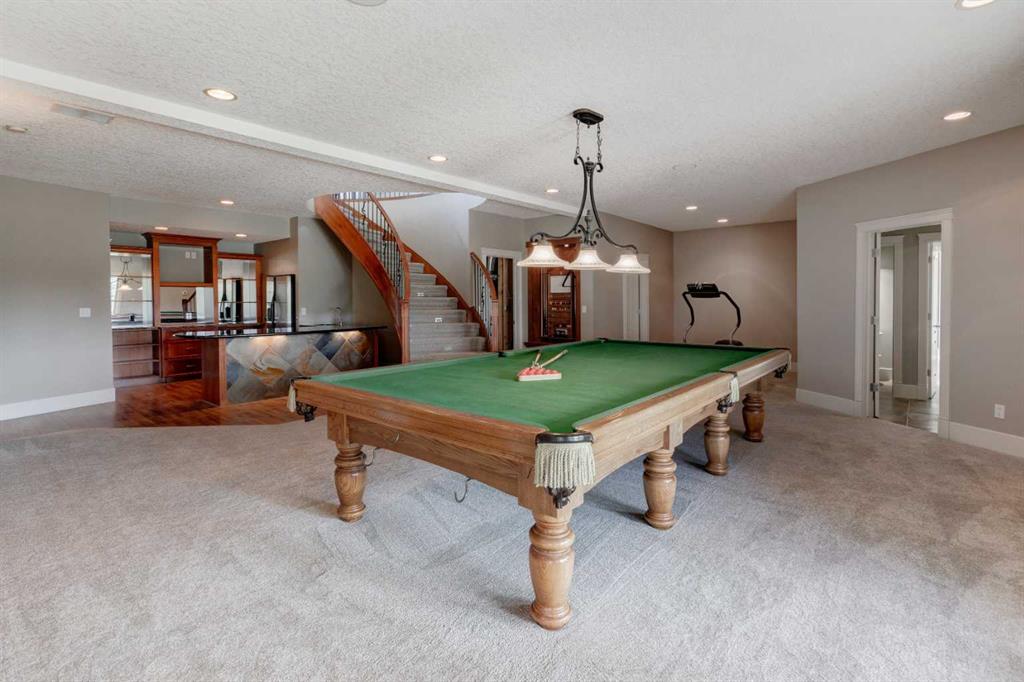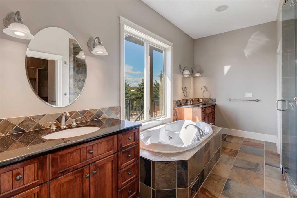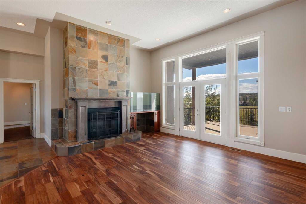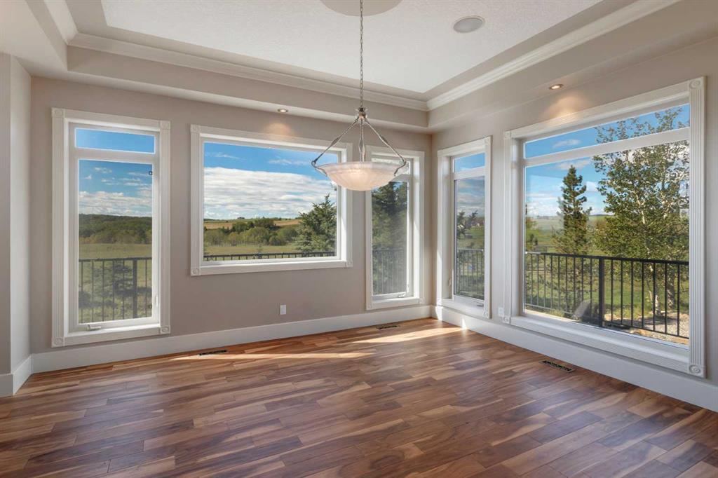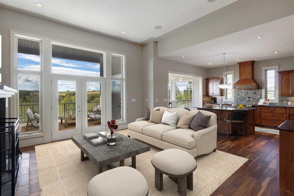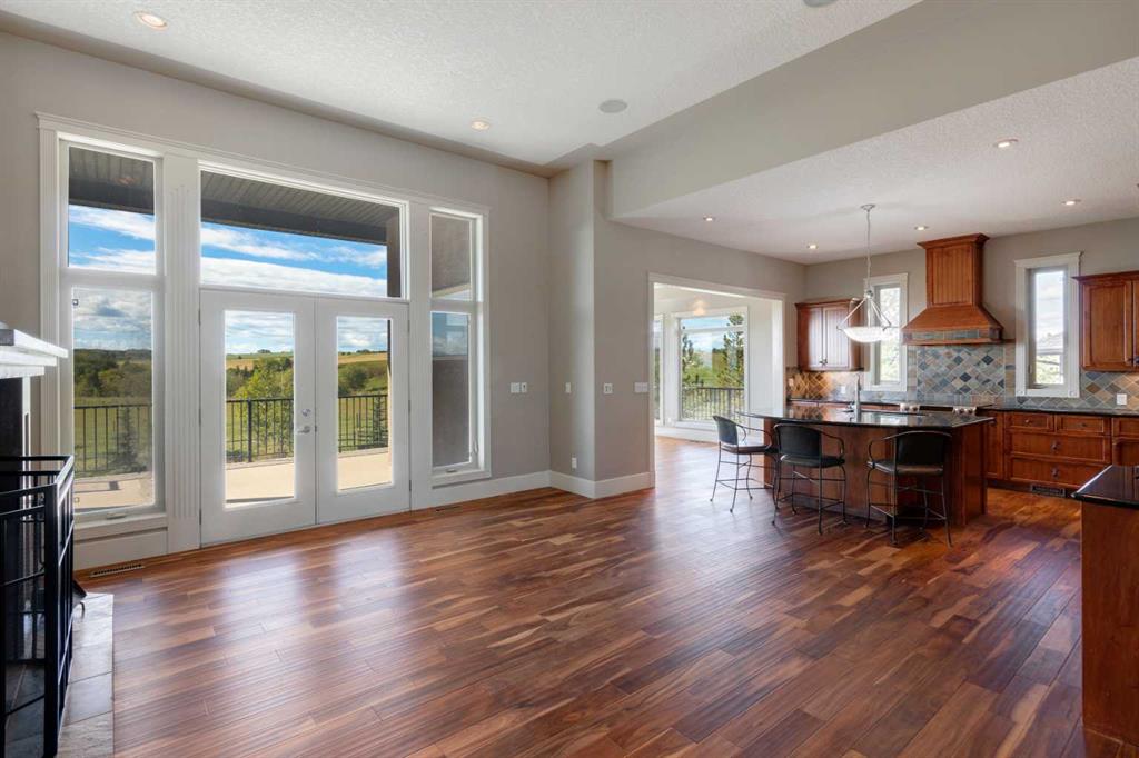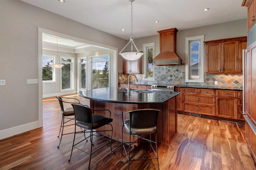 Experience seclusion and tranquility on this private 15 acre estate. Bordering the Horse Creek environmental reserve, sweeping views of rolling hills and countryside pasture impress from every angle. Access miles of walking and equestrian trails just off property which provide access to serene nature and panoramic mountain views. This thoughtfully planned, elegant Bungalow provides over 5500 total developed square feet and the 1700 sq. ft. barn/shop frames the perfect backdrop for an equestrian setting or workshop away from the hustle and bustle of the city. This extraordinary property is located minutes away from Cochrane, offering the perfect investment for the discerning buyer interested in having a country-quiet, yet city close acreage lifestyle with all the luxuries, along with the unique and incredibly valuable ability to subdivide the property. This is truly a lifestyle of elegance, privacy, and enduring value. Crafted with quality, this residence is luxurious western country living at its finest, boasting meticulous, timeless design with an expansive interior that will truly awe you. Stepping into the entrance you’re greeted by soaring 14’ ceilings into an inviting haven perfect for hosting memorable gatherings with friends and family. New hardwood floors throughout the living room, kitchen and dining room, and a grand wood-burning fireplace are warm and inviting. For the chef in the family, the kitchen is a dream come true, featuring a Subzero fridge, huge island, prep sink, and ample storage. The primary bedroom offers new hardwood flooring and stunning sunset mountain views. The ensuite is a sanctuary unto itself, featuring a deep soaker tub, a steam shower, double sinks, and an enviable closet. Descend the beautiful spiral staircase to the walkout lower level, where you’ll once again be struck by the attention to detail. A wall of expansive windows illuminates a bright seating area and patio, roughed in for hot tub. Adjacent to the custom designed bar, you’ll discover a wine room where you can collect, showcase, and savour your favourite wines. This level features a family room with snooker table, a dedicated theatre room with gas fireplace, gym area and a sunroom/den. In addition, for the independent family member or caretaker is a legal one-bedroom suite with a full Kitchen and separate entrance. The oversized triple car garage is also equipped with in-floor heat and has ample space to accommodate a full-size truck. In addition, the heated barn/shop awaits with 576 sq. ft. attached overhang ideal for hay storage or parking oversized equipment. Currently set up for horse barn with six portable indoor stalls, interior standpipe for water, 16’ aisle way, large, separate tack/tool room, one man door and two oversized doors. Potential space for a 125 x 250 riding arena adjacent to the barn. Two exterior standpipes, plus one automatic waterer. Cross fencing and paddocks with three plywood horse shelters.