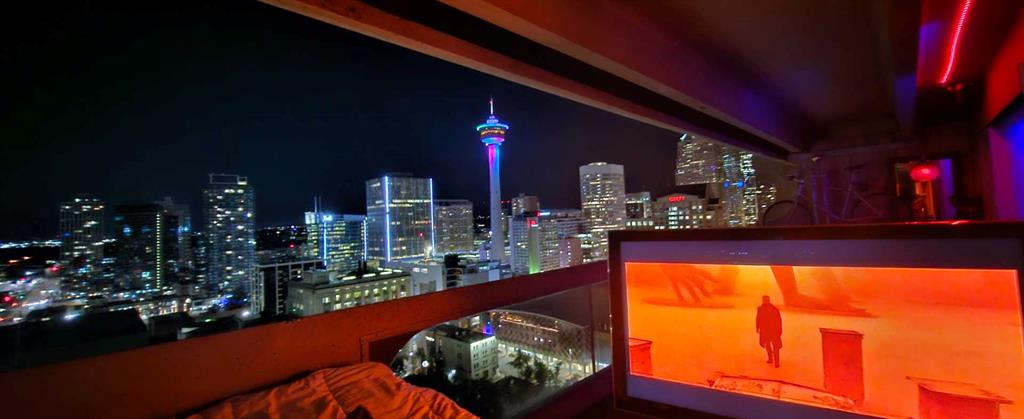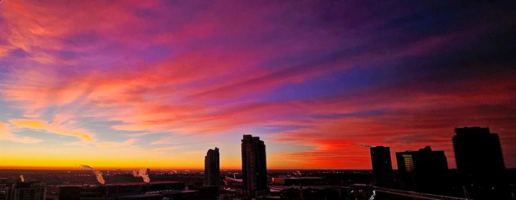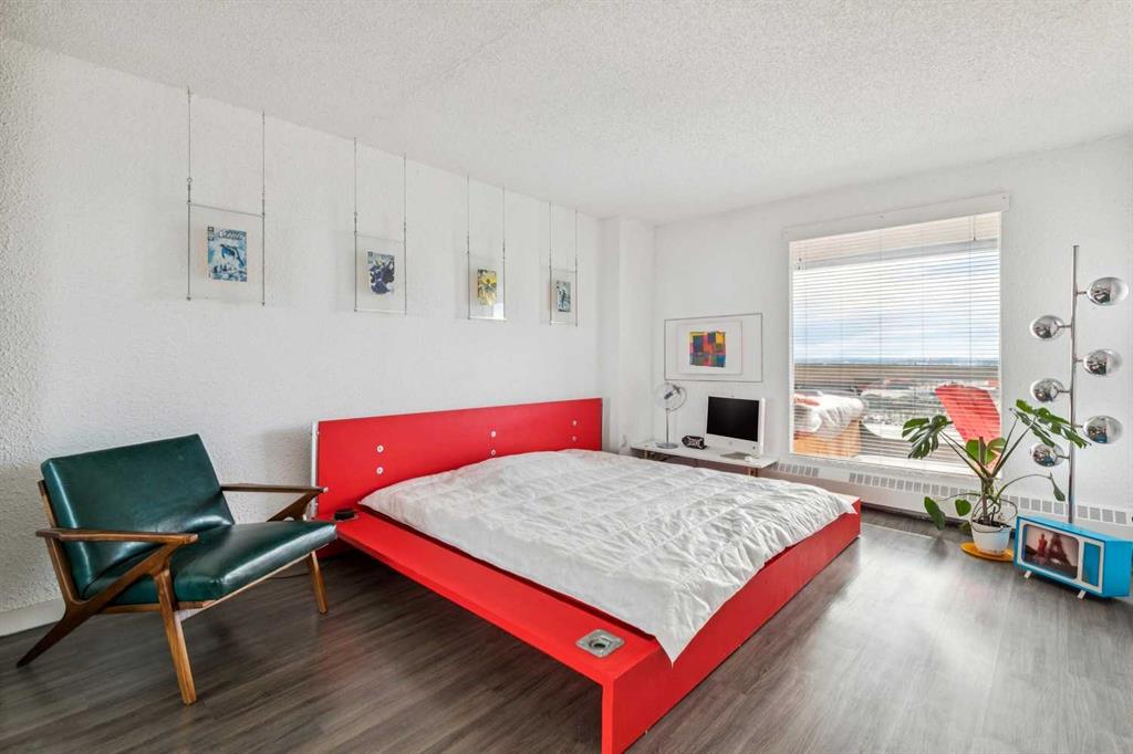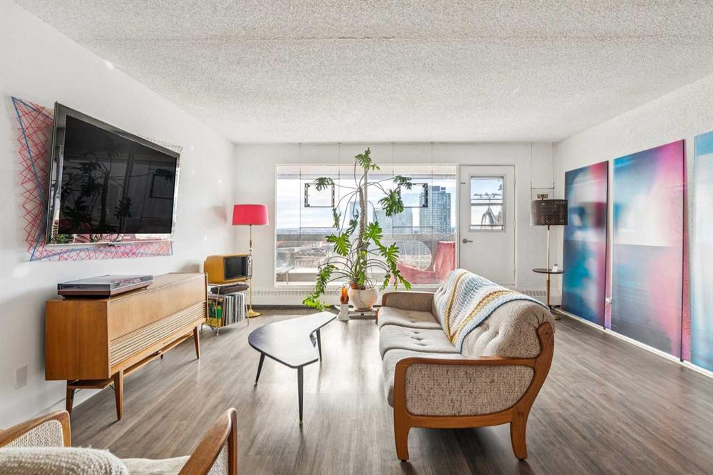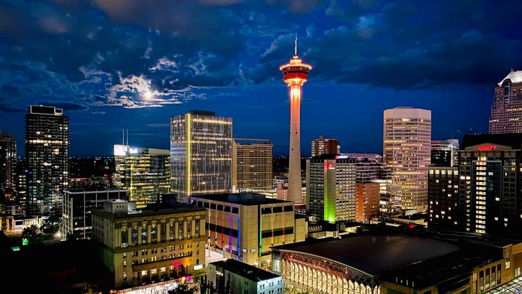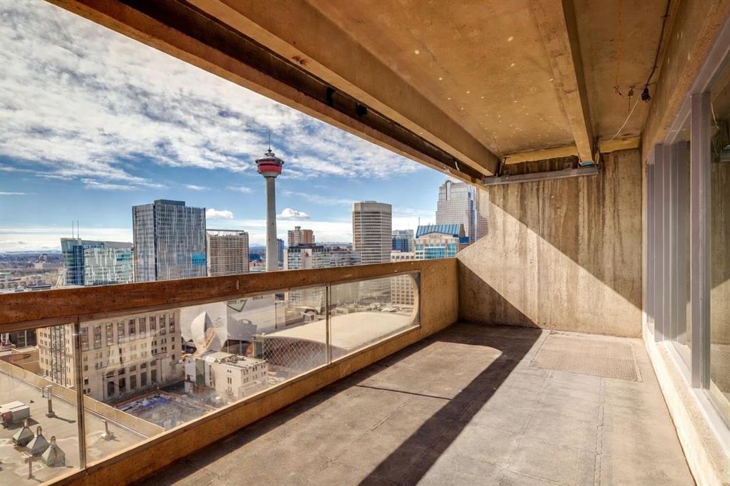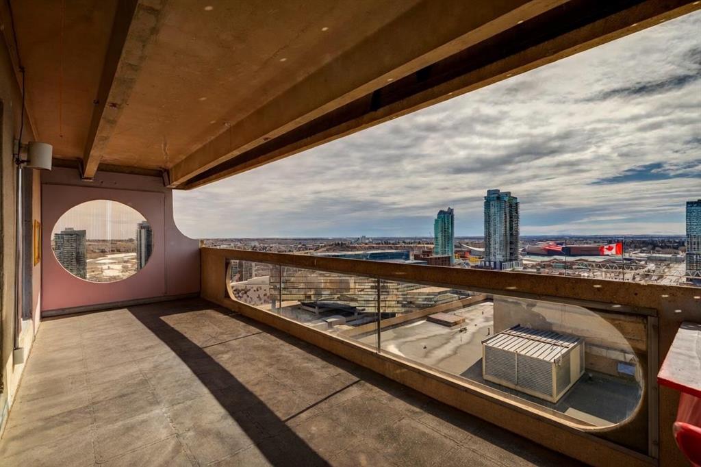 Perched on the “almost” top floor corner, this rare offering delivers unobstructed, panoramic views with a coveted south exposure and an expansive private deck—perfect for taking in Calgary’s ever-changing skyline. This large one-bedroom unit features polished concrete floors, an updated bathroom, and a minimalist mid-century kitchen that complements the building’s striking design. Selected as an inspirational creative space, the home was chosen for its architectural character and truly exceptional vantage points. Wake up to sweeping views of the Rockies visible right from bed, and enjoy the dynamic glow of the Calgary Tower lighting up the night sky without ever lifting your head from the pillow. The southwest exposure showcases peak skyline vistas, while the living room continues the experience with uninterrupted mountain views. One of only three units in the building offering a remarkable 270-degree perspective, the outlook begins with a uniquely framed circular view toward East Village, delivering unforgettable sunrise moments. A secure, heated parking stall is included. Set within a solid concrete building—where high-floor units like this rarely come to market—this home also includes a den or office (currently used as storage), along with free coin laundry conveniently located on the same floor. The building is exceptionally secure and ideally situated next to the U.S. Consulate. An incredible opportunity to own a distinctive, design-forward space with some of the best views in the city—all at an outstanding price point.