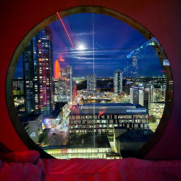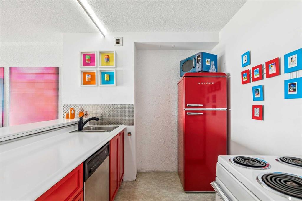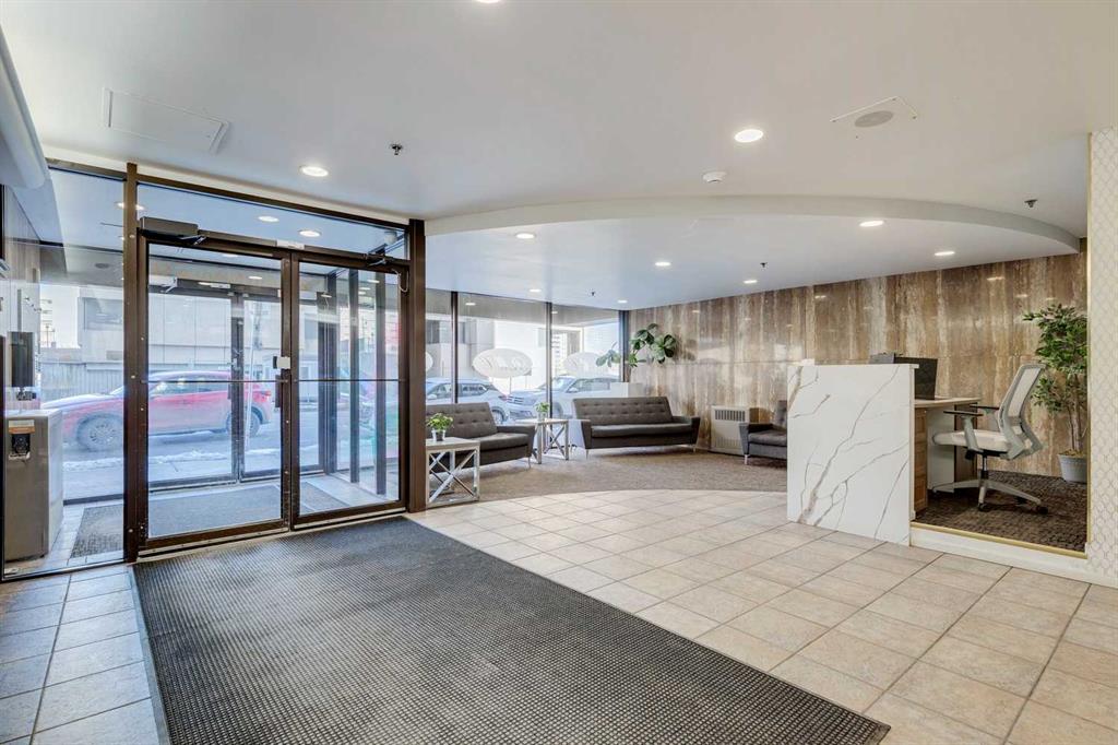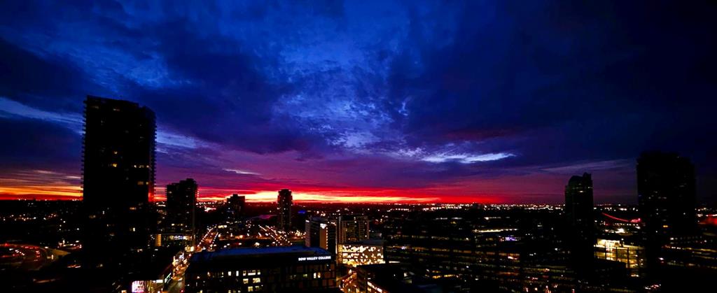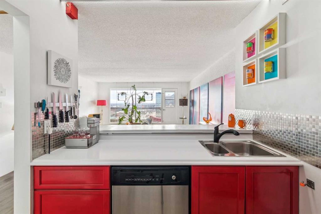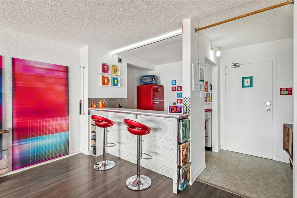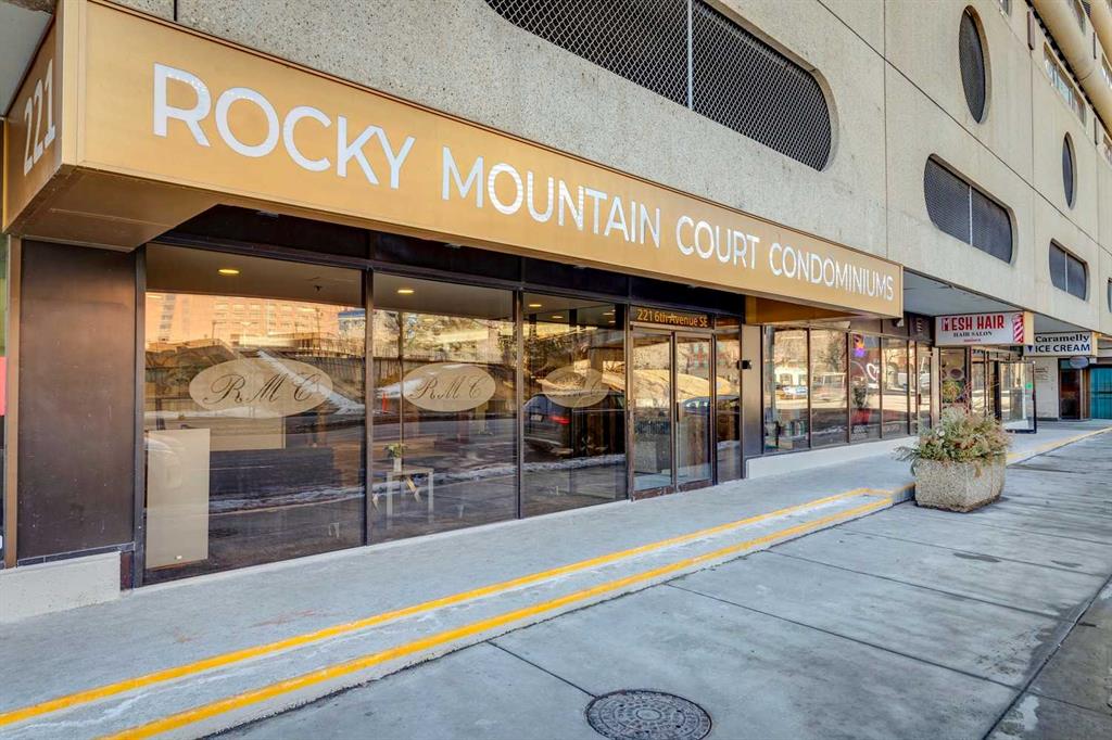 Perched on the “almost” top floor corner, this rare offering delivers unobstructed, panoramic views with a coveted south exposure and an expansive private deck—perfect for taking in Calgary’s ever-changing skyline. This large one-bedroom unit features polished concrete floors, an updated bathroom, and a minimalist mid-century kitchen that complements the building’s striking design. Selected as an inspirational creative space, the home was chosen for its architectural character and truly exceptional vantage points. Wake up to sweeping views of the Rockies visible right from bed, and enjoy the dynamic glow of the Calgary Tower lighting up the night sky without ever lifting your head from the pillow. The southwest exposure showcases peak skyline vistas, while the living room continues the experience with uninterrupted mountain views. One of only three units in the building offering a remarkable 270-degree perspective, the outlook begins with a uniquely framed circular view toward East Village, delivering unforgettable sunrise moments. A secure, heated parking stall is included. Set within a solid concrete building—where high-floor units like this rarely come to market—this home also includes a den or office (currently used as storage), along with free coin laundry conveniently located on the same floor. The building is exceptionally secure and ideally situated next to the U.S. Consulate. An incredible opportunity to own a distinctive, design-forward space with some of the best views in the city—all at an outstanding price point.