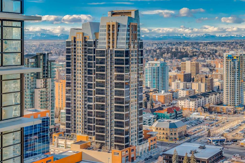 Spectacular Downtown Skyline Views from the 27th Floor! Welcome to this stylish 1-bedroom, 1-bathroom condo offering 589 sq. ft. of modern living space in the desirable Nuera building. Perched on the 27th floor, this home showcases breathtaking 180-degree downtown skyline views, including the Calgary Tower, through stunning floor-to-ceiling windows. The open-concept layout is bright and functional, seamlessly connecting the living and dining areas. The contemporary kitchen features mocha-stained maple cabinetry, mosaic tile backsplash, under-cabinet lighting, and built-in dining table that doubles as a workspace. Step onto your private balcony to enjoy the vibrant city views, or wake up to the skyline from the spacious primary bedroom. Additional highlights include in-suite laundry, a storage locker, and a titled heated underground parking stall. Nuera offers a fully equipped fitness centre and smart HVAC air circulation technology. Ideally located steps from downtown, the BMO Centre, LRT, and the shops and restaurants of 17th Avenue, this home delivers the ultimate inner-city lifestyle.