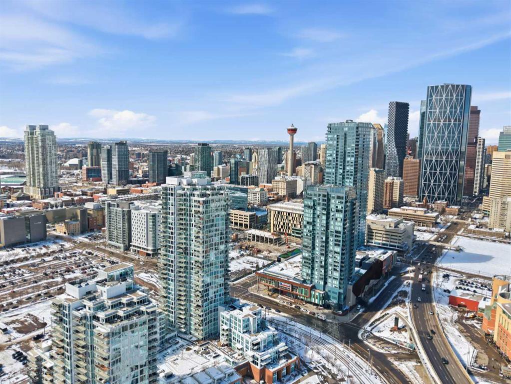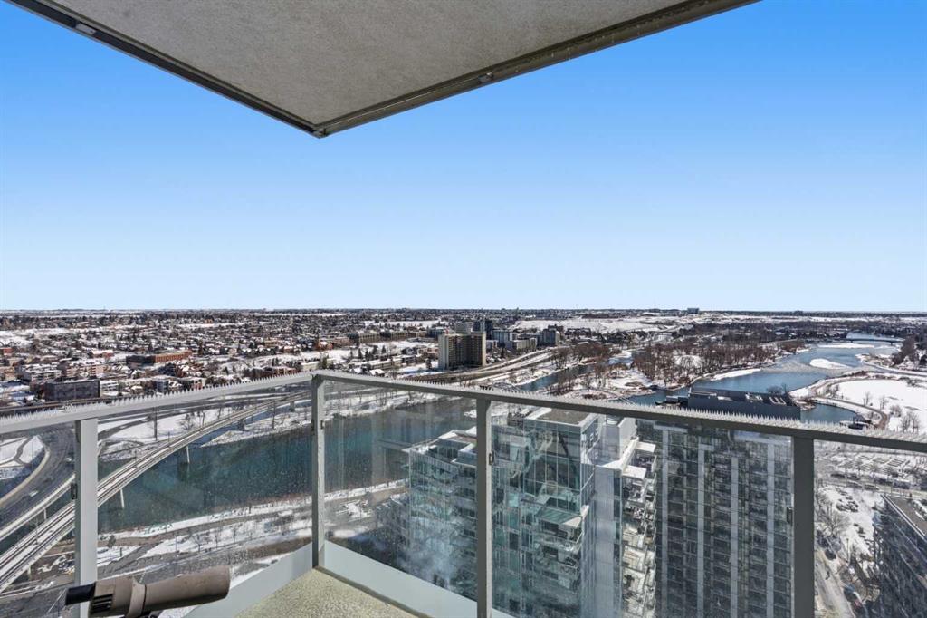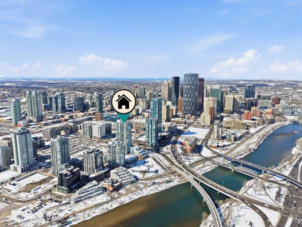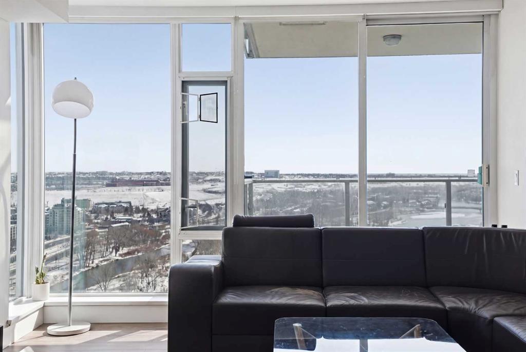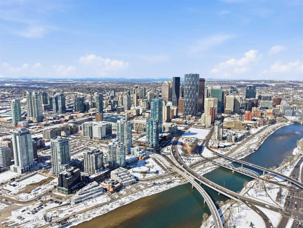 Exceptional and stunning three-view panorama from the 27th floor, showcasing the Mountain, Bow River, and Downtown skyline. This luxurious, generously proportioned two-bedroom, two-bath residence offers an open-concept 1,200+ SF of living space with floor-to-ceiling glass that reveals dramatic vistas throughout the day. The morning sun pours through the east-facing, air-conditioned suite, waking a generous living-dining space that flows into a gourmet kitchen—granite island and backsplash gleaming beside a pantry and top-tier stainless steel appliances, including a five-burner gas stove and under-cabinet lighting. A master retreat awaits with a walk-in closet and a five-piece ensuite warmed by in-floor heating, while a second bedroom offers in-floor heating and convenient laundry with a second bath. This is one of the tower’s largest units, with tandem underground parking for two and extra storage. Beyond the walls, the building invites: a gym, steam room, sauna, and a social lounge with a kitchen; a second-level terrace and rooftop garden for al fresco gatherings; 24-hour concierge and ample visitor parking. Step outside to riverfront strolls, parks, C-Train access, a library, Superstore, and a chef’s lineup of dining options. An expansive 140+ SF east-facing balcony frames panoramic views, redefining downtown luxury living at its finest. A Schedule “A” must accompany all offers to purchase.