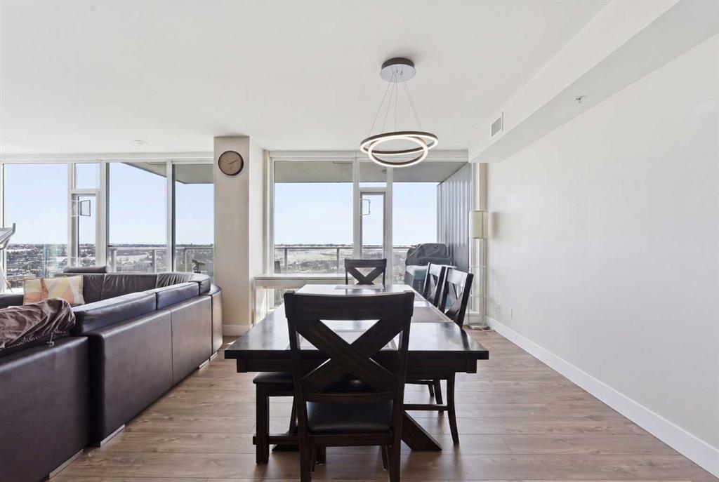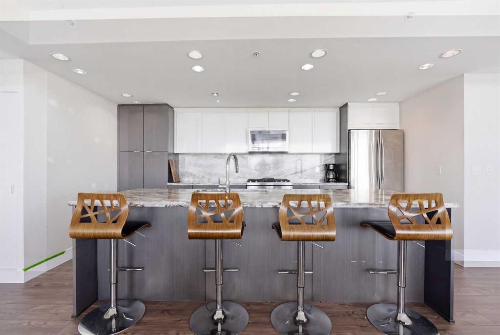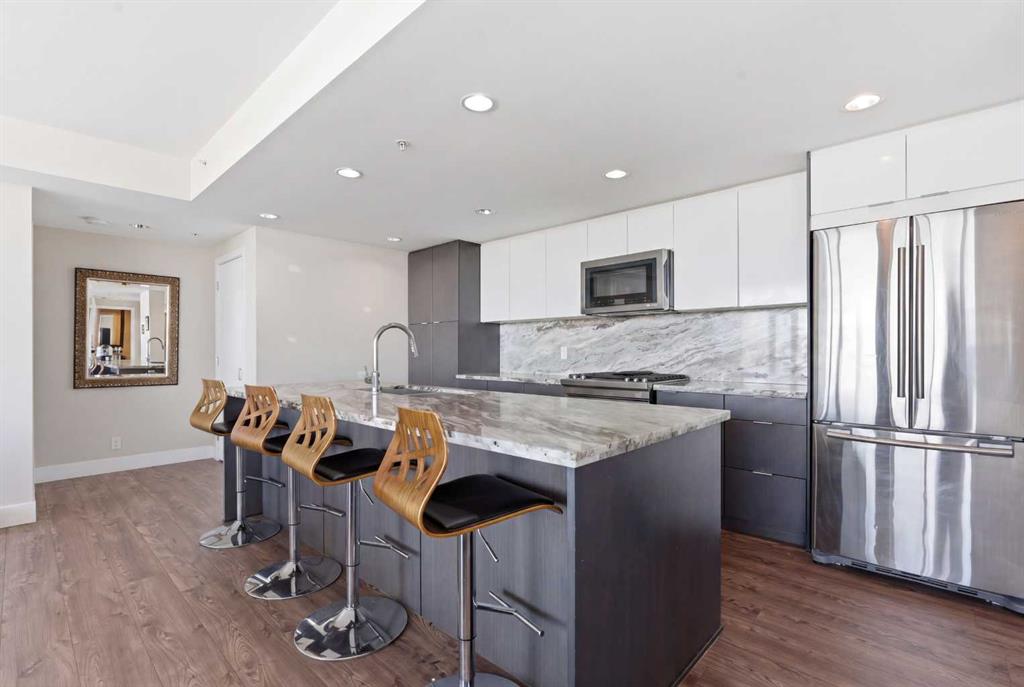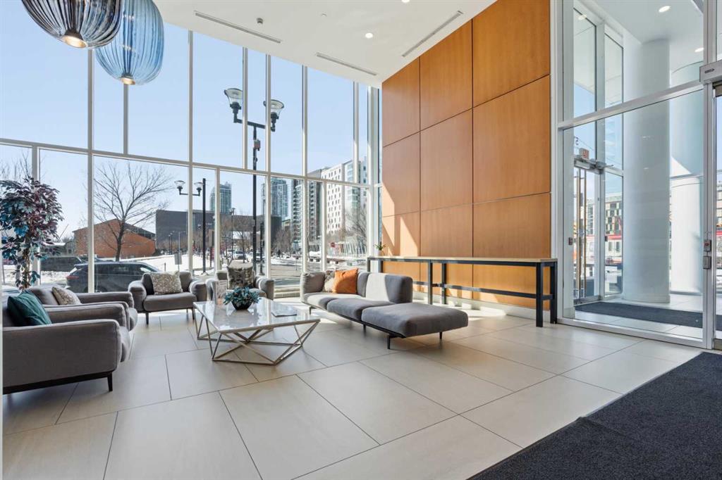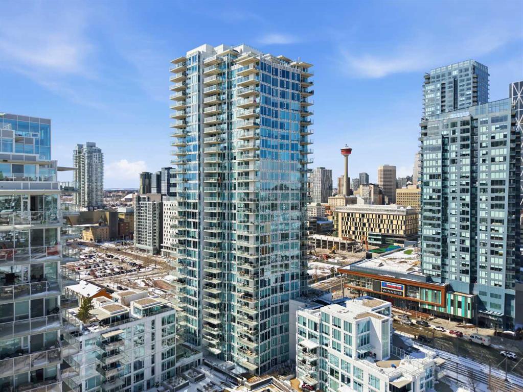 Exceptional and stunning three-view panorama from the 27th floor, showcasing the Mountain, Bow River, and Downtown skyline. This luxurious, generously proportioned two-bedroom, two-bath residence offers an open-concept 1,200+ SF of living space with floor-to-ceiling glass that reveals dramatic vistas throughout the day. The morning sun pours through the east-facing, air-conditioned suite, waking a generous living-dining space that flows into a gourmet kitchen—granite island and backsplash gleaming beside a pantry and top-tier stainless steel appliances, including a five-burner gas stove and under-cabinet lighting. A master retreat awaits with a walk-in closet and a five-piece ensuite warmed by in-floor heating, while a second bedroom offers in-floor heating and convenient laundry with a second bath. This is one of the tower’s largest units, with tandem underground parking for two and extra storage. Beyond the walls, the building invites: a gym, steam room, sauna, and a social lounge with a kitchen; a second-level terrace and rooftop garden for al fresco gatherings; 24-hour concierge and ample visitor parking. Step outside to riverfront strolls, parks, C-Train access, a library, Superstore, and a chef’s lineup of dining options. An expansive 140+ SF east-facing balcony frames panoramic views, redefining downtown luxury living at its finest. A Schedule “A” must accompany all offers to purchase.