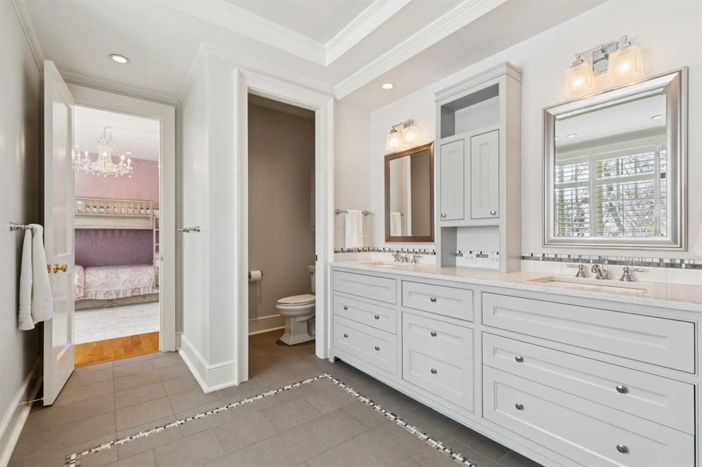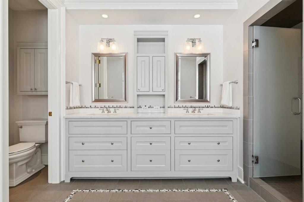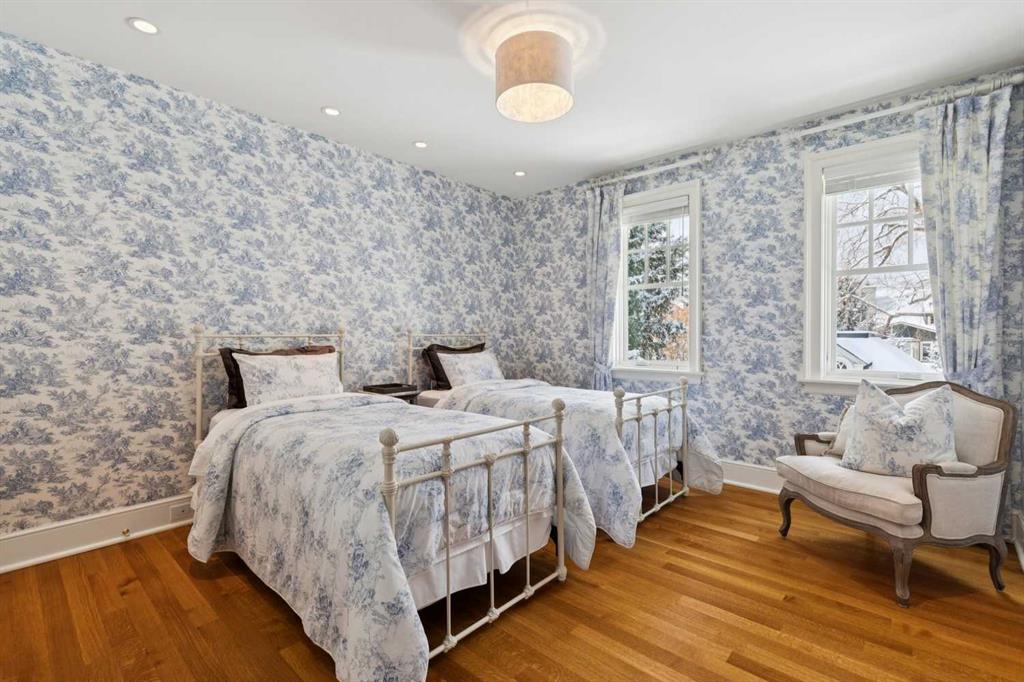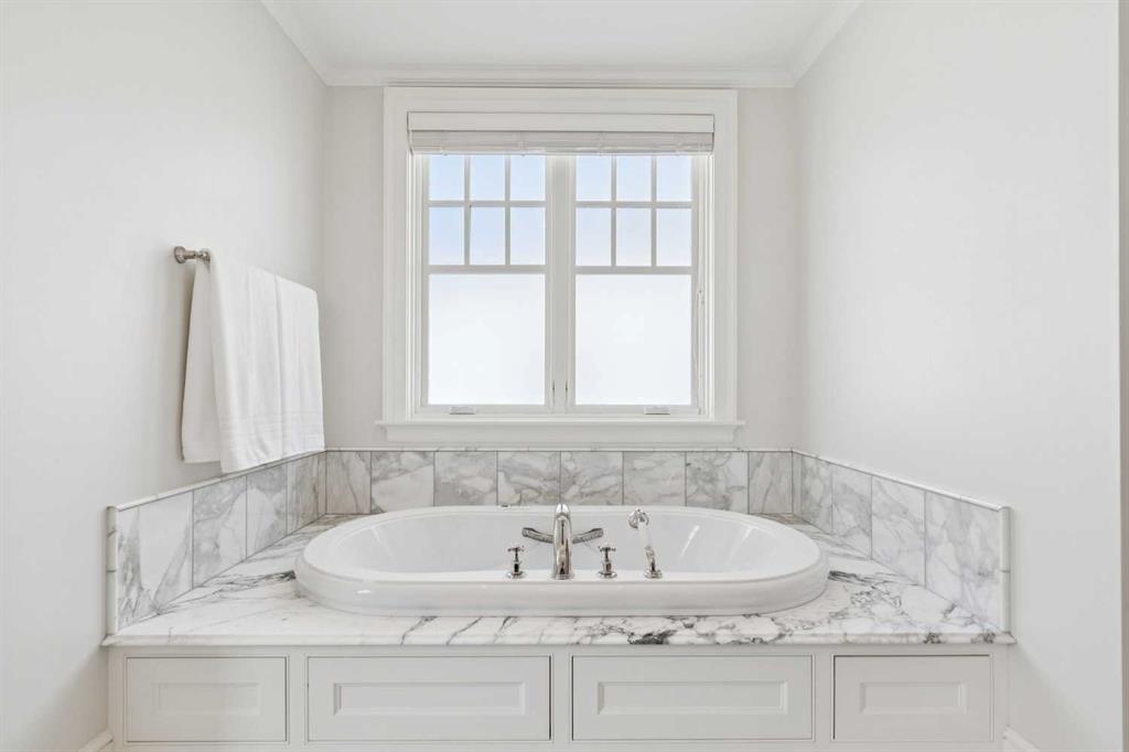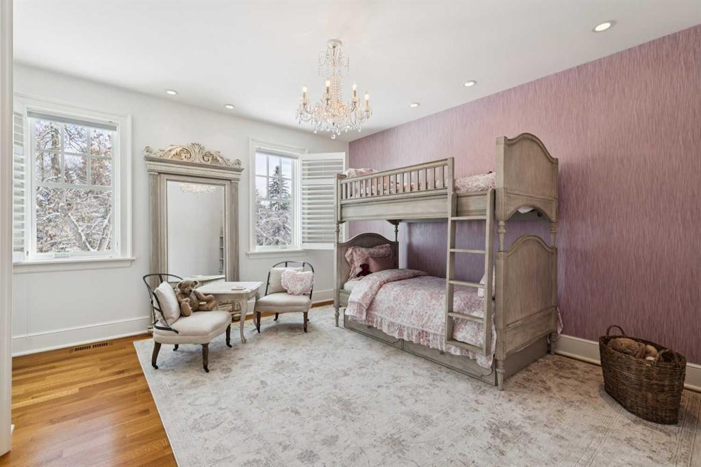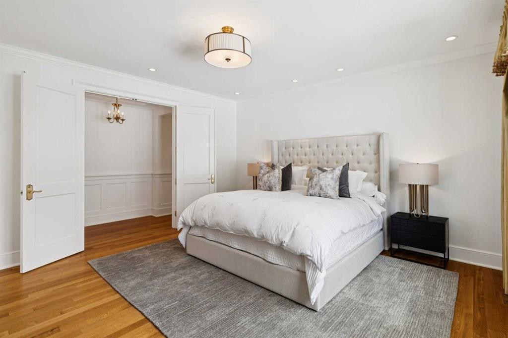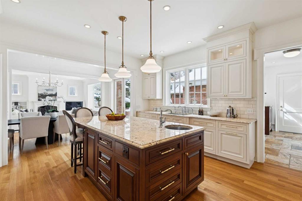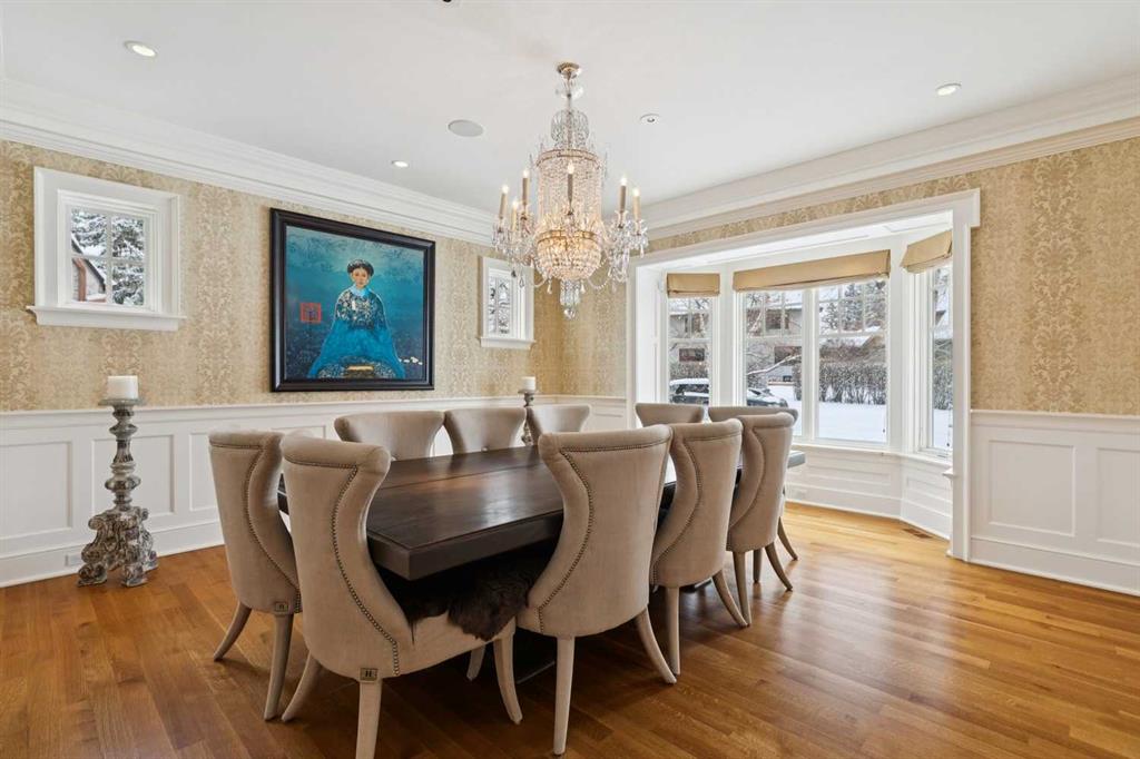 Georgian architecture meets uncompromising five-star luxury in this masterfully custom-built Mission residence (2013), offering nearly 7,000 square feet of impeccably curated living with six bedrooms, seven bathrooms, and hardwood flooring throughout. Ideally situated on an oversized lot in prestigious Upper Mount Royal, directly overlooking Talon Park, this residence represents a rare convergence of architectural integrity, craftsmanship, and location. Its stately presence is defined by a hand-cut brick and stone exterior, dual chimneys, and bespoke shutters, an enduring expression of timeless design. A central hall introduces interiors of exceptional refinement. The formal dining room is exquisitely appointed with hand-cut wainscoting, custom millwork, and tailored doors, creating a distinguished setting for entertainment. Opposite, a richly paneled walnut library offers a sense of quiet sophistication, complete with custom cabinetry, a Rumford masonry fireplace, and bespoke lighting, both intimate and impressive in equal measure. The chef’s kitchen is designed without compromise, featuring top-tier integrated appliances, an expansive island, a generous pantry, and finely crafted custom cabinetry. It transitions seamlessly into the informal dining area and an inviting family room, where French doors open to the outdoor living spaces. Here, a thoughtfully designed patio with BBQ area, built-in fireplace, and beautifully landscaped gardens extends the home’s living experience outdoors, perfectly suited for both elegant entertaining and relaxed daily living. The main floor is further complemented by a private office and a substantial mudroom with direct access to one of the two heated coach house garages. Upstairs, the primary suite is a private sanctuary, appointed with custom closets, silk drapery, and a spa-inspired ensuite featuring heated marble floors and an oversized thermomasseur tub. Generously scaled secondary bedrooms include a Jack-and-Jill bathroom, an additional private bedroom, and bathroom. A versatile upper lounge provides an expansive, secluded retreat for family or guests, complete with bedroom and bathroom, ideal for movies, study, or quiet relaxation. The fully developed lower level continues the home’s commitment to elevated living, offering a custom bar, dedicated movie area, games area, fitness space, steam room, and a laundry & arts room with ample storage, all meticulously designed to balance leisure, wellness, and practicality. Completing this exceptional offering are two heated coach house garages with capacity for four large vehicles, along with integrated sound and security systems. Properties of this calibre, defined by bespoke construction, architectural pedigree, and an irreplaceable setting are seldom available. This is a rare opportunity to acquire a truly distinguished residence in one of Calgary’s most coveted enclaves.