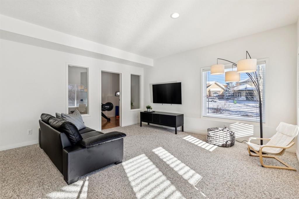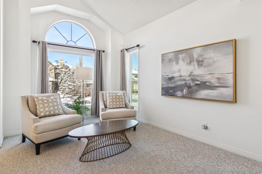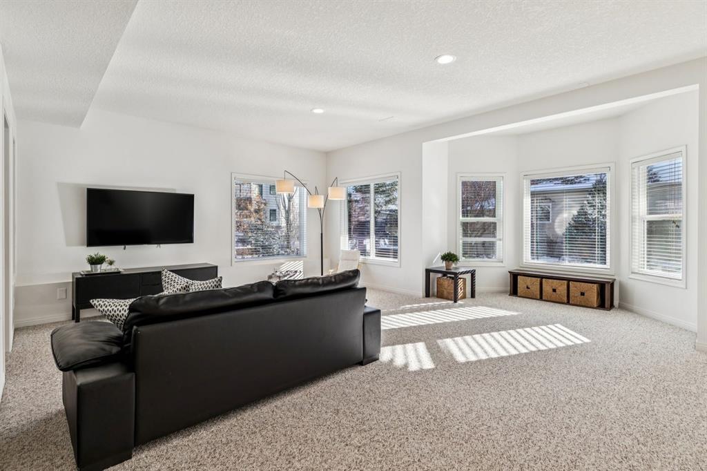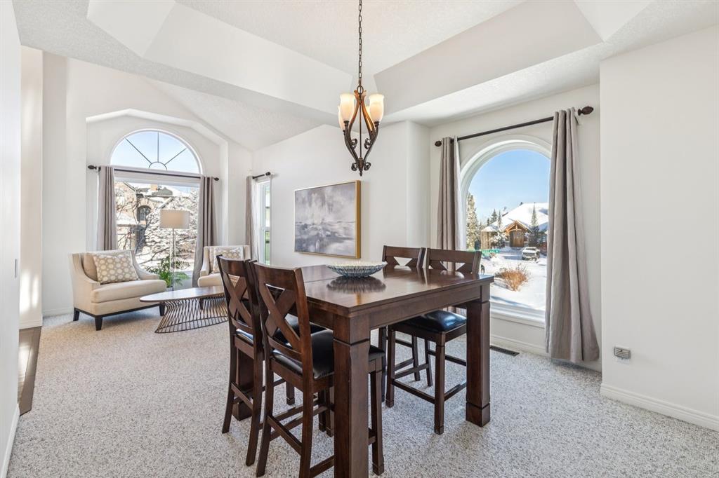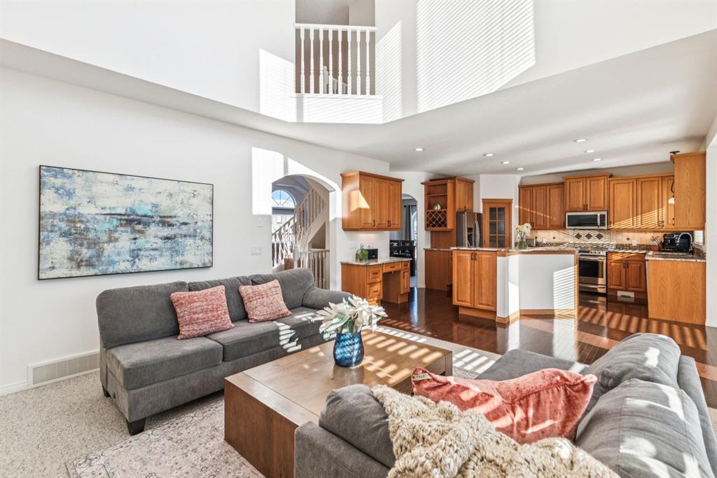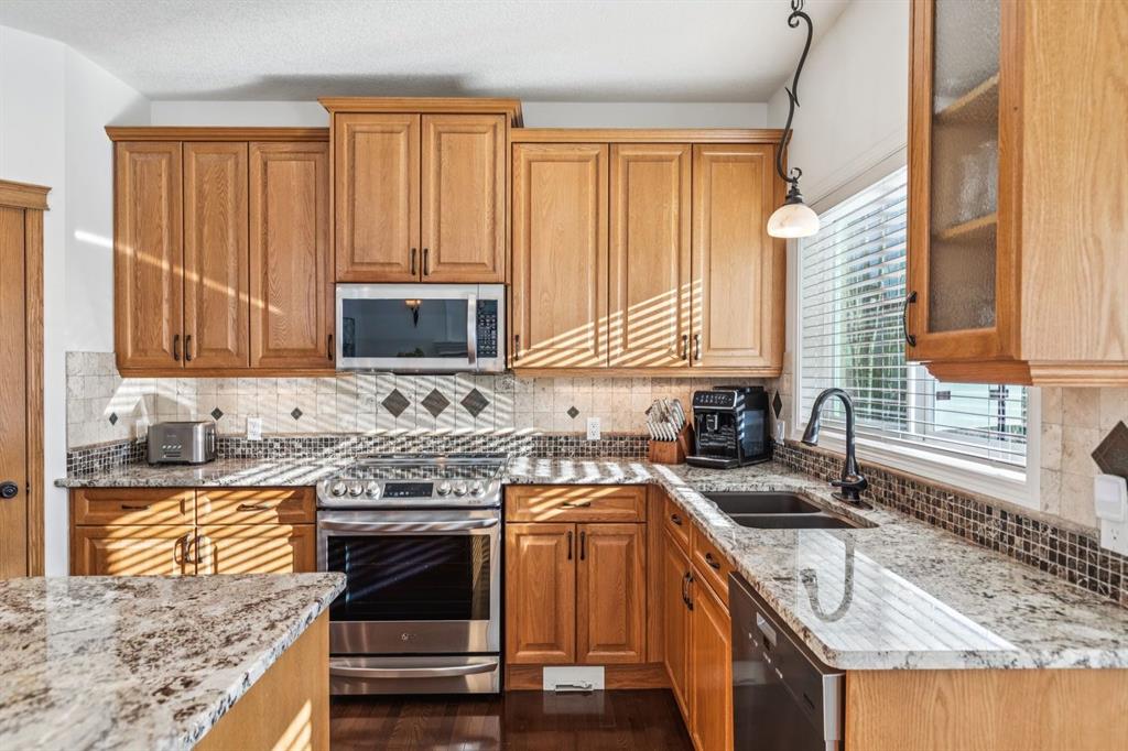 Prepare to be captivated by this stunning home that blends timeless elegance with quality craftsmanship in the sought-after Evercreek Bluffs community. Arriving here feels like a true escape from the city while still being minutes from the natural beauty of Fish Creek Provincial Park. This prestigious location offers the perfect balance of peaceful surroundings and convenient city living. Meticulously maintained, this home offers over 2,270 sqft above grade plus a fully developed walkout basement, totalling 4 bedrooms and 3.5 bathrooms. Thoughtful updates and functional design elevate the traditional floor plan into a modern family home. Expansive south-facing windows (majority recently upgraded to triple-pane) and soaring vaulted ceilings fill the home with abundant natural light. The formal living room sits to the left of the front entrance and flows seamlessly into the formal dining area, ideal for entertaining. At the back of the home lies the true heart of the space: warm and inviting family room featuring a cozy gas fireplace, bright dining nook, and well-appointed kitchen complete with an oversized island, granite countertops, quality oak cabinetry, and stainless steel appliances. Step outside to the south-facing deck, perfect for hosting family and friends or enjoying quiet evenings beneath the pergola. The main floor is completed by a versatile den/office, powder room and functional mudroom. Upstairs, the spacious primary retreat includes a cozy sitting area – perfect for relaxing with a favourite book – along with a spa-inspired ensuite featuring dual sinks, soaker tub, separate shower, and private water closet. The walk-in closet includes extensive built-in organizers. Two additional bedrooms are located on the opposite side of the upper level with 4-piece bathroom between the rooms. The walkout basement features in-floor heating within the concrete slab and offers an oversized rec room ideal for movie nights and games, an additional bedroom, gym/hobby room, and a beautifully designed laundry space.