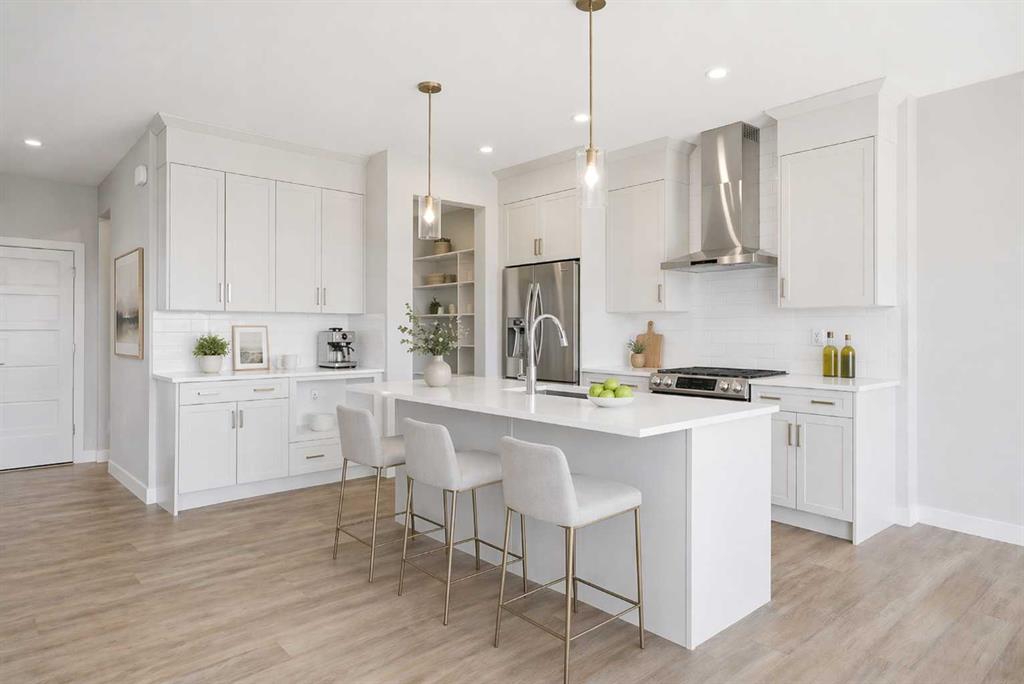 Step inside to a bright and inviting main floor featuring 9’ ceilings, extra wide plank flooring, and a stunning upgraded gel-stained front door with a full glass pane that floods the space with natural light. The kitchen is truly the heart of the home, complete with quartz countertops, designer cabinetry to the ceiling with elegant gold accents, and a spacious pantry for added convenience.