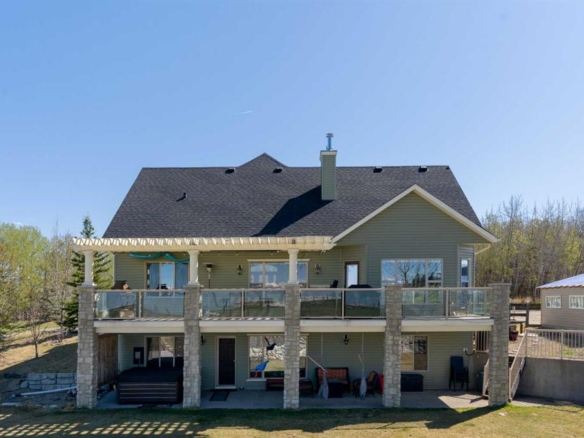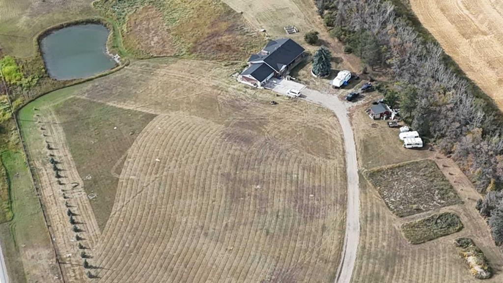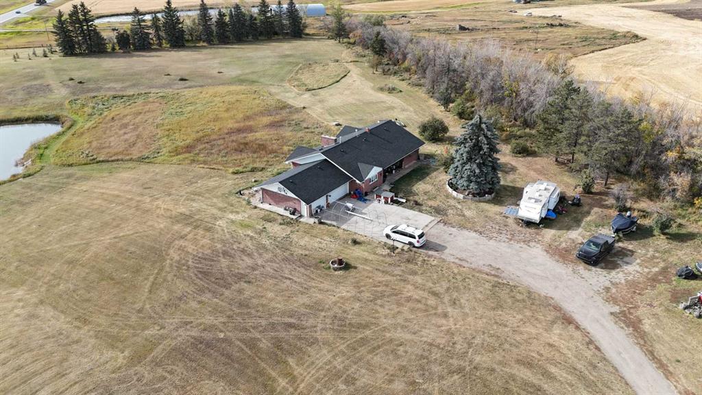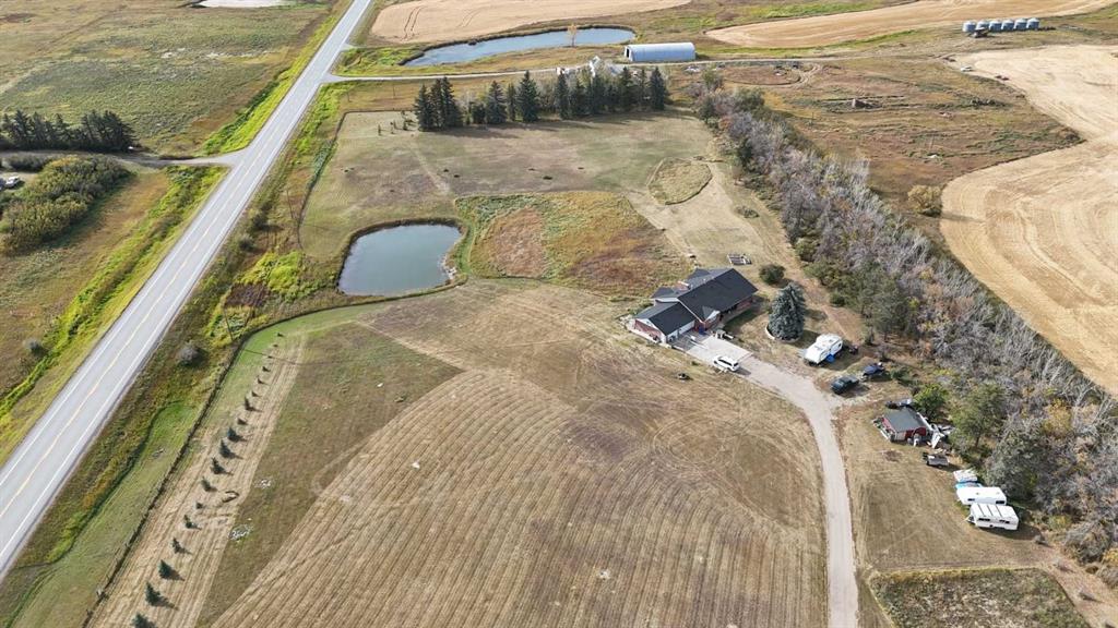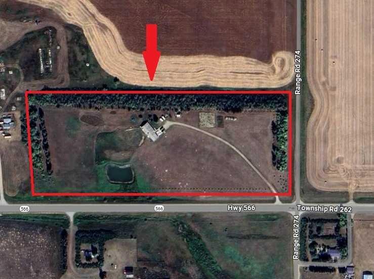 Experience the space, privacy, and opportunity of country living on this exceptional 15.32-acre property just east of Balzac. Perfectly positioned at the corner of Highway 566 and Range Road 274, the property offers outstanding highway frontage on paved Highway 566 while maintaining the peaceful setting of a private rural acreage. With quick access to major routes—just 13 minutes to Balzac and the QEII, 2 minutes to Kathryn, and an easy drive to CrossIron Mills and Highway 9—this location provides the ideal balance of rural lifestyle and convenience. The acreage itself is beautifully established and thoughtfully laid out. A long private driveway and gated entrance lead into a mature, tree-sheltered yard where a thick shelterbelt along the north, east, and west boundaries provides exceptional wind protection and privacy. Expansive lawns, scattered apple and ornamental trees, and open green space create a picturesque setting perfect for outdoor living, gardening, or simply enjoying the quiet of country life. A spring-fed dugout pond adds both beauty and function to the property and may support fish, while the large open yard behind the home offers excellent space for equipment, recreational vehicles, or future improvements.