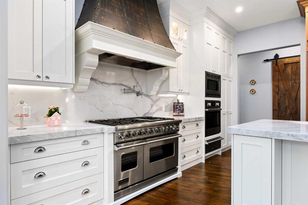 At the heart of the home, the kitchen is both striking and functional. A substantial gas range with grill and copper hood anchors the space, complemented by a built-in wall oven, warming drawer, and full-size refrigerator and freezer wrapped in custom maple-stained cabinetry. The oversized island becomes a natural gathering place, equally suited to quiet morning coffee or elegant entertaining, while a well-appointed butler’s pantry with sink provides additional prep space, generous storage, and seamless flow for hosting.