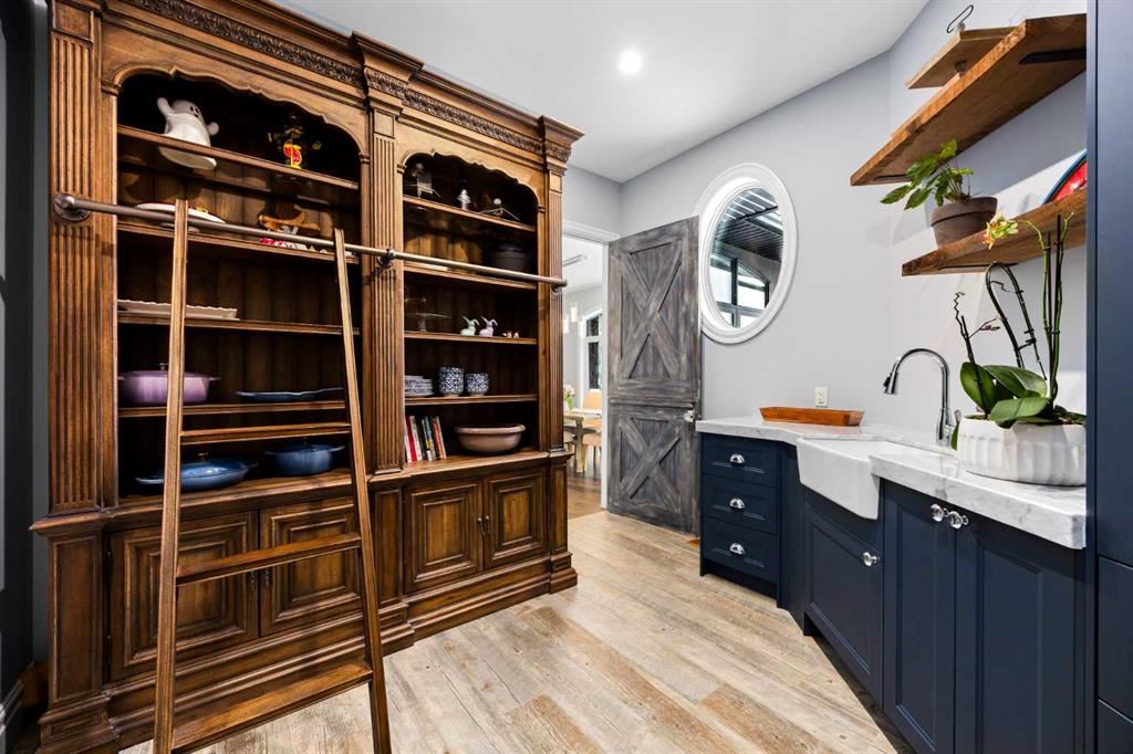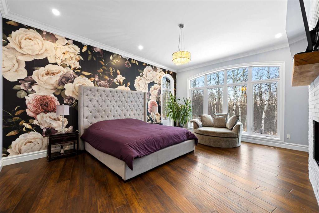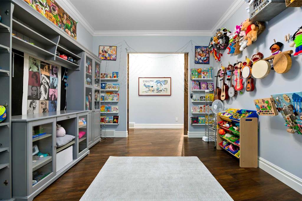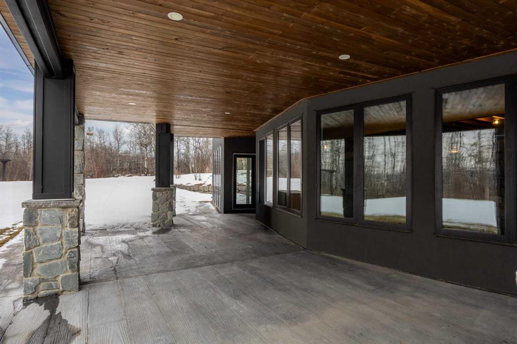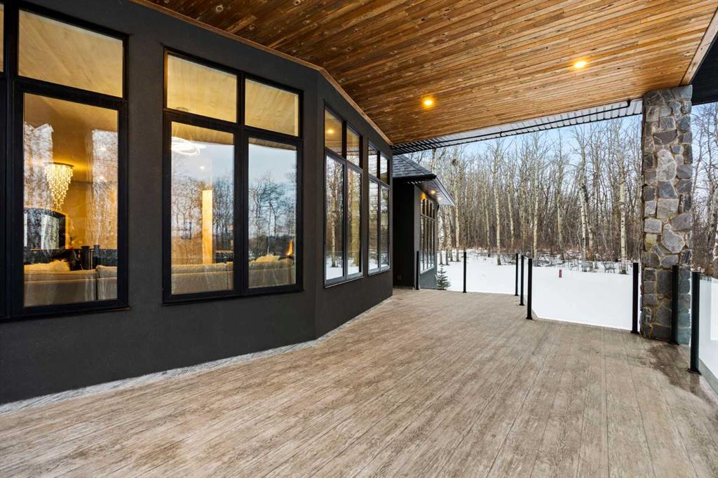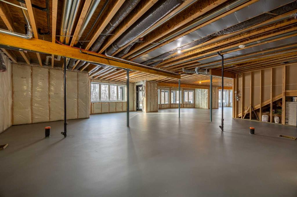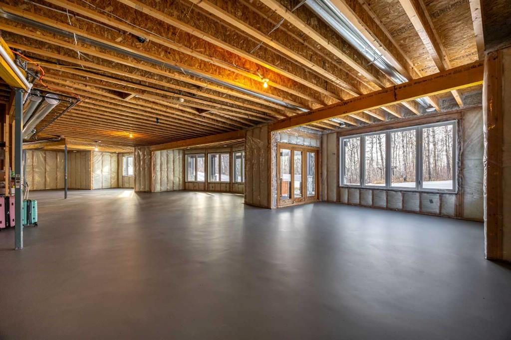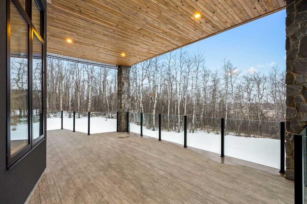 The primary suite offers a retreat within the home. Enter through double doors to a serene space warmed by a gas fireplace framed in sandblasted Italian marble, with windows overlooking the aspen canopy beyond. The ensuite feels reminiscent of a private spa, finished in marble tile with a deep soaker tub beside an oversized picture window, a walk-in glass-enclosed shower, dual vanities, and an expansive walk-in closet with illuminated built-in cabinetry. Direct access to the stunning covered rear deck invites relaxed moments outdoors beneath open prairie skies—an inviting place to unwind and take in the surrounding landscape. The walkout lower level presents an opportunity to expand the estate further, offering ten-foot ceilings, rough-ins for three additional bathrooms, a separate furnace, and access to a stamped concrete patio with pine ceiling and recessed lighting. A dedicated podcast studio is already in place, ideal for entrepreneurs, executives, or creators seeking a private professional space at home.