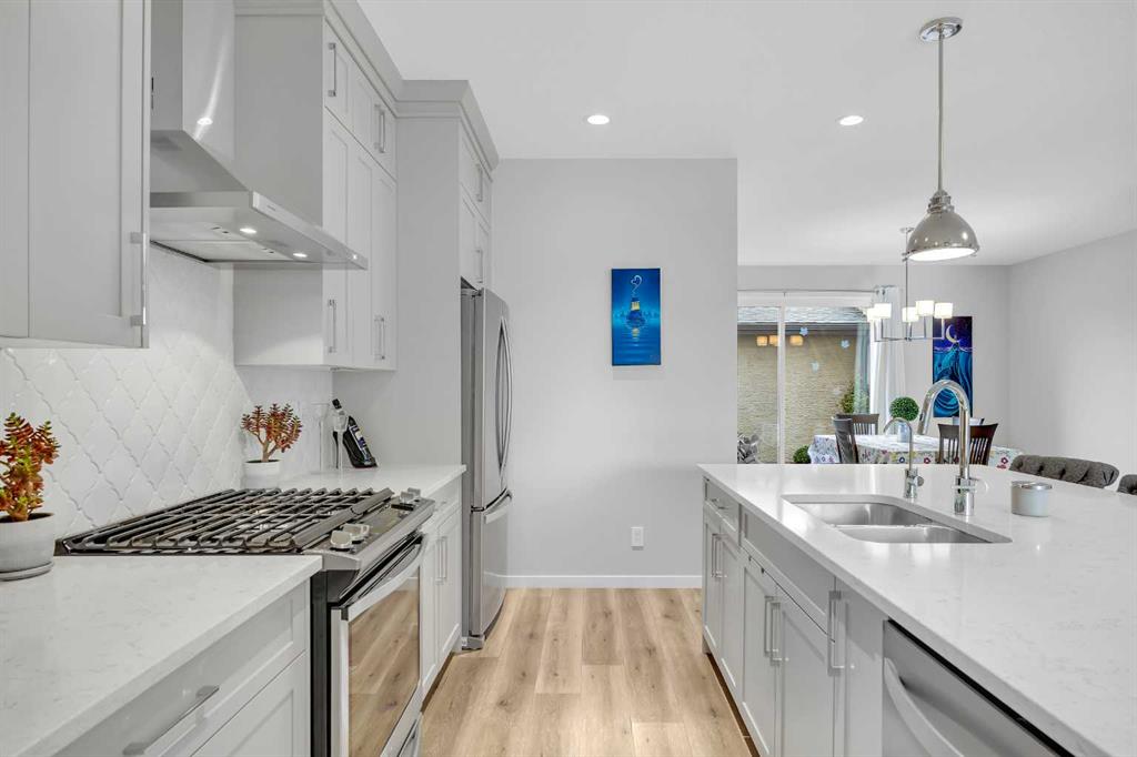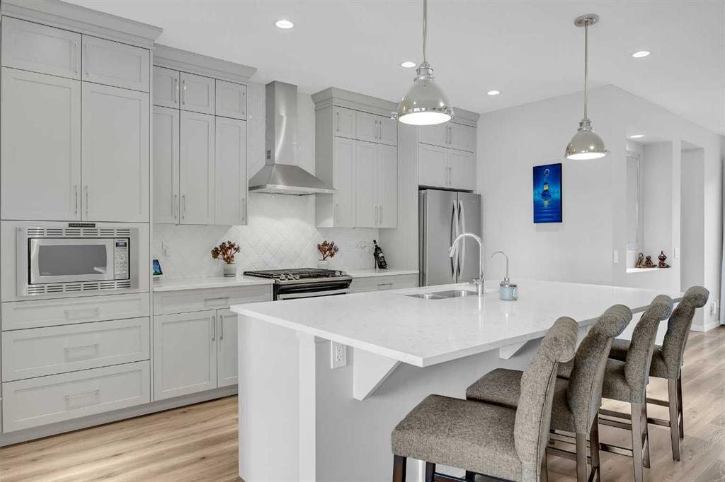 The main floor is bright and inviting, featuring oversized triple-pane windows, 9 ft. ceilings, and luxury vinyl plank flooring throughout. The stunning kitchen sits at the heart of the home and showcases extended Pewter cabinetry with soft-close doors and drawers, stainless steel appliances (including a built-in microwave and chimney hood fan), quartz countertops, and a large center island perfect for gathering with family and friends. A BBQ gas line adds convenience for outdoor entertaining.
