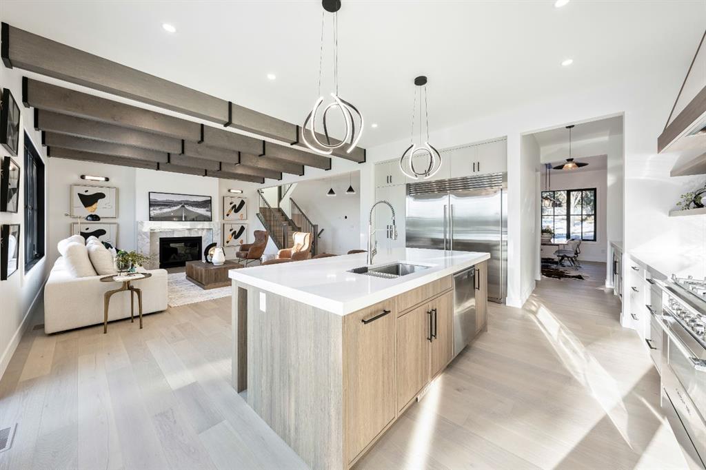 Stunning and unique best describes this modern masterpiece built by Elite Urban Concepts that draws inspirations from the wineries of California with a modern flair that checks all the boxes on one’s wish list. With over 4800 square feet of developed space and a fully finished walkout basement, there is plenty of room for a family, entertaining, working from home or relaxing on the weekends. With an open floor concept, you are immediately welcomed with hardwood floors that are complimented with the tall ceilings adorned with open beams in the living room and, tons of natural light from the abundant black cased windows. A large chef inspired kitchen that features beautiful hood fan as the centerpiece, accented with stainless-steel appliances, a separate butler pantry and, large custom wood cabinets that opens to a massive upper deck overlooking the backyard with a mountain view. Upstairs is perfect for family living with a bonus room that is central to an upper laundry room, two bedrooms and, a primary bedroom all of which have their own ensuites. Yes, you read that right, each upstairs bedroom has its own private ensuite. The primary bedroom is enormous with tons of natural light, vaulted ceilings with open beams, a view of the mountains and, a custom walk-in closet that will accommodate anyone’s needs. The beautifully crafted master ensuite features a spa like experience with large tile, wood accents, a soaker tub and a twinned shower that rivals a high-end hotel. The walkout basement is custom built for entertainment with tall ceilings accented with open beams, a custom-built stylish bar and a huge family room that has double French doors to the lower covered patio and fenced backyard, for that indoor outdoor flow. The additional open style room allows for your home gym that will take advantage of the natural light. The basement mudroom has an abundant amount of storage that leads out to the attached garage. The triple garage is large enough for your vehicles and toys. This beautiful gem in the heart of Charleswood is the perfect location, across from a park overlooked by Nose Hill Park, the location is perfect.