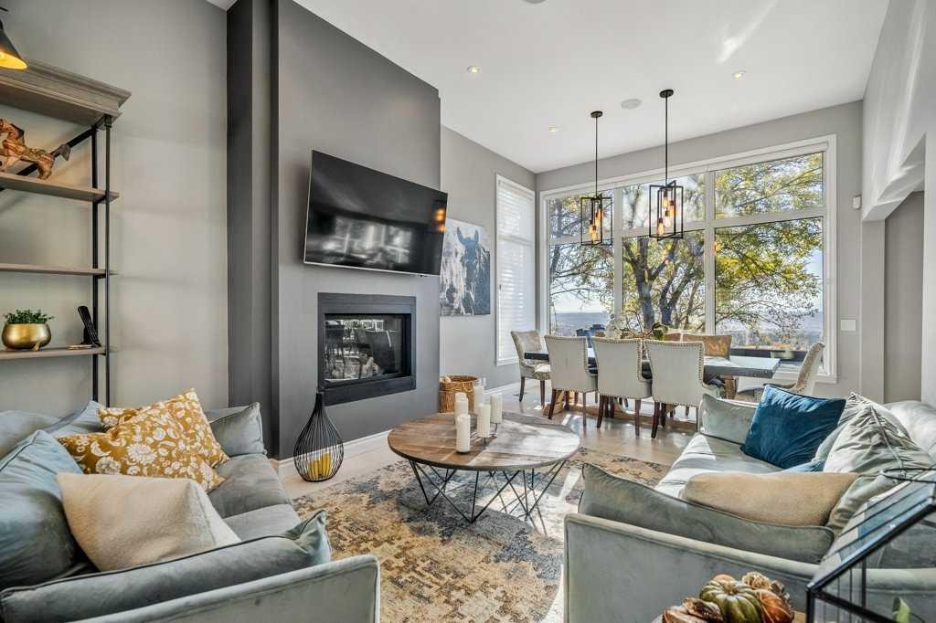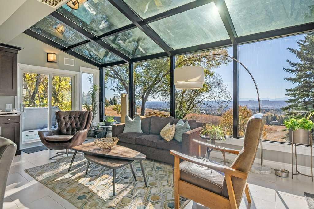 Perched on the sought-after Edgemont Ridge and backing directly onto an off-leash park, this impeccably renovated executive residence offers nearly 5,000 sq ft of luxurious living space, perfectly blending comfort, elegance, and cutting-edge technology. Meticulously upgraded with over $500,000 in premium enhancements, this luxury home combines modern innovation with timeless craftsmanship. A $140K Elan Smart Home Automation system with CAT 5 wiring, integrated temperature, media and security from any device sets the stage for effortless living. The impressive open-to-above foyer introduces elegant flow through the vaulted living room, where a sleek gas fireplace sets a sophisticated tone. Oversized windows in the adjoining dining area frame endless south and west-facing vistas, while designer lighting creates a refined backdrop for entertaining. The chef’s kitchen is a true centerpiece, blending luxury & function with granite countertops, high-end cabinetry, Sub-Zero & Wolf appliances, Miele built-in coffee maker, Asko dishwasher & an expansive island ideal for entertaining. A sunroom encased in glass brings the outdoors in, capturing panoramic ridge views year-round. This newly renovated space features heated floors & modern windows for year-round comfort, while patio doors extend living to the upper BBQ deck with glass railings & natural gas hookup for entertaining. A stylish den with its own gas fireplace creates a serene home office. Completing the main level are a custom mudroom with storage lockers, laundry with ample storage & a sink & a handy powder room. Upstairs, a skylit hallway leads to the serene primary retreat where corner windows showcase sweeping views. A custom California Closet & spa-inspired 5-piece ensuite with in-floor heat, deep soaker tub, dual vanities & oversized rain shower enhance daily indulgence. A second bedroom enjoys its own private 3-piece ensuite, while two additional bedrooms share access to another full bathroom. Gather in the rec room in the walkout basement & enjoy family movies & games nights. A luxurious guest suite features in-floor heating, a gas fireplace, 3-piece ensuite, walk-in closet & direct patio access creating a spa-like retreat. A dedicated gym & an additional full bathroom add flexibility, while a second laundry area & abundant storage enhance everyday convenience. Outdoor living shines with multiple spaces for relaxation & entertaining, including a hot tub deck for rejuvenating evenings, a covered patio from the walkout level & an expansive yard with a custom-built treehouse surrounded by unforgettable views. Additional highlights include a heated triple car garage with epoxy floors, built-in speakers on all three levels, upgraded Hunter Douglas blinds & a durable clay tile roof. Ideally positioned on the Edgemont ridge with quick access to Nose Hill Park, top-rated schools, shopping & transit, this home balances timeless design with modern luxury in one of northwest Calgary’s most coveted locations!