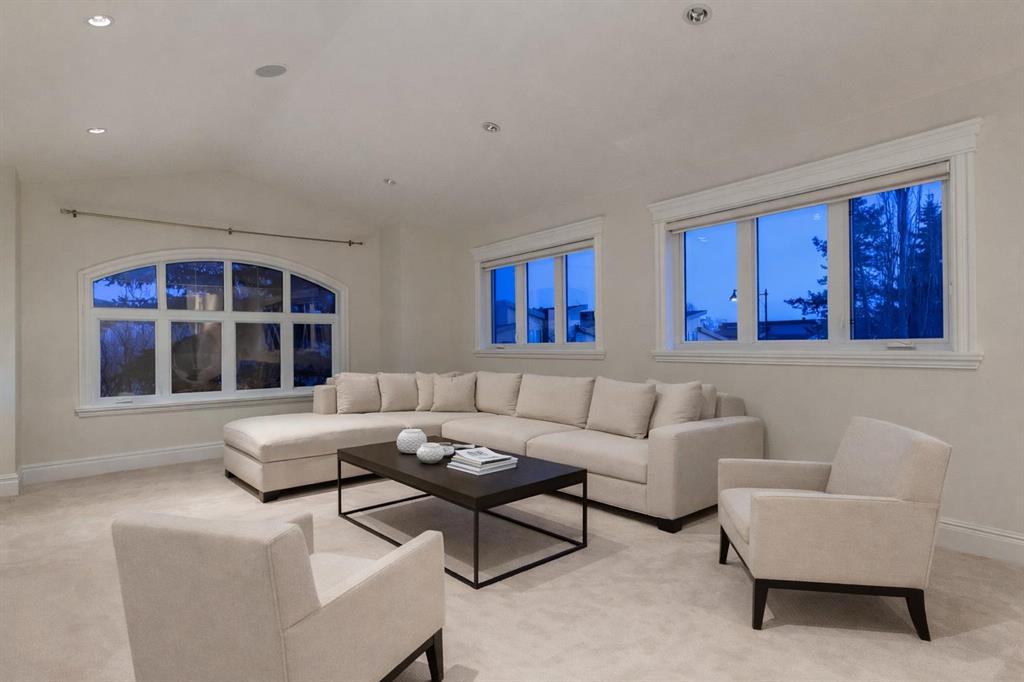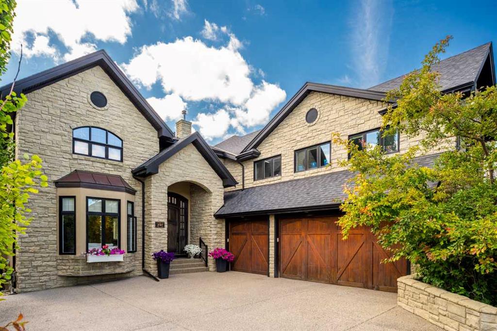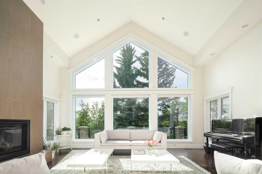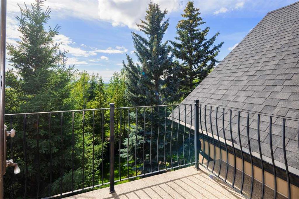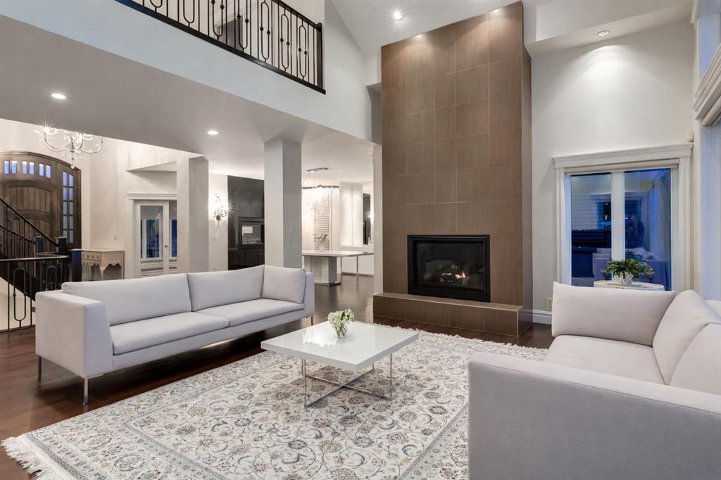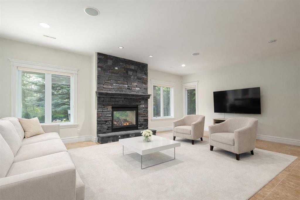 Balanced with natural light, this beautifully crafted family home captures breathtaking West-facing views of the Rocky Mountains, set against a serene, tree-lined backdrop. A timeless custom maple front door creates a warm first impression, complemented by natural stone detailing. Thoughtfully designed with custom-built cabinetry throughout, the home blends elegance with everyday functionality. Inside, a vaulted sitting room immediately draws the eye. Expansive windows frame the views while a sleek floor-to-ceiling fireplace adds contemporary architectural presence. Just off the foyer, a private executive office with French doors and coffered ceilings connects seamlessly to the formal dining room through a double-sided fireplace. The kitchen features Sub-Zero, Wolf, and Miele appliances and flows into a bright breakfast nook that opens onto the west-facing deck—ideal for alfresco dining. Overlooking the private, treed backyard, the pergola-covered deck includes stairs leading to the spacious yard below. A generous walk-through pantry connects to a fully equipped mudroom with extensive storage, a sink, and access to the triple garage. The grand curved wood staircase leads upstairs to three spacious bedrooms and a large flex room. The primary suite offers a private terrace with sweeping Rocky views, his & her custom closets, and an expansive ensuite with heated floors, his & her vanities, and a dedicated vanity area. Above the garage, the inviting flex room features its own fireplace and ample space for media & games. Two additional bedrooms share a 5-piece Jack-and-Jill bathroom with a double vanity, ideal for siblings. A well-appointed laundry room with built-in cabinetry, a sink, and hanging space completes the upper level. The fully developed walkout basement features travertine flooring and radiant in-floor heating throughout. A double-sided fireplace connects the interior family room to the covered exterior deck. This level is designed for versatility, offering a theatre room, bright home gym, additional bedroom, and a 4-piece bath with a steam shower. With a wet bar and private backyard access from two points, the lower-level functions beautifully as a retreat for growing or multigenerational families. Ideally located near Calgary’s top private and public schools—including Rundle College, Webber Academy, and Ernest Manning High School—this home also offers quick access to Westside Rec Centre, Aspen Landing Shopping Centre, and Highway 1 for easy escapes to Banff.