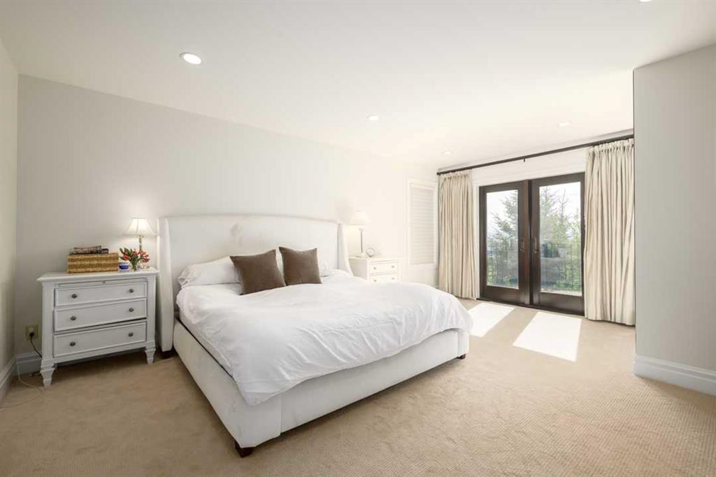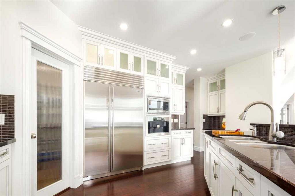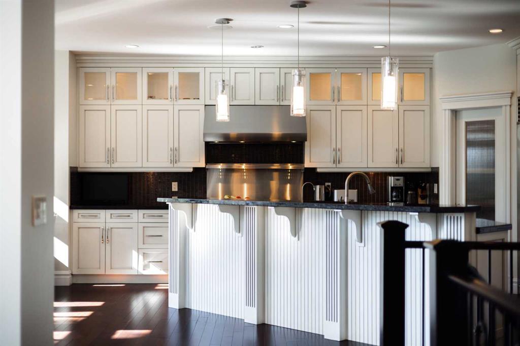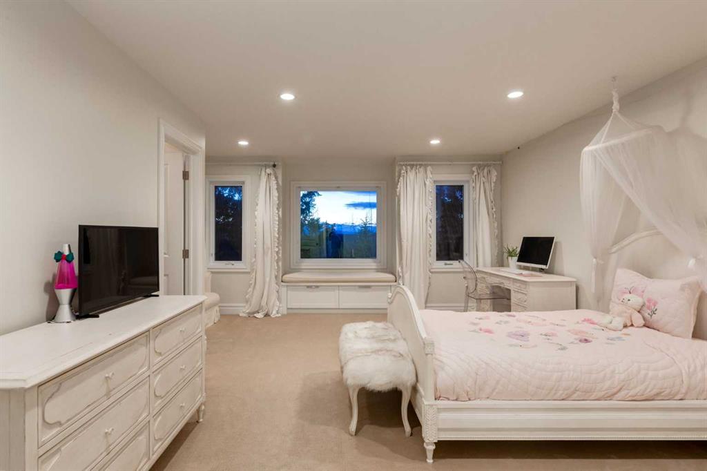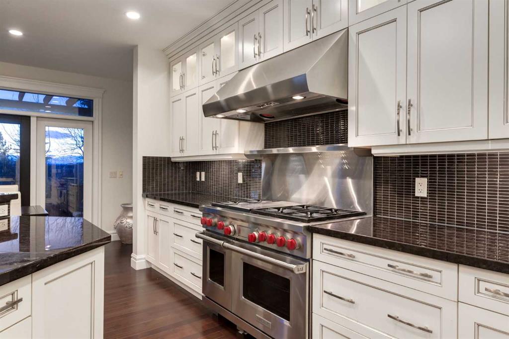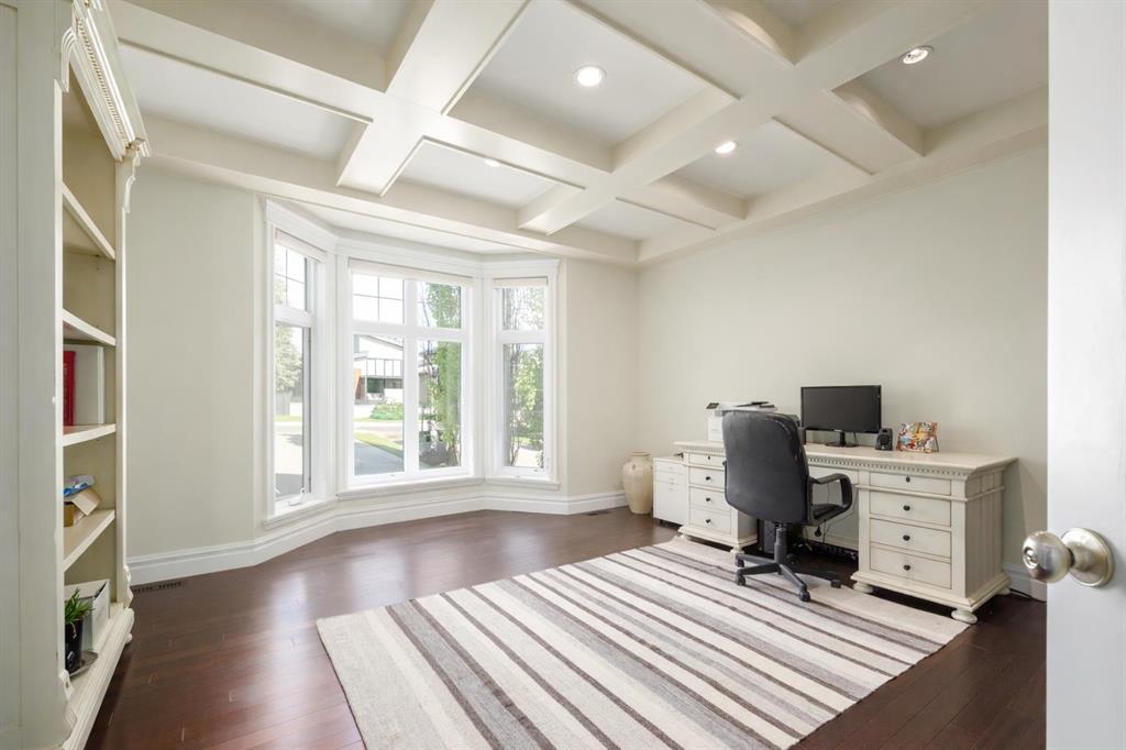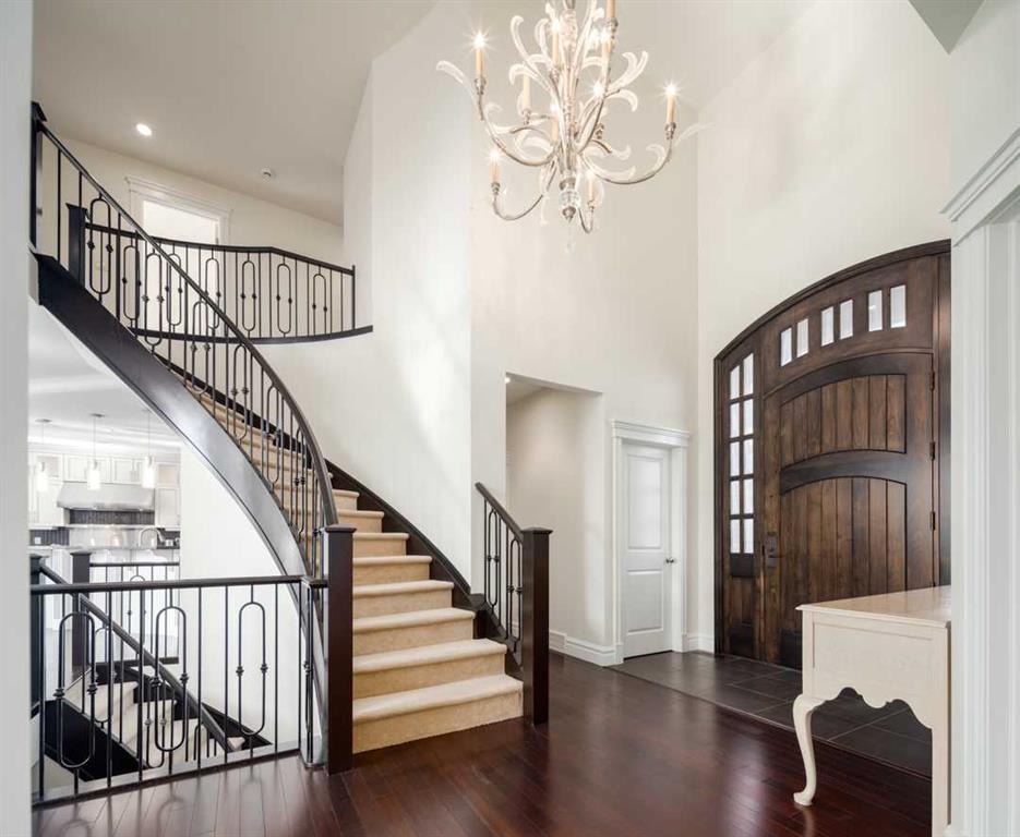 Balanced with natural light, this beautifully crafted family home captures breathtaking West-facing views of the Rocky Mountains, set against a serene, tree-lined backdrop. A timeless custom maple front door creates a warm first impression, complemented by natural stone detailing. Thoughtfully designed with custom-built cabinetry throughout, the home blends elegance with everyday functionality. Inside, a vaulted sitting room immediately draws the eye. Expansive windows frame the views while a sleek floor-to-ceiling fireplace adds contemporary architectural presence. Just off the foyer, a private executive office with French doors and coffered ceilings connects seamlessly to the formal dining room through a double-sided fireplace. The kitchen features Sub-Zero, Wolf, and Miele appliances and flows into a bright breakfast nook that opens onto the west-facing deck—ideal for alfresco dining. Overlooking the private, treed backyard, the pergola-covered deck includes stairs leading to the spacious yard below. A generous walk-through pantry connects to a fully equipped mudroom with extensive storage, a sink, and access to the triple garage. The grand curved wood staircase leads upstairs to three spacious bedrooms and a large flex room. The primary suite offers a private terrace with sweeping Rocky views, his & her custom closets, and an expansive ensuite with heated floors, his & her vanities, and a dedicated vanity area. Above the garage, the inviting flex room features its own fireplace and ample space for media & games. Two additional bedrooms share a 5-piece Jack-and-Jill bathroom with a double vanity, ideal for siblings. A well-appointed laundry room with built-in cabinetry, a sink, and hanging space completes the upper level. The fully developed walkout basement features travertine flooring and radiant in-floor heating throughout. A double-sided fireplace connects the interior family room to the covered exterior deck. This level is designed for versatility, offering a theatre room, bright home gym, additional bedroom, and a 4-piece bath with a steam shower. With a wet bar and private backyard access from two points, the lower-level functions beautifully as a retreat for growing or multigenerational families. Ideally located near Calgary’s top private and public schools—including Rundle College, Webber Academy, and Ernest Manning High School—this home also offers quick access to Westside Rec Centre, Aspen Landing Shopping Centre, and Highway 1 for easy escapes to Banff.