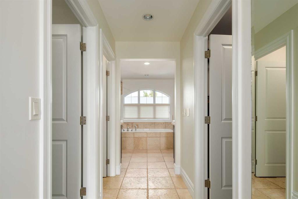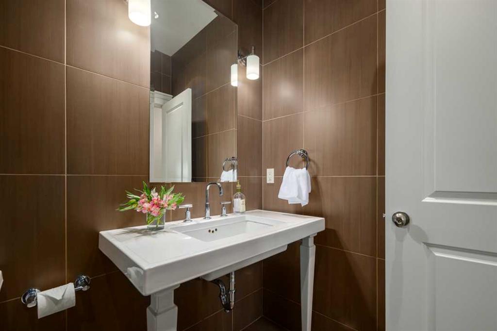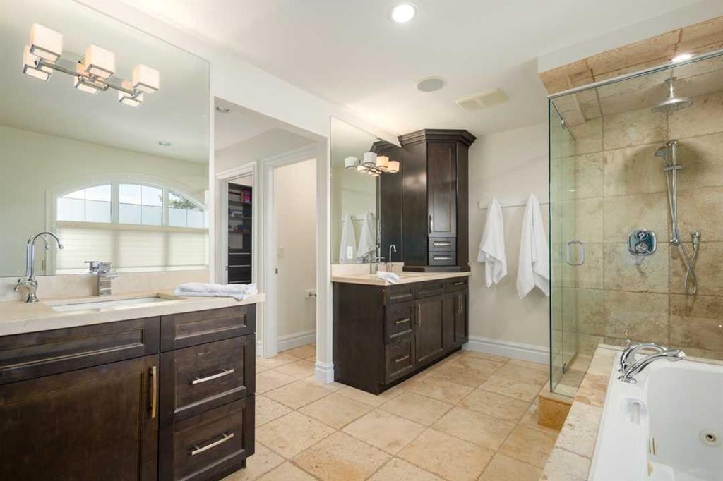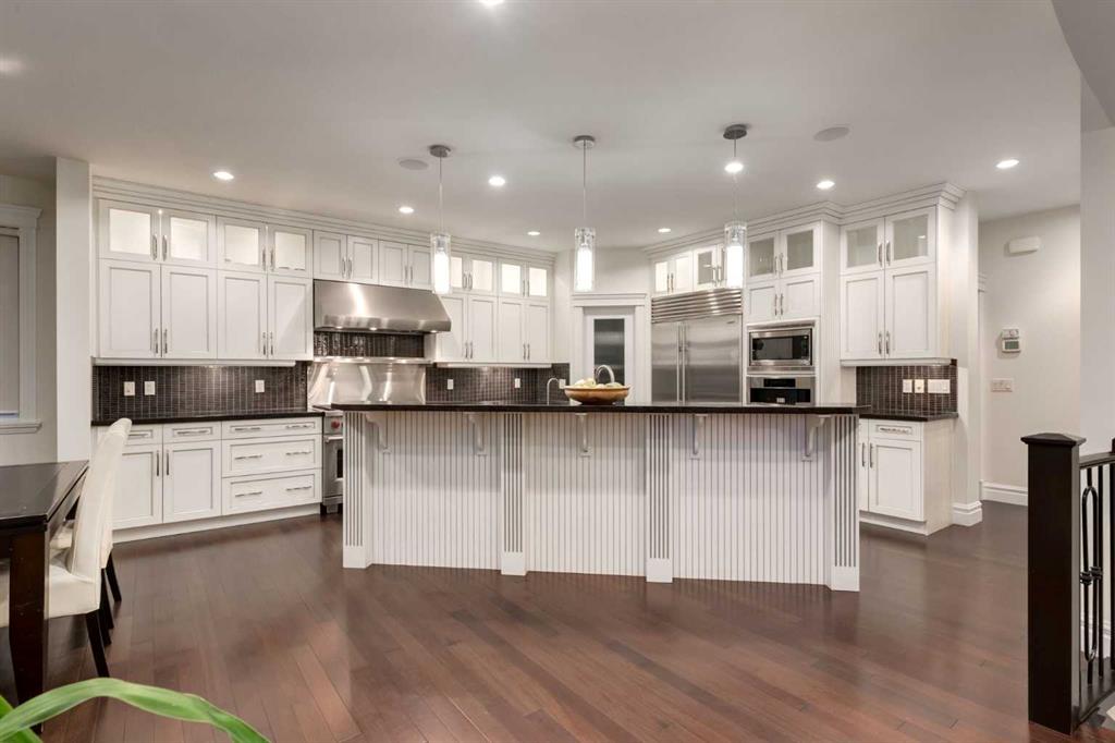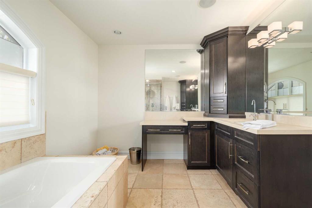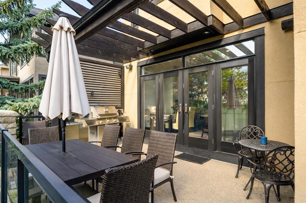 Balanced with natural light, this beautifully crafted family home captures breathtaking West-facing views of the Rocky Mountains, set against a serene, tree-lined backdrop. A timeless custom maple front door creates a warm first impression, complemented by natural stone detailing. Thoughtfully designed with custom-built cabinetry throughout, the home blends elegance with everyday functionality. Inside, a vaulted sitting room immediately draws the eye. Expansive windows frame the views while a sleek floor-to-ceiling fireplace adds contemporary architectural presence. Just off the foyer, a private executive office with French doors and coffered ceilings connects seamlessly to the formal dining room through a double-sided fireplace. The kitchen features Sub-Zero, Wolf, and Miele appliances and flows into a bright breakfast nook that opens onto the west-facing deck—ideal for alfresco dining. Overlooking the private, treed backyard, the pergola-covered deck includes stairs leading to the spacious yard below. A generous walk-through pantry connects to a fully equipped mudroom with extensive storage, a sink, and access to the triple garage. The grand curved wood staircase leads upstairs to three spacious bedrooms and a large flex room. The primary suite offers a private terrace with sweeping Rocky views, his & her custom closets, and an expansive ensuite with heated floors, his & her vanities, and a dedicated vanity area. Above the garage, the inviting flex room features its own fireplace and ample space for media & games. Two additional bedrooms share a 5-piece Jack-and-Jill bathroom with a double vanity, ideal for siblings. A well-appointed laundry room with built-in cabinetry, a sink, and hanging space completes the upper level. The fully developed walkout basement features travertine flooring and radiant in-floor heating throughout. A double-sided fireplace connects the interior family room to the covered exterior deck. This level is designed for versatility, offering a theatre room, bright home gym, additional bedroom, and a 4-piece bath with a steam shower. With a wet bar and private backyard access from two points, the lower-level functions beautifully as a retreat for growing or multigenerational families. Ideally located near Calgary’s top private and public schools—including Rundle College, Webber Academy, and Ernest Manning High School—this home also offers quick access to Westside Rec Centre, Aspen Landing Shopping Centre, and Highway 1 for easy escapes to Banff.