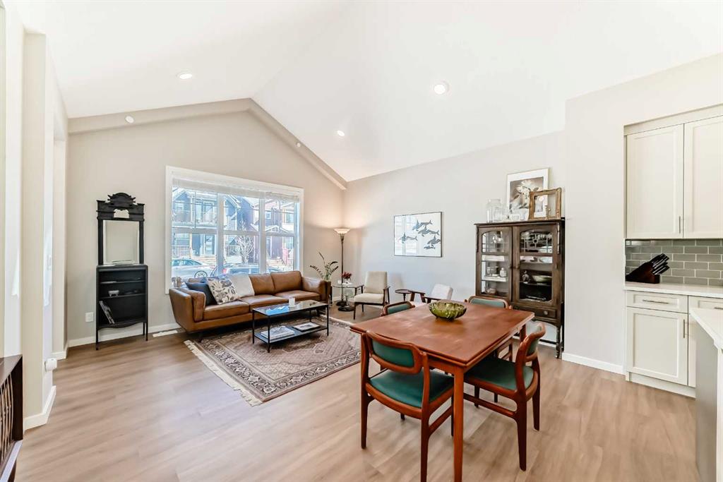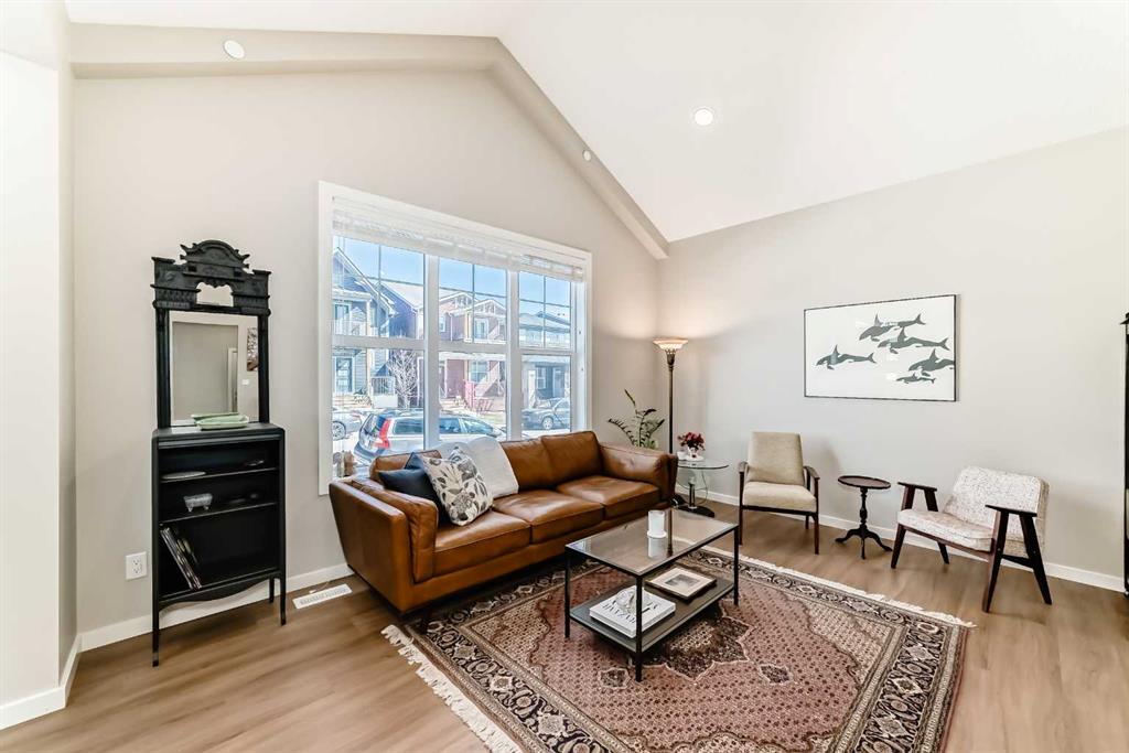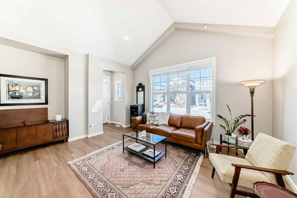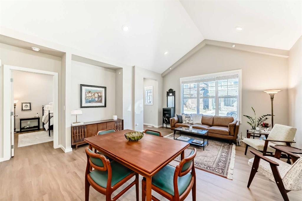 Welcome to this maintenance-free townhouse bungalow in the desirable community of Livingston. This stunning home offers over 1800 sq ft of living space, all professionally developed by the builder. The home features grand vaulted ceilings throughout the living, dining and kitchen area, luxury vinyl plank flooring and upgraded stainless steel appliances. The spacious living room features a large window that allows in plenty of natural light. The expansive kitchen features upgraded two-tone cabinetry, a large island with breakfast bar and an adjacent dining area. The home offers a main floor den currently being used as a pantry. Relax in the spacious primary bedroom with a luxurious ensuite bathroom featuring an upgraded walk-in shower with glass enclosure and a large walk-in closet. A conveniently located powder room, closet, mud room and door to access the single car garage, completes the main floor. The lower level features 9 foot ceilings, spacious family room with enough extra space for a home office, a large second bedroom with a walk-in closet, a four piece bathroom and a laundry/utility room. Enjoy living in the community of Livingston with nearby shopping, restaurants and easy access to public transit stops and Stoney Trail.