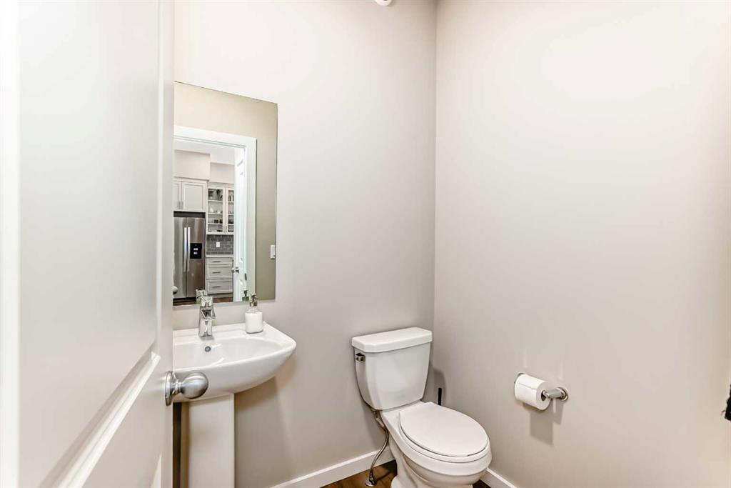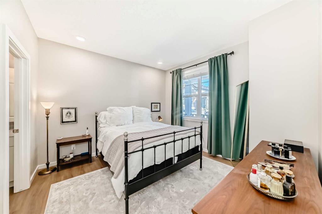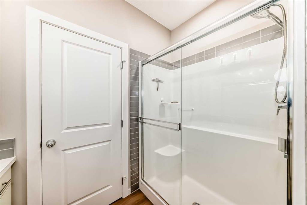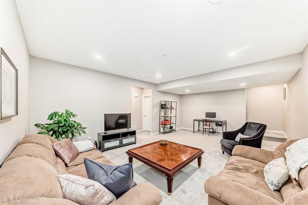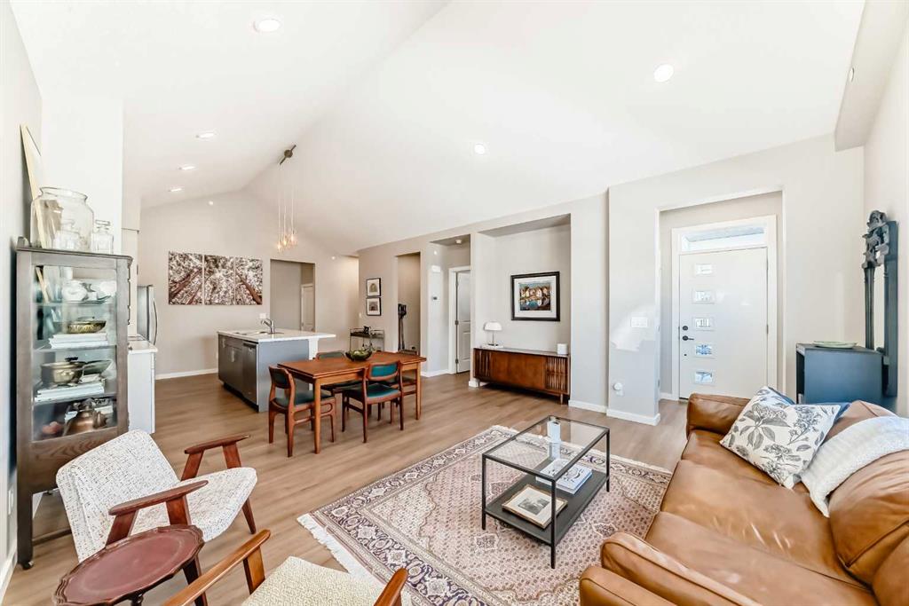 Welcome to this maintenance-free townhouse bungalow in the desirable community of Livingston. This stunning home offers over 1800 sq ft of living space, all professionally developed by the builder. The home features grand vaulted ceilings throughout the living, dining and kitchen area, luxury vinyl plank flooring and upgraded stainless steel appliances. The spacious living room features a large window that allows in plenty of natural light. The expansive kitchen features upgraded two-tone cabinetry, a large island with breakfast bar and an adjacent dining area. The home offers a main floor den currently being used as a pantry. Relax in the spacious primary bedroom with a luxurious ensuite bathroom featuring an upgraded walk-in shower with glass enclosure and a large walk-in closet. A conveniently located powder room, closet, mud room and door to access the single car garage, completes the main floor. The lower level features 9 foot ceilings, spacious family room with enough extra space for a home office, a large second bedroom with a walk-in closet, a four piece bathroom and a laundry/utility room. Enjoy living in the community of Livingston with nearby shopping, restaurants and easy access to public transit stops and Stoney Trail.