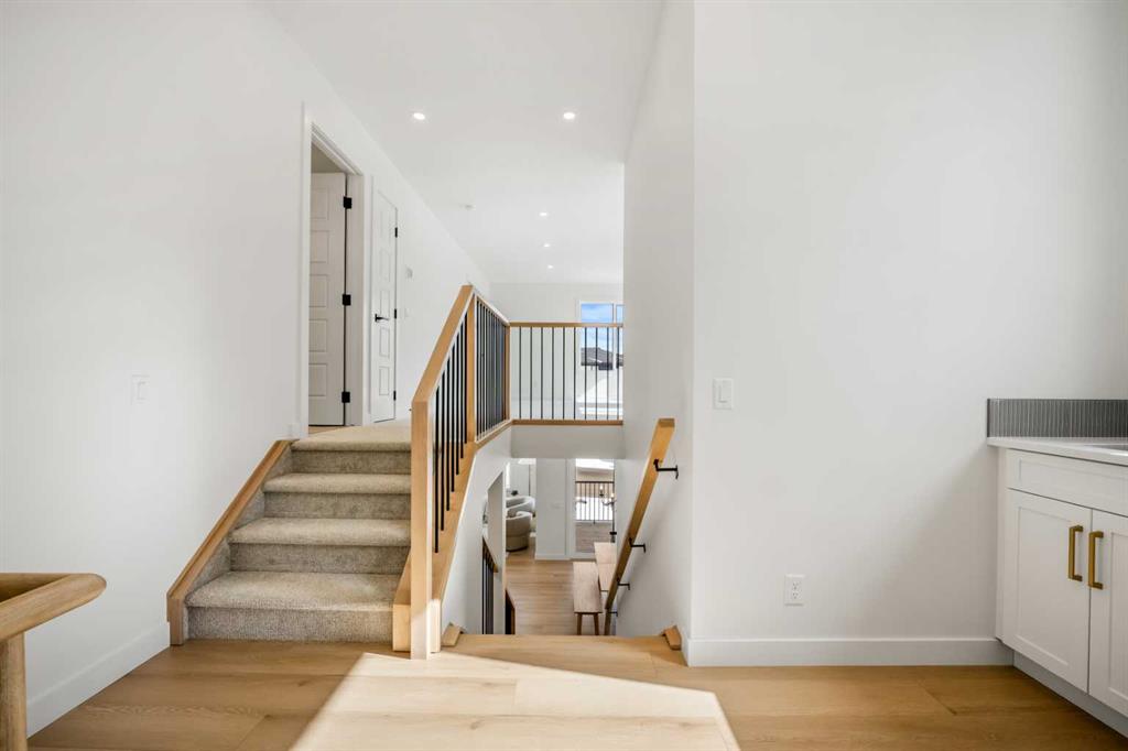 The staggered split design creates distinct yet connected living zones, enhancing both privacy and flow. The main living level presents an open-concept kitchen, dining area, and great room filled with natural light from expansive Energy Star rated Low-E windows. Quartz countertops, custom painted MDF cabinetry with soft-close doors and drawers, a full-height tile backsplash, and a Blanco Horizon sink paired with a Delta Trinsic faucet create a kitchen that is both functional and visually refined. Luxury vinyl plank flooring, 11 LED pot lights, and a contemporary Napoleon Element fireplace add warmth and modern character throughout the main living spaces.