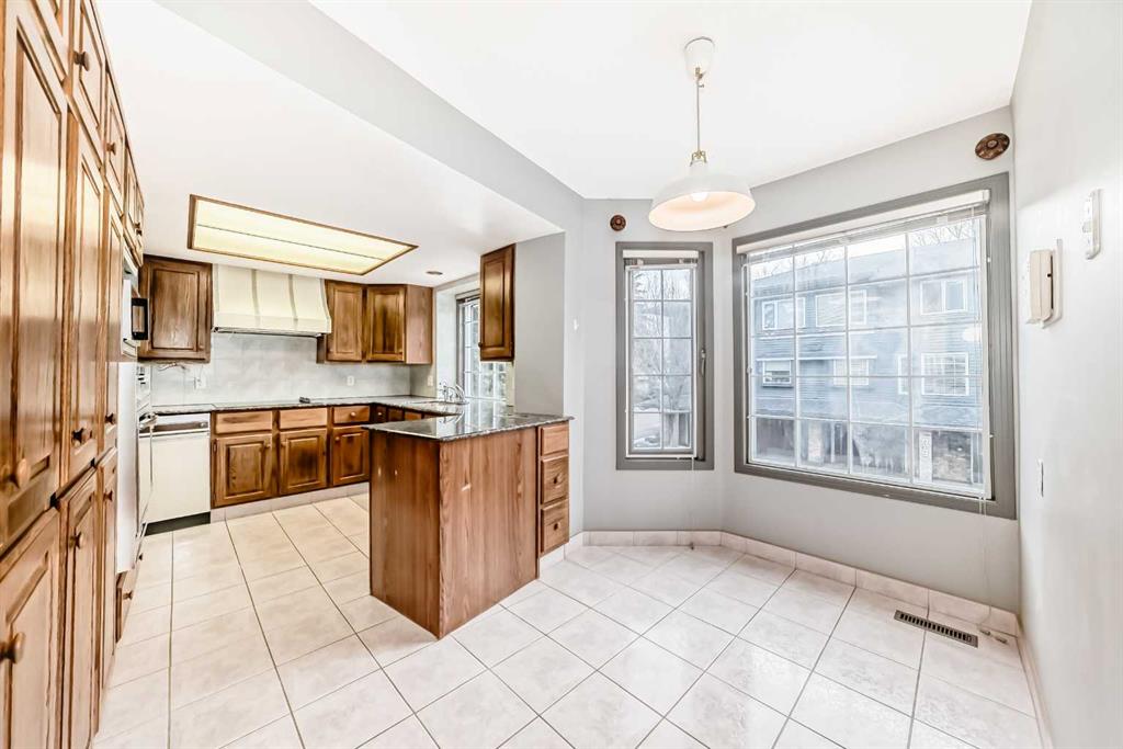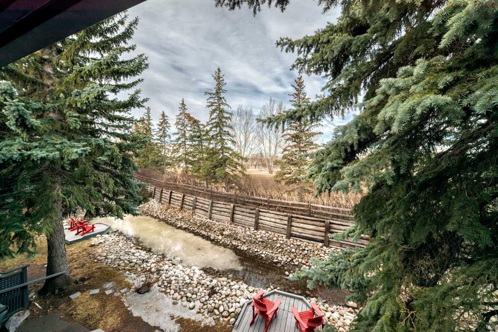 Nestled in the highly sought-after community of Varsity, this well maintained townhome is surrounded with mature trees and back onto a rare pond with tranquil green space views. Boasting a dramatic 10-foot ceiling in the living room, expansive windows, and stylish laminate flooring, the home is bright, airy, and inviting throughout. The spacious living room features a cozy wood-burning fireplace and provides direct access to the backyard with decks and red Adirondack chairs overlooking the pond. A formal dining area with a built-in wet bar enhances the home’s entertaining appeal.